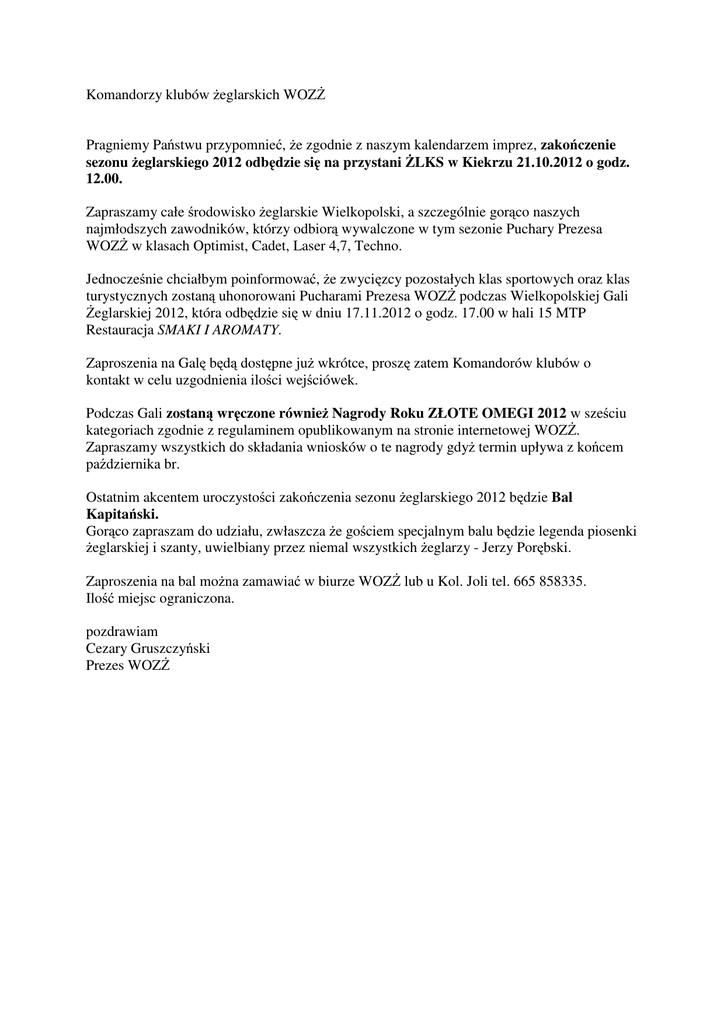 Komandorzy klubów Ŝeglarskich WOZś Pragniemy Państwu przypomnieć, Ŝe zgodnie z naszym kalendarzem imprez, zakończenie sezonu Ŝeglarskiego 2012 odbędzie się na przystani śLKS w Kiekrzu 21.10.2012 o godz. 12.00. Zapraszamy całe środowisko Ŝeglarskie Wielkopolski, a szczególnie gorąco naszych najmłodszych zawodników, którzy odbiorą wywalczone w tym sezonie Puchary Prezesa WOZś w klasach Optimist, Cadet, Laser 4,7, Techno. Jednocześnie chciałbym poinformować, Ŝe zwycięzcy pozostałych klas sportowych oraz klas turystycznych zostaną uhonorowani Pucharami Prezesa WOZś podczas Wielkopolskiej Gali śeglarskiej 2012, która odbędzie się w dniu 17.11.2012 o godz. 17.00 w hali 15 MTP Restauracja SMAKI I AROMATY. Zaproszenia na Galę będą dostępne juŜ wkrótce, proszę zatem Komandorów klubów o kontakt w celu uzgodnienia ilości wejściówek. Podczas Gali zostaną wręczone równieŜ Nagrody Roku ZŁOTE OMEGI 2012 w sześciu kategoriach zgodnie z regulaminem opublikowanym na stronie internetowej WOZś. Zapraszamy wszystkich do składania wniosków o te nagrody gdyŜ termin upływa z końcem października br. Ostatnim akcentem uroczystości zakończenia sezonu Ŝeglarskiego 2012 będzie Bal Kapitański. Gorąco zapraszam do udziału, zwłaszcza Ŝe gościem specjalnym balu będzie legenda piosenki Ŝeglarskiej i szanty, uwielbiany przez niemal wszystkich Ŝeglarzy - Jerzy Porębski. Zaproszenia na bal moŜna zamawiać w biurze WOZś lub u Kol. Joli tel. 665 858335. Ilość miejsc ograniczona. pozdrawiam Cezary Gruszczyński Prezes WOZś