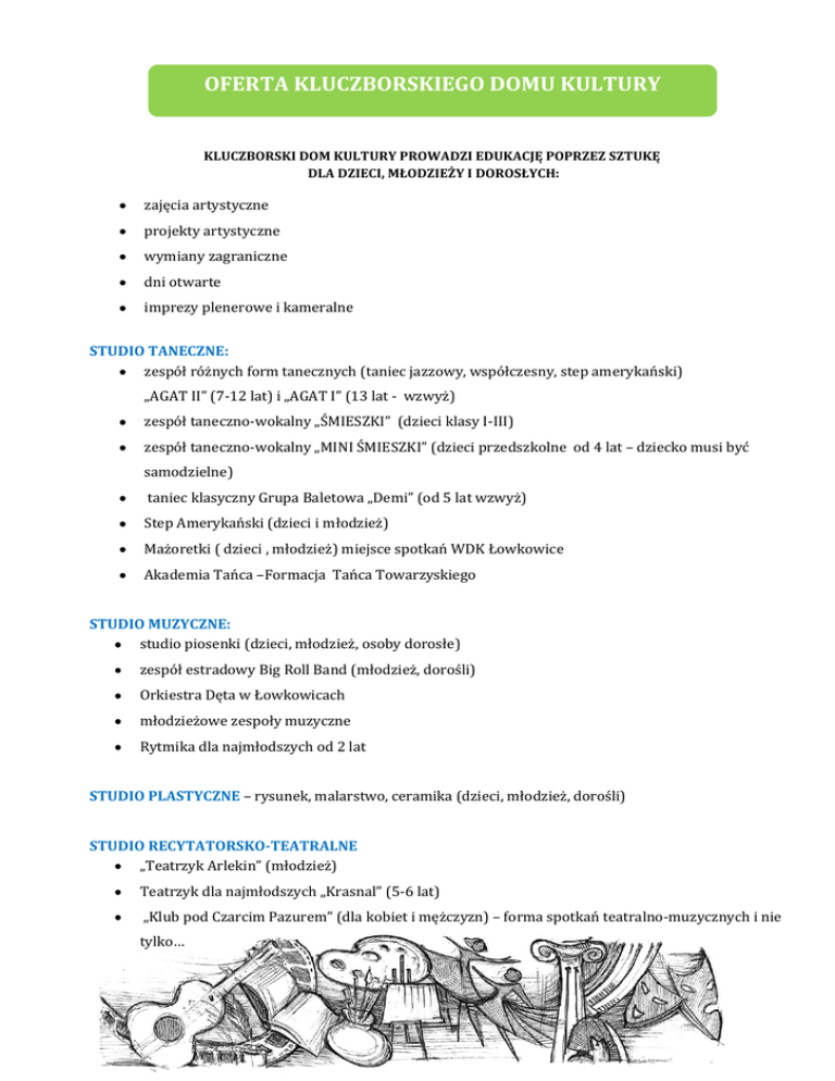 OFERTA KLUCZBORSKIEGO DOMU KULTURY KLUCZBORSKI DOM KULTURY PROWADZI EDUKACJĘ POPRZEZ SZTUKĘ DLA DZIECI, MŁODZIEŻY I DOROSŁYCH: zajęcia artystyczne projekty artystyczne wymiany zagraniczne dni otwarte imprezy plenerowe i kameralne STUDIO TANECZNE: zespół różnych form tanecznych (taniec jazzowy, współczesny, step amerykański) „AGAT II” (7-12 lat) i „AGAT I” (13 lat - wzwyż) zespół taneczno-wokalny „ŚMIESZKI” (dzieci klasy I-III) zespół taneczno-wokalny „MINI ŚMIESZKI” (dzieci przedszkolne od 4 lat – dziecko musi być samodzielne) taniec klasyczny Grupa Baletowa „Demi” (od 5 lat wzwyż) Step Amerykański (dzieci i młodzież) Mażoretki ( dzieci , młodzież) miejsce spotkań WDK Łowkowice Akademia Tańca –Formacja Tańca Towarzyskiego STUDIO MUZYCZNE: studio piosenki (dzieci, młodzież, osoby dorosłe) zespół estradowy Big Roll Band (młodzież, dorośli) Orkiestra Dęta w Łowkowicach młodzieżowe zespoły muzyczne Rytmika dla najmłodszych od 2 lat STUDIO PLASTYCZNE – rysunek, malarstwo, ceramika (dzieci, młodzież, dorośli) STUDIO RECYTATORSKO-TEATRALNE „Teatrzyk Arlekin” (młodzież) Teatrzyk dla najmłodszych „Krasnal” (5-6 lat) „Klub pod Czarcim Pazurem” (dla kobiet i mężczyzn) – forma spotkań teatralno-muzycznych i nie tylko… ZACZAROWANY ŚWIAT MALUCHA (MALUCHY WRAZ Z RODZICAMI) - zajęcia artystyczne dla maluchów od 2 do 4 lat (rytmika, śpiew, plastyka, teatrzyk) SEKCJA SZACHOWA SEKCJA FILATELISTYCZNA KURSY DLA RÓŻNYCH GRUP WIEKOWYCH: TANECZNE: Taniec Towarzyski (dzieci, młodzież, dorośli) Taniec dla dorosłych – Akademia Tańca Senior 30+ Step Amerykański Taniec Brzucha PLASTYCZNE : przygotowanie plastyczne do szkół i uczelni. USŁUGI: Organizowanie imprez okolicznościowych dla zakładów pracy z udziałem artystów amatorów i artystów profesjonalnych. Obsługa techniczna – nagłośnienie imprez okolicznościowych, artystycznych. Studio nagrań muzyki itp. Wynajem sal KDK do organizacji imprez kameralnych, spotkań, prezentacji (sala kameralna, klub „LABIRYNT”) Wynajem Sali na imprezy okolicznościowe (wesela, komunie itp.) Filia – Wiejski Dom Kultury w Łowkowicach. Występy amatorskich zespołów artystycznych podczas imprez: artystycznych, kulturalnych , sportowych i innych. SERDECZNIE ZAPRASZAMY!!! Kluczborski Dom Kultury ul. Mickiewicza 5; Tel. 77 418 12 68; e-mail: [email protected]; www.kluczborskidomkultury.eu