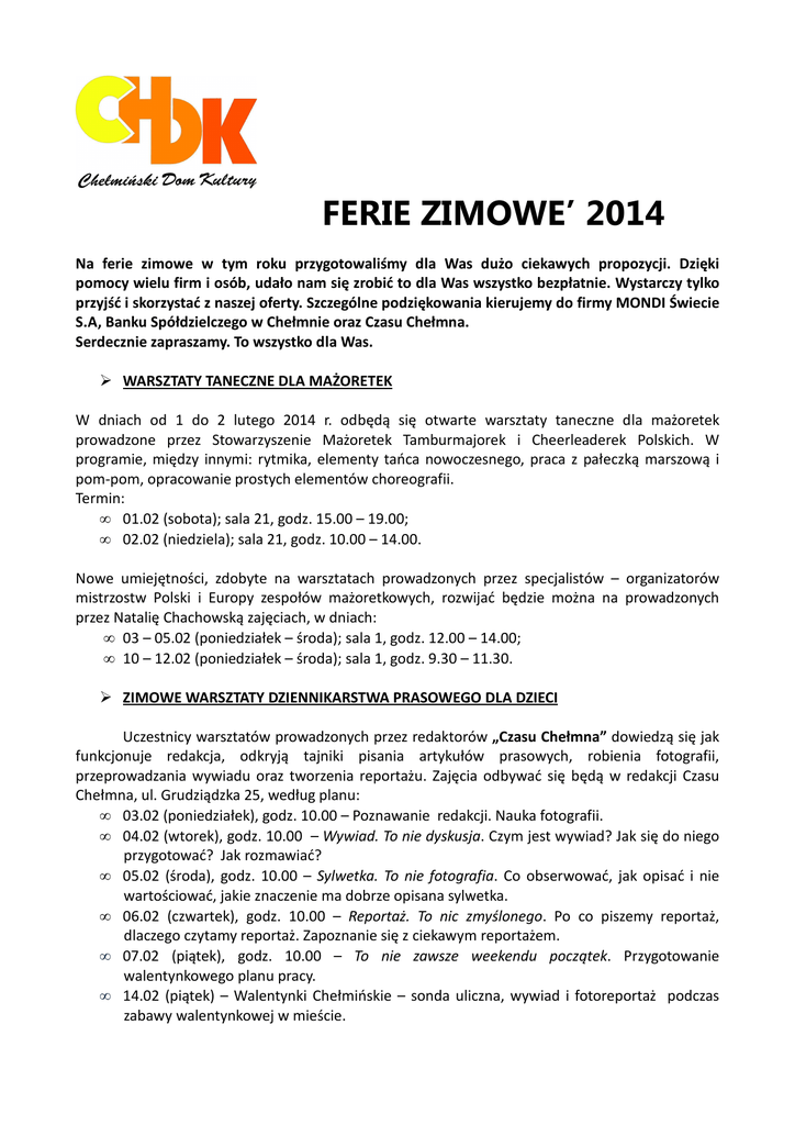 FERIE ZIMOWE’ 2014 Na ferie zimowe w tym roku przygotowaliśmy dla Was dużo ciekawych propozycji. Dzięki pomocy wielu firm i osób, udało nam się zrobić to dla Was wszystko bezpłatnie. Wystarczy tylko przyjść i skorzystać z naszej oferty. Szczególne podziękowania kierujemy do firmy MONDI Świecie S.A, Banku Spółdzielczego w Chełmnie oraz Czasu Chełmna. Serdecznie zapraszamy. To wszystko dla Was. WARSZTATY TANECZNE DLA MAŻORETEK W dniach od 1 do 2 lutego 2014 r. odbędą się otwarte warsztaty taneczne dla mażoretek prowadzone przez Stowarzyszenie Mażoretek Tamburmajorek i Cheerleaderek Polskich. W programie, między innymi: rytmika, elementy tańca nowoczesnego, praca z pałeczką marszową i pom-pom, opracowanie prostych elementów choreografii. Termin: • 01.02 (sobota); sala 21, godz. 15.00 – 19.00; • 02.02 (niedziela); sala 21, godz. 10.00 – 14.00. Nowe umiejętności, zdobyte na warsztatach prowadzonych przez specjalistów – organizatorów mistrzostw Polski i Europy zespołów mażoretkowych, rozwijać będzie można na prowadzonych przez Natalię Chachowską zajęciach, w dniach: • 03 – 05.02 (poniedziałek – środa); sala 1, godz. 12.00 – 14.00; • 10 – 12.02 (poniedziałek – środa); sala 1, godz. 9.30 – 11.30. ZIMOWE WARSZTATY DZIENNIKARSTWA PRASOWEGO DLA DZIECI Uczestnicy warsztatów prowadzonych przez redaktorów „Czasu Chełmna” dowiedzą się jak funkcjonuje redakcja, odkryją tajniki pisania artykułów prasowych, robienia fotografii, przeprowadzania wywiadu oraz tworzenia reportażu. Zajęcia odbywać się będą w redakcji Czasu Chełmna, ul. Grudziądzka 25, według planu: • 03.02 (poniedziałek), godz. 10.00 – Poznawanie redakcji. Nauka fotografii. • 04.02 (wtorek), godz. 10.00 – Wywiad. To nie dyskusja. Czym jest wywiad? Jak się do niego przygotować? Jak rozmawiać? • 05.02 (środa), godz. 10.00 – Sylwetka. To nie fotografia. Co obserwować, jak opisać i nie wartościować, jakie znaczenie ma dobrze opisana sylwetka. • 06.02 (czwartek), godz. 10.00 – Reportaż. To nic zmyślonego. Po co piszemy reportaż, dlaczego czytamy reportaż. Zapoznanie się z ciekawym reportażem. • 07.02 (piątek), godz. 10.00 – To nie zawsze weekendu początek. Przygotowanie walentynkowego planu pracy. • 14.02 (piątek) – Walentynki Chełmińskie – sonda uliczna, wywiad i fotoreportaż podczas zabawy walentynkowej w mieście. Zapisy: Redakcja Czasu Chełmna – tel. 56 6790320 lub Chełmiński Dom Kultury – tel. 56 6864808. Ilość miejsc ograniczona. WARSZTATY CYRKOWE I TAŃCA NOWOCZESNEGO Podczas zajęć będzie można poznać elementy żonglerki, iluzji i akrobatyki. Warsztaty, w sali 21, w poniedziałki (3.02 i 10.02) oraz środy (05.02 i 12.02), w godz. 10.00 – 12.00, poprowadzi Ewa Porożyńska. GINĄCE ZAWODY – WARSZTATY PAPIERU CZERPANEGO We wtorek, 4 lutego, od godz. 10.00, w pracowni plastycznej ChDK – sala 23, odbędą się zajęcia z cyklu „Ferie z ginącymi zawodami” – warsztaty papieru czerpanego. Zajęcia finansowane przez MONDI ŚWIECIE S.A. Pokaz i warsztaty czerpania papieru odbędą się przy użyciu tradycyjnej drewnianej prasy śrubowej, drewnianej beczki, starej zabytkowej lakownicy, gęsich piór i wielu innych zabytkowych i unikalnych eksponatów, takich jak m. in. kopia oryginalnego tłoku pieczętnego miasta Koronowa z XVII w. Uczestnicy zajęć będą mieli okazję poznać historię tego nieistniejącego już rzemiosła, które można zobaczyć jedynie w nielicznych już muzeach papiernictwa i drukarstwa w Polsce. Każde dziecko samodzielnie wykona kartkę papieru czerpanego, będzie pisać gęsim piórem oraz samodzielnie na swojej pracy odciśnie tradycyjną pieczęć lakową. Zajęcia poprowadzi Tomasz Poraziński z Koronowa. Zapisy w pracowni plastycznej ChDK, tel. 56 6864808. Ilość miejsc ograniczona. WARSZTATY KREATYWNE DLA DZIECI – „PODSTAWY DECOUPAGE” Warsztaty finansowane przez Bank Spółdzielczy w Chełmnie. Uczestnicy po zapoznaniu się z wykorzystywanymi materiałami, podstawami cieniowania i prostymi sposobami postarzania przedmiotów, wykonywać będą drewniany przybornik na długopisy, zabezpieczając go na koniec lakierem. Zajęcia poprowadzi Anna Pawlak w środę – 5 lutego, w sali 7, o godz. 10.00. Ilość miejsc ograniczona. Zapisy: Chełmiński Dom Kultury - 56 6864808 ZIMOWE SPOTKANIA Z PIOSENKĄ Zajęcia wokalne, prowadzone przez Marcina Dombrowskiego, w sali 24, w dniach: • 03.02 (poniedziałek), godz. 12.00 – 14.00; • 05.02 (środa), godz. 12.00 – 14.00; • 07.02. (piątek), godz. 12.00 – 14.00; • 10.02. (poniedziałek), godz. 12.00 – 14.00. ZAJĘCIA OTWARTE ORKIESTRY DĘTEJ CHEŁMIŃSKIEGO DOMU KULTURY Zapraszamy dzieci z rodzicami. Nie trzeba grać, nie trzeba mieć instrumentu, wystarczy zamiłowanie do muzyki. Orkiestra dęta zaprasza, do sali 7 w Chełmińskim Domu Kultury, na godz. 17.00, w poniedziałki – 3 i 10 lutego oraz w piątek – 7 lutego. PERKUSJA BEZ TAJEMNIC Warsztaty perkusyjne dla dzieci i młodzieży, prowadzone przez Grzegorza Kleszczyńskiego odbędą się we wtorek (04.02) i w czwartek (06.02) o godz. 11.00. WARSZTATY TEATRALNE „MANEKIN TEŻ LALKA” Od poniedziałku (3.02) do piątku (7.02), od godz. 13.00, w sali 26, Iga Jambor-Skupniewicz prowadzić będzie zajęcia teatralne, których głównym bohaterem będzie manekin. OTWARTE SPOTKANIA PRZY SZACHOWNICY Wszystkich miłośników gry w szachy zapraszamy na zajęcia prowadzone przez Leszka Bultrowicza. Spotkania odbędą się w sali 12, w godz. 11.00 – 14.00 we wtorki – 4 i 11 lutego oraz w czwartek – 6 lutego. WARSZTATY PLASTYCZNE DLA DZIECI I MŁODZIEŻY Dzieci i młodzież chcące rozwijać swój talent plastyczny mogą skorzystać z prowadzonych przez panią Reginę Gargol zajęć we wtorek (4.02) o oraz czwartek (6.02), w godz. 12.00 – 14.30, w sali 23. SPACERKI FOTOGRAFICZNE Spotkania plenerowe z fotografią, dla dzieci i młodzież