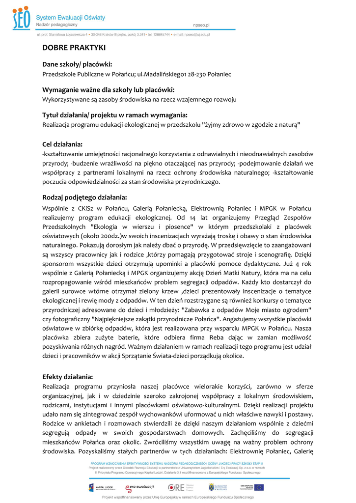 DOBRE PRAKTYKI Dane szkoły/ placówki: Przedszkole Publiczne w Połańcu; ul.Madalińskiego1 28-230 Połaniec Wymaganie ważne dla szkoły lub placówki: Wykorzystywane są zasoby środowiska na rzecz wzajemnego rozwoju Tytuł działania/ projektu w ramach wymagania: Realizacja programu edukacji ekologicznej w przedszkolu "żyjmy zdrowo w zgodzie z naturą" Cel działania: -kształtowanie umiejętności racjonalnego korzystania z odnawialnych i nieodnawialnych zasobów przyrody; -budzenie wrażliwości na piękno otaczającej nas przyrody; -podejmowanie działań we współpracy z partnerami lokalnymi na rzecz ochrony środowiska naturalnego; -kształtowanie poczucia odpowiedzialności za stan środowiska przyrodniczego. Rodzaj podjętego działania: Wspólnie z CKiSz w Połańcu, Galerią Połaniecką, Elektrownią Połaniec i MPGK w Połańcu realizujemy program edukacji ekologicznej. Od 14 lat organizujemy Przegląd Zespołów Przedszkolnych "Ekologia w wierszu i piosence" w którym przedszkolaki z placówek oświatowych (około 200dz.)w swoich inscenizacjach wyrażają troskę i obawy o stan środowiska naturalnego. Pokazują dorosłym jak należy dbać o przyrodę. W przedsięwzięcie to zaangażowani są wszyscy pracownicy jak i rodzice ,którzy pomagają przygotować stroje i scenografię. Dzięki sponsorom wszystkie dzieci otrzymują upominki a placówki pomoce dydaktyczne. Już 4 rok wspólnie z Galerią Połaniecką i MPGK organizujemy akcję Dzień Matki Natury, która ma na celu rozpropagowanie wśród mieszkańców problem segregacji odpadów. Każdy kto dostarczył do galerii surowce wtórne otrzymał zielony krzew ,dzieci prezentowały inscenizacje o tematyce ekologicznej i rewię mody z odpadów. W ten dzień rozstrzygane są również konkursy o tematyce przyrodniczej adresowane do dzieci i młodzieży: "Zabawka z odpadów Moje miasto ogrodem" czy fotograficzny "Najpiękniejsze zakątki przyrodnicze Połańca". Angażujemy wszystkie placówki oświatowe w zbiórkę odpadów, która jest realizowana przy wsparciu MPGK w Połańcu. Nasza placówka zbiera zużyte baterie, które odbiera firma Reba dając w zamian możliwość pozyskiwania różnych nagród. Ważnym działaniem w ramach realizacji tego programu jest udział dzieci i pracowników w akcji Sprzątanie Świata-dzieci porządkują okolice. Efekty działania: Realizacja programu przyniosła naszej placówce wielorakie korzyści, zarówno w sferze organizacyjnej, jak i w dziedzinie szeroko zakrojonej współpracy z lokalnym środowiskiem, rodzicami, instytucjami i innymi placówkami oświatowo-kulturalnymi. Dzięki realizacji projektu udało nam się zintegrować zespół wychowankówi uformować u nich właściwe nawyki i postawy. Rodzice w ankietach i rozmowach stwierdzili że dzięki naszym działaniom wspólnie z dziećmi segregują odpady w swoich gospodarstwach domowych. Zachęciliśmy do segregacji mieszkańców Połańca oraz okolic. Zwróciliśmy wszystkim uwagę na ważny problem ochrony środowiska. Pozyskaliśmy stałych partnerów w tych działaniach: Elektrownię Połaniec, Galerię Połaniecką, Centrum Kultury i Sztuki w Połańcu, MPGK w Połańcu i inne placówki oświatowe. Z funduszy zebranych ze sprzedaży puszek aluminiowych zorganizowaliśmy dla dzieci wycieczki krajoznawcze: w Góry Świętokrzyskie, do Bałtowa, Kurozwęk i Baranowa Sandomierskiego. Dzięki zbiórki zużytych baterii otrzymaliśmy od firmy Reba aparat fotograficzny i pomoce dydaktyczne. W zbiórce surowców wtórnych zdobyliśmy pierwsze miejsce w powiecie i otrzymaliśmy sprzęt komputerowy. Rady i przestrogi: W realizację programu należy zaangażować całą społeczność przedszkolną i samemu aktywnie działać aby być wzorem do naśladowania. Bardzo ważna jest promocja wszystkich działań w różnych mediach: prasa, strony internetowe, radio ,telewizja itp. Należy zapraszać na uroczystości i imprezy sponsorów i partnerów lokalnych oraz zawsze pamiętać o podziękowaniach dla nich za wszelkie wsparcie rzeczowe i finansowe. Nasze działania nie mogą być sporadyczne tylko stanowić systematyczne, cykliczne przedsięwzięcia. Streszczenie: Wspólnie z partnerami lokalnymi CK i Sz w Połańcu ,Galerią Połaniecką i MPGK realizujemy program edukacji ekologicznej w przedszkolu "Żyjmy zdrowo w zgodzie z naturą". Ważnym przedsięwzięciem organizowanym od 14 lat jest Przegląd Zespołów Przedszkolnych "Ekologia w wierszu i piosence" w którym bierze udział około 200 przedszkolaków z wszystkich placówek oświatowych Miasta i Gminy Połaniec i wychowankowie Domu Dziecka w Pacanowie. Dzieci w swoich inscenizacjach wyrażają troskę i obawy o stan środowiska naturalnego oraz pokazują dorosłym jak dbać o przyrodę. Dzięki pozyskanym sponsorom wszyscy uczestnicy otrzymują upominki a placówki pomoce dydaktyczne. Od 4 lat wspólnie z Galerią Połaniecką organizujemy w kwietniu akcję Dzień Matki Natury.W ten dzień nasze przedszkolaki prezentują w galerii programy artystyczne o tematyce ekologicznej, uczestniczą w konkursach a całe rodziny biorą udział w akcji "Krzew za odpady"- podczas której mieszkańcy zbierają duże ilości surowców wtórnych za które pozyskują zielone roślinki. Głównym wydarzeniem jest rozstrzygnięcie konkursów plastycznych i fotograficznych o tematyce przyrodniczej. Wspólna akcja ma na celu rozpropagowanie problemu segregacji odpadów w naszym mieście. Organizowana od wielu lat z naszej inicjatywy selektywna zbiórka odpadów w placówkach oświatowych uczy najmłodszych jak i ich rodziców segregacji odpadów. Pozyskane fundusze ze sprzedaży aluminium pozwalają zorganizować dzieciom wycieczki krajoznawcze do ciekawych miejsc.