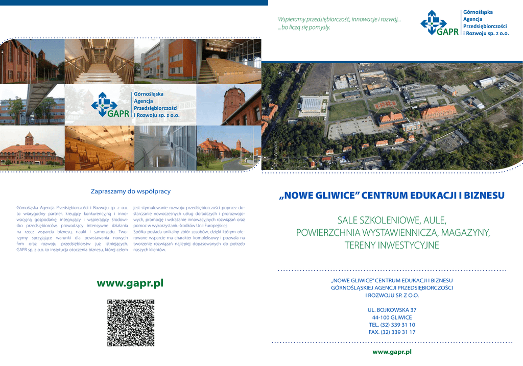 fot. A. Witwicki Wspieramy przedsiębiorczość, innowacje i rozwój... ...bo liczą się pomysły. Zapraszamy do współpracy Górnośląska Agencja Przedsiębiorczości i Rozwoju sp. z o.o. to wiarygodny partner, kreujący konkurencyjną i innowacyjną gospodarkę, integrujący i wspierający środowisko przedsiębiorców, prowadzący intensywne działania na rzecz wsparcia biznesu, nauki i samorządu. Tworzymy sprzyjające warunki dla powstawania nowych firm oraz rozwoju przedsiębiorstw już istniejących. GAPR sp. z o.o. to instytucja otoczenia biznesu, której celem jest stymulowanie rozwoju przedsiębiorczości poprzez dostarczanie nowoczesnych usług doradczych i prorozwojowych, promocję i wdrażanie innowacyjnych rozwiązań oraz pomoc w wykorzystaniu środków Unii Europejskiej. Spółka posiada unikalny zbiór zasobów, dzięki którym oferowane wsparcie ma charakter kompleksowy i pozwala na tworzenie rozwiązań najlepiej dopasowanych do potrzeb naszych klientów. www.gapr.pl „NOWE GLIWICE” CENTRUM EDUKACJI I BIZNESU SALE SZKOLENIOWE, AULE, POWIERZCHNIA WYSTAWIENNICZA, MAGAZYNY, TERENY INWESTYCYJNE „NOWE GLIWICE” CENTRUM EDUKACJI I BIZNESU GÓRNOŚLĄSKIEJ AGENCJI PRZEDSIĘBIORCZOŚCI I ROZWOJU SP. Z O.O. UL. BOJKOWSKA 37 44-100 GLIWICE TEL. (32) 339 31 10 FAX. (32) 339 31 17 www.gapr.pl SALE SZKOLENIOWE „Nowe Gliwice” Centrum Edukacji i Biznesu, to: • • • • • nowoczesna infrastruktura, miejsca parkingowe na ponad 600 samochodów, dobra komunikacja, idealne położenie – usytuowanie w pobliżu skrzyżowania autostrad A1 i A4 (węzeł Sośnica), Drogowej Trasy Średnicowej, zjazdu z autostrady A4 na ul. Rybnicką, dostosowanie wszystkich obiektów do potrzeb osób niepełnosprawnych, • • • • • nowoczesne wyposażenie m.in.: projektory, tablica interaktywna, system wideokonferencji, monitor podglądowy, cyfrowy system do tłumaczeń symultanicznych, Wi-Fi, stawki za wynajęcie powierzchni do negocjacji, elektroniczny system rezerwacji dostępny na stronie www.gapr.pl. 10 sal szkoleniowych–(od 16 do 49 osób) Sale szkoleniowe są przestronne i komfortowe. Znakomicie nadają się na wszelkiego rodzaju konferencje, szkolenia i warsztaty, spotkania biznesowe. ATRAKCYJNE POŁOŻENIE wej oraz zjazdu z autostrady A4 na ul. Rybnicką, pozwala na szybki i łatwy dojazd zarówno komunikacją miejską, jak i samochodem, w szczególności z największych aglomeracji miejskich. AULE Panewni cka Rybn icka Staw Cegielnia Rybnicka i Pan ewn icka Ps zc zy ńs ka co wa Kł od nica Pa mick a s „Nowe Gliwice” Centrum Edukacji i Biznesu Górnośląskiej Agencji Przedsiębiorczości i Rozwoju sp. z o.o. zlokalizowane jest przy ulicy Bojkowskiej 37. Atrakcyjne położenie w niewielkiej odległości od centrum oraz w pobliżu skrzyżowania autostrad A1 i A4 (węzeł Sośnica), Drogowej Trasy Średnico- Trynek Ps zc zy ńs ka Ligota Zabrska ilińskiego Rybnicka Nowe Gliwice Ps zc z • Aula symultaniczna – jest największą aulą Centrum Edukacji i Biznesu mogąca pomieścić maksymalnie do 301 osób. Aula jest wyposażona w cyfrowy system tłumaczeń symultanicznych z możliwością jednoczesnego tłumaczenia na cztery języki. • Aula drewniana – dla około 276 osób. • Aula 121 - do około 78 osób. • Aula 123 - do około 78 osób. • Aula 125 - do około 78 osób. Wszystkie aule są klimatyzowane. Wyposażone zostały w no- woczesny sprzęt typu: projektor multimedialny, ekran projekcyjny, wizualizer, system nagłośnienia, mikrofony przewodowe, mikrofony bezprzewodowe, system wideokonferencyjny, system sterowania urządzeniami, tablicę interaktywną, tablet interaktywny, odtwarzacz DVD, nagrywarkę DVD, monitor podglądowy. Ps zc zy ńs ka A4 INNOWACYJNE SĄSIEDZTWO, PREFERENCJE PODATKOWE „Nowe Gliwice” Centrum Edukacji i Biznesu powstało w 2008 roku na zrewitalizowanych terenach byłej KWK Gliwice, które dziś są centrum przemysłu spod znaku high-tech. W ramach kompleksu Centrum Edukacji i Biznesu „Nowe Gliwice” dostępne są powierzchnie biurowe oraz kilka hektarów terenów inwestycyjnych objętych preferencjami podatkowymi dla działalności gospodarczych w branży nowoczesnych technologii. Nowe Gliwice stały się gliwicką ,,doliną krzemową”, większość zlokalizowanych tutaj firm to firmy informatyczne, ale również przedsiębiorstwa zaawansowanych technologii z takich branż jak elektrotechnika, energetyka, telekomunikacja aż po lotnictwo. TRADYCJA I NOWOCZESNOŚĆ Idealne miejsce na organizację konferencji, szkoleń, warsztatów, czy spotkań biznesowych, a także inicjatyw targowych i wystawienniczych. Do dyspozycji oddajemy 10 sal szkoleniowych, 5 auli oraz powierzchnię ekspozycyjno – wystawienniczą. Aule wyposażone są w profesjonalną aparaturę multimedialną. Istnieje możliwość użycia sprzętu do prowadzenia tłumaczeń symultanicznych. POWIERZCHNIA WYSTAWIENNICZA – KONCERTOWA Powierzchnia ekspozycyjno–wystawiennicza (235 m2) umożliwia dowolne aranżowanie przestrzeni w zależności od potrzeb wystawcy. W ramach dostępnego wyposażenia zamontowane są listwy (szyny aluminiowe) umożliwia- jące zawieszanie eksponatów za pomocą systemu linek stalowych i haczyków. Oświetlenie metalohalogenkowymi lampkami pozwala na efektowne prezentowanie eksponatów.