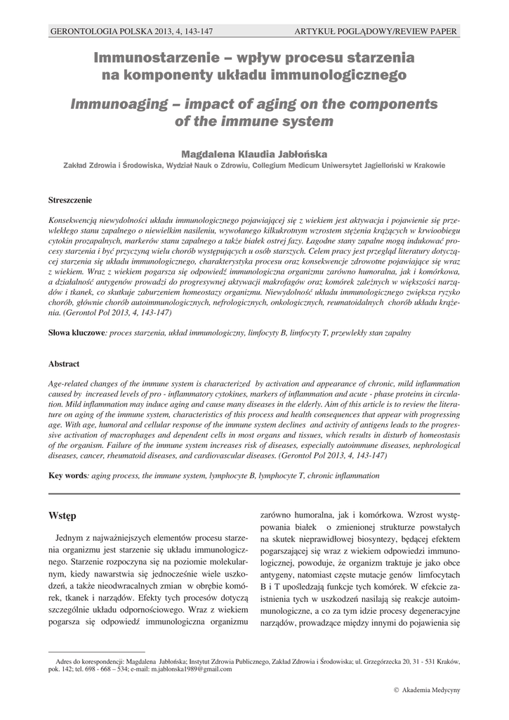 GERONTOLOGIA POLSKA 2013, 4, 143-147 ARTYKUŁ POGLĄDOWY/REVIEW PAPER Immunostarzenie – wpływ procesu starzenia na komponenty układu immunologicznego Immunoaging – impact of aging on the components of the immune system Magdalena Klaudia Jabłońska Zakład Zdrowia i Środowiska, Wydział Nauk o Zdrowiu, Collegium Medicum Uniwersytet Jagielloński w Krakowie Streszczenie Konsekwencją niewydolności układu immunologicznego pojawiającej się z wiekiem jest aktywacja i pojawienie się przewlekłego stanu zapalnego o niewielkim nasileniu, wywołanego kilkukrotnym wzrostem stężenia krążących w krwioobiegu cytokin prozapalnych, markerów stanu zapalnego a także białek ostrej fazy. Łagodne stany zapalne mogą indukować procesy starzenia i być przyczyną wielu chorób występujących u osób starszych. Celem pracy jest przegląd literatury dotyczącej starzenia się układu immunologicznego, charakterystyka procesu oraz konsekwencje zdrowotne pojawiające się wraz z wiekiem. Wraz z wiekiem pogarsza się odpowiedź immunologiczna organizmu zarówno humoralna, jak i komórkowa, a działalność antygenów prowadzi do progresywnej aktywacji makrofagów oraz komórek zależnych w większości narządów i tkanek, co skutkuje zaburzeniem homeostazy organizmu. Niewydolność układu immunologicznego zwiększa ryzyko chorób, głównie chorób autoimmunologicznych, nefrologicznych, onkologicznych, reumatoidalnych chorób układu krążenia. (Gerontol Pol 2013, 4, 143-147) Słowa kluczowe: proces starzenia, układ immunologiczny, limfocyty B, limfocyty T, przewlekły stan zapalny Abstract Age-related changes of the immune system is characterized by activation and appearance of chronic, mild inflammation caused by increased levels of pro - inflammatory cytokines, markers of inflammation and acute - phase proteins in circulation. Mild inflammation may induce aging and cause many diseases in the elderly. Aim of this article is to review the literature on aging of the immune system, characteristics of this process and health consequences that appear with progressing age. With age, humoral and cellular response of the immune system declines and activity of antigens leads to the progressive activation of macrophages and dependent cells in most organs and tissues, which results in disturb of homeostasis of the organism. Failure of the immune system increases risk of diseases, especially autoimmune diseases, nephrological diseases, cancer, rheumatoid diseases, and cardiovascular diseases. (Gerontol Pol 2013, 4, 143-147) Key words: aging process, the immune system, lymphocyte B, lymphocyte T, chronic inflammation Wstęp Jednym z najważniejszych elementów procesu starzenia organizmu jest starzenie się układu immunologicznego. Starzenie rozpoczyna się na poziomie molekularnym, kiedy nawarstwia się jednocześnie wiele uszkodzeń, a także nieodwracalnych zmian w obrębie komórek, tkanek i narządów. Efekty tych procesów dotyczą szczególnie układu odpornościowego. Wraz z wiekiem pogarsza się odpowiedź immunologiczna organizmu zarówno humoralna, jak i komórkowa. Wzrost występowania białek o zmienionej strukturze powstałych na skutek nieprawidłowej biosyntezy, będącej efektem pogarszającej się wraz z wiekiem odpowiedzi immunologicznej, powoduje, że organizm traktuje je jako obce antygeny, natomiast częste mutacje genów limfocytach B i T upośledzają funkcje tych komórek. W efekcie zaistnienia tych w uszkodzeń nasilają się reakcje autoimmunologiczne, a co za tym idzie procesy degeneracyjne narządów, prowadzące między innymi do pojawienia się Adres do korespondencji: Magdalena Jabłońska; Instytut Zdrowia Publicznego, Zakład Zdrowia i Środowiska; ul. Grzegórzecka 20, 31 - 531 Kraków, pok. 142; tel. 698 - 668 – 534; e-mail: [email protected] Ó Akademia Medycyny 144 MAGDALENA JABŁOŃSKA zmian nowotworowych wywołanych ograniczoną eliminacją komórek zmienionych antygenowo. Odpowiedzią układu odpornościowego na zachodzące w organizmie zmiany wywołane m.in. przez infekcje, brak aktywności fizycznej prowadzący do powstania chorób metabolicznych, stres oraz proces starzenia, jest stan zapalny. Przewlekły stan zapalny towarzyszy chorobom układu oddechowego np. astmie, chorobom neurologicznym, np. stwardnienie rozsiane, chorobom autoimmunologicznym, chorobom układu krążenia i wielu innym. W wyniku występującego w organizmie stanu zapalnego, układ immunologiczny jest stale pobudzany do produkcji czynników regulujących mechanizmy obronne, jakimi są przede wszystkim interleukina – 6, czynnik martwicy nowotworu (ang. TNF – α – Tumor Necrosis Factor) czy białko C – reaktywne (ang. CRP – C reactive protein). Nadwyrężenie możliwości układu immunologicznego prowadzi do jego niewydolności, która pogłębia się wraz z wiekiem [1]. Niewydolność układu immunologicznego jest czynnikiem powodującym zwiększoną nadwrażliwość na infekcje, za co odpowiedzialne są niewystarczająco intensywne i efektywne reakcje na czynniki mitogenne. Zazwyczaj każdy antygen pobudza do proliferacji niewielki odsetek nie przekraczający 1% określonej populacji limfocytów, natomiast pojawienie się czynników mitogennych znacznie zwiększa ich liczbę [2]. Choroby infekcyjne, autoimmunologiczne, nowotworowe, obciążenie psychiczne czy zaburzenia hormonalne, oddziaływują negatywnie na układ immunologiczny, powodując jego osłabienie i upośledzenie wielu jego funkcji, na przykład poprzez natężenie czynników immunosupresyjnych. Zmiany w zakresie komórek układu odpornościowego przejawiają się przede wszystkim zwiększoną apoptozą komórkową, limfocyty B wraz z wiekiem zmniejszają zdolność syntezy przeciwciał, zmniejsza się także pula limfocytów T naiwnych, komórki fagocytujące tracą stopniowo zdolność zabijania wewnątrzkomórkowego i fagocytozy [3]. Materiał i metody Przedmiotem analizy były publikacje zindeksowane w b