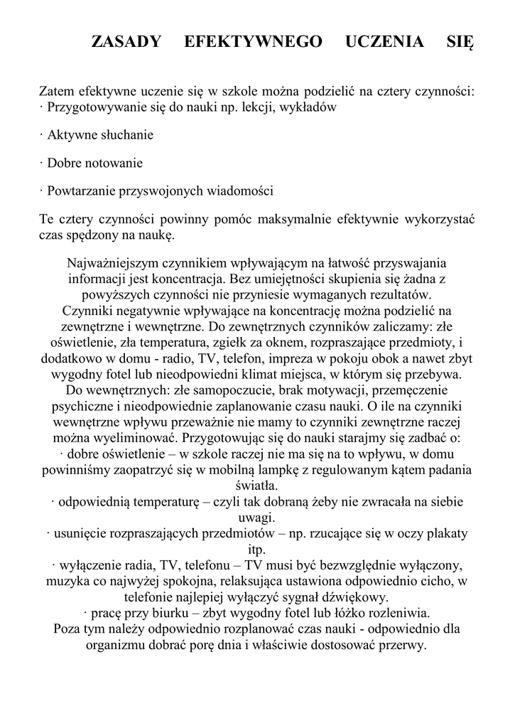 ZASADY EFEKTYWNEGO UCZENIA SIĘ Zatem efektywne uczenie się w szkole można podzielić na cztery czynności: · Przygotowywanie się do nauki np. lekcji, wykładów · Aktywne słuchanie · Dobre notowanie · Powtarzanie przyswojonych wiadomości Te cztery czynności powinny pomóc maksymalnie efektywnie wykorzystać czas spędzony na naukę. Najważniejszym czynnikiem wpływającym na łatwość przyswajania informacji jest koncentracja. Bez umiejętności skupienia się żadna z powyższych czynności nie przyniesie wymaganych rezultatów. Czynniki negatywnie wpływające na koncentrację można podzielić na zewnętrzne i wewnętrzne. Do zewnętrznych czynników zaliczamy: złe oświetlenie, zła temperatura, zgiełk za oknem, rozpraszające przedmioty, i dodatkowo w domu - radio, TV, telefon, impreza w pokoju obok a nawet zbyt wygodny fotel lub nieodpowiedni klimat miejsca, w którym się przebywa. Do wewnętrznych: złe samopoczucie, brak motywacji, przemęczenie psychiczne i nieodpowiednie zaplanowanie czasu nauki. O ile na czynniki wewnętrzne wpływu przeważnie nie mamy to czynniki zewnętrzne raczej można wyeliminować. Przygotowując się do nauki starajmy się zadbać o: · dobre oświetlenie – w szkole raczej nie ma się na to wpływu, w domu powinniśmy zaopatrzyć się w mobilną lampkę z regulowanym kątem padania światła. · odpowiednią temperaturę – czyli tak dobraną żeby nie zwracała na siebie uwagi. · usunięcie rozpraszających przedmiotów – np. rzucające się w oczy plakaty itp. · wyłączenie radia, TV, telefonu – TV musi być bezwzględnie wyłączony, muzyka co najwyżej spokojna, relaksująca ustawiona odpowiednio cicho, w telefonie najlepiej wyłączyć sygnał dźwiękowy. · pracę przy biurku – zbyt wygodny fotel lub łóżko rozleniwia. Poza tym należy odpowiednio rozplanować czas nauki - odpowiednio dla organizmu dobrać porę dnia i właściwie dostosować przerwy. PRZYGOTOWANIE SIĘ DO LEKCJI: W opinii uczniów pokutuje przekonanie, że lekcje należy lekceważyć, iść na nie (lub lepiej nie) tylko po to, aby przesiedzieć, przepisać z tablicy „co leci”, ściągnąć na kartkówkach itd. Jeśli traktować by lekcje jako czas na zdobycie maksymalnej ilości wiedzy można oszczędzić czas (na douczanie się w domu) a także znacząco podnieść efektywność swojej nauki. Jeśli spojrzeć na to z innej strony, to i tak trzeba „odsiedzieć” te ok. 45 minut. W tym czasie nie można bawić się tak jak by się chciało, uprawiać swojego ulubionego hobby ani nawet rozmawiać z kolegami (bo nauczyciel „przeszkadza”). Jedyne co naprawdę można dobrze robić w tym czasie to maksymalnie przyłożyć się do nauki tak aby potem mieć więcej czasu na inne zajęcia. Rozpocząć lekcję należy od rozwinięcia nastroju do słuchania. I tu może się pojawić pierwszy problem jeśli lekcja dotyczy tematu, który kompletnie nie interesuje ucznia. W tym przypadku uczeń może sztucznie wywołać swe zainteresowanie. Na początek może przejrzeć pobieżnie materiał przeznaczony na daną lekcję, aby miał już wstępne pojęcie o czym będzie mowa na tej lekcji, zapoznać się z nowymi terminami, pojęciami itd. Takie wstępne zapoznanie się z tematem jest bardzo dobrym sposobem na skuteczne zapamiętanie danego materiału. Działa tutaj jedno z praw pamięci - powtarzanie - im częściej uczeń ma do czynienia z daną informację - tym lepiej ją zapamięta. Taki wstępny przegląd jest pierwszym kontaktem z nowym materiałem. Daje ogólne pojęcie o tym, co będzie na lekcji. Dzięki temu sama lekcja będzie wówczas właściwie powtórką, uzupełnieniem informacji, o których uczeń już wie z przed lekcyjnego wglądu. Inną zaletą takiego przed-wglądu jest to, że łatwiej notować taką lekcję, ponieważ uczeń będzie wiedział co go czeka, ile miejsca przydzielić na dany punkt, co jest ważne, a co mniej. Innym jeszcze lepszym sposobem jest przejrzenie pobieżne materiału na nadchodzącą lekcję i wynotowanie kilku pytań związanych z tym materiałem. Te pytania mogą: · wynikać z zainteresowania ucznia · być przerobionym tytułem rozdziałów, całej lekcji Takie stawianie pytań przed lekcją sprawia, że w czasie lekcji umysł jest zorientowany na cel uzyskania dokładnej odpowiedzi na frapujące pytania. Stawianie celów to bardzo silna technika. Ma ona bardzo dużo dobrych efektów bezpośrednich i pobocznych. W tym przypadku przez postawienie sobie wyraźnych pytań przed lekcją i szukanie odpowiedzi na nie w czasie lekcji sprawia, że uczeń automatycznie z łatwością koncentruje się, a jego uwaga jest skupiona na poszukiwaniu odpowiedzi. Powyższa metoda jest metodą aktywną, podczas gdy tradycyjna - jest pasywną. Lekcja zamienia się w konkretne załatwianie, odhaczanie małych celów - pytań, które uczeń postawił sobie przed lekcją. Najlepiej byłoby, gdyby nauczyciele byli na tyle wytrenowani w praktyce prowadzenia treningów i wykładów, aby ich lekcje były zorganizowanie w ten sposób, by same w sobie zawierały elementy wzbudzające ciekawość, były zorganizowane i zorientowane na osiąganie celów. Mały test (sam dla siebie), czy pamięta materiał z poprzedniej lekcji. Przed lekcją uczeń może zrobić małą szybką powtórkę materiału z poprzedniej lekcji z tego tematu. Powinien to robić bez zaglądania do notatek - jest to o wiele lepszy sposób, niż po prostu przeglądanie notatek. W ten sposób może sprawdzić na ile skutecznie zapamiętał materiał z poprzedniej lekcji. Po wykonaniu tej czynności, może dopiero zajrzeć do notatek, i powtórzyć czytając je pobieżnie. Zawsze odrobione zadane lekcje - zarówno co było zadane do przeczytania jak i zadania pisemne. O wiele lepiej zrobić to wcześniej - w domu, na spokojnie. Wówczas przed lekcją można spokojnie przygotować się, a nie na kolanie, w stresie przepisywać z czyjegoś zeszytu, albo nerwowo czyt