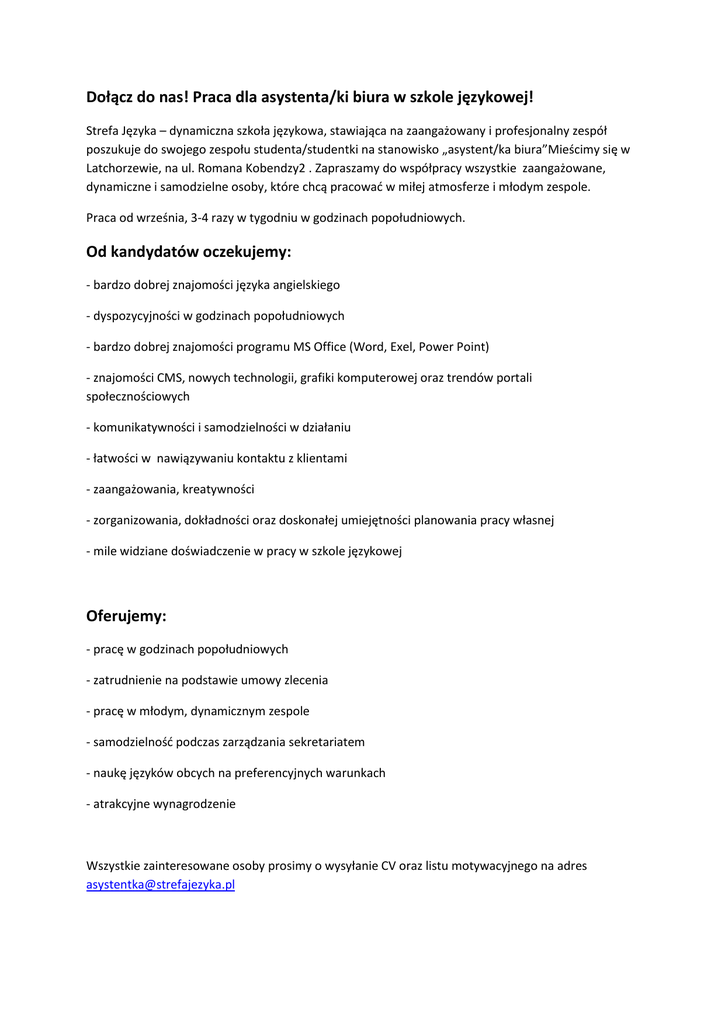 Dołącz do nas! Praca dla asystenta/ki biura w szkole językowej! Strefa Języka – dynamiczna szkoła językowa, stawiająca na zaangażowany i profesjonalny zespół poszukuje do swojego zespołu studenta/studentki na stanowisko „asystent/ka biura”Mieścimy się w Latchorzewie, na ul. Romana Kobendzy2 . Zapraszamy do współpracy wszystkie zaangażowane, dynamiczne i samodzielne osoby, które chcą pracować w miłej atmosferze i młodym zespole. Praca od września, 3-4 razy w tygodniu w godzinach popołudniowych. Od kandydatów oczekujemy: - bardzo dobrej znajomości języka angielskiego - dyspozycyjności w godzinach popołudniowych - bardzo dobrej znajomości programu MS Office (Word, Exel, Power Point) - znajomości CMS, nowych technologii, grafiki komputerowej oraz trendów portali społecznościowych - komunikatywności i samodzielności w działaniu - łatwości w nawiązywaniu kontaktu z klientami - zaangażowania, kreatywności - zorganizowania, dokładności oraz doskonałej umiejętności planowania pracy własnej - mile widziane doświadczenie w pracy w szkole językowej Oferujemy: - pracę w godzinach popołudniowych - zatrudnienie na podstawie umowy zlecenia - pracę w młodym, dynamicznym zespole - samodzielność podczas zarządzania sekretariatem - naukę języków obcych na preferencyjnych warunkach - atrakcyjne wynagrodzenie Wszystkie zainteresowane osoby prosimy o wysyłanie CV oraz listu motywacyjnego na adres [email protected]