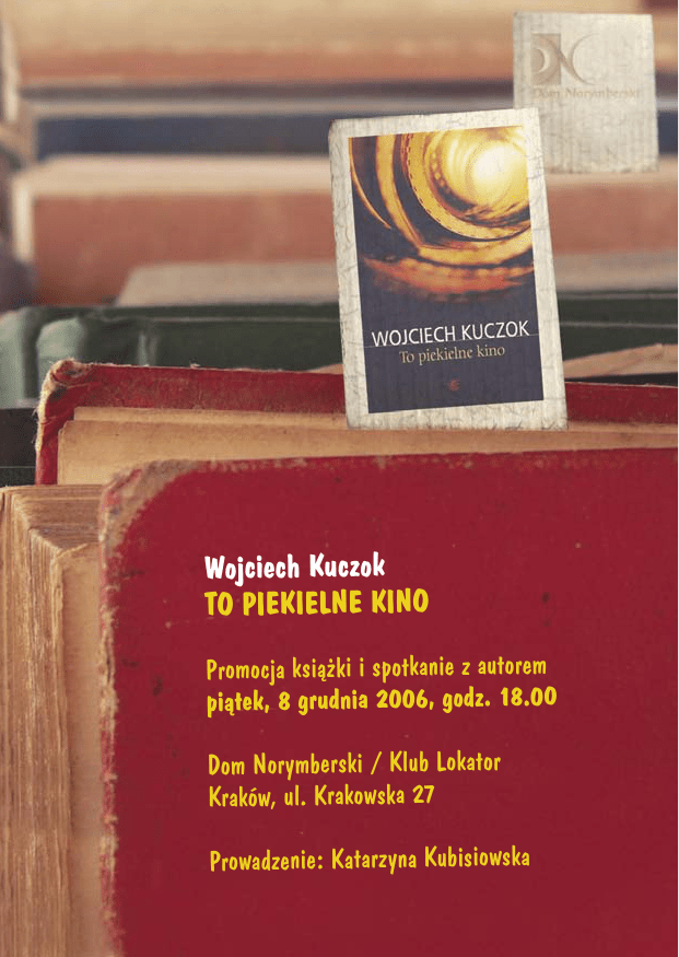 Wojciech Kuczok TO PIEKIELNE KINO Promocja książki i spotkanie z autorem piątek, 8 grudnia 2006, godz. 18.00 Dom Norymberski / Klub Lokator Kraków, ul. Krakowska 27 Prowadzenie: Katarzyna Kubisiowska „Można mieć nadzieję, że podobnie jak w muzyce, definitywnie wyodrębni się kino popularne i kino poważne, klasyczne – ograniczone jedynie wewnętrzną cenzurą twórcy, w którym w imię Prawdy o człowieku dozwolone będzie przekraczanie granic tradycji i przyzwyczajeń, dozwolone będzie szaleństwo i nieprzyzwoitość w obrębie Dzieła Sztuki.” Eseje zebrane pod tytułem To piekielne kino Wojciech Kuczok poświęca właśnie temu drugiemu rodzajowi twórczości filmowej. Analizuje tu dzieła często przez krytyków przemilczane, budzące kontrowersje, obyczajowo „wyklęte”, ponieważ mierzą się ze współczesnymi tabu: złem i umieraniem. Wojciech Kuczok (ur. 1972) – prozaik, krytyk filmowy. Zadebiutował tomem opowiadań Opowieści słychane (1999), nominowanym do nagrody literackiej NIKE i nagrodzonym przez Polskie Towarzystwo Wydawców Książek w roku 2000. Wydał także zbiór opowiadań Szkieleciarki (2002) oraz tom poezji Opowieści samowite (1996). W 2003 roku nakładem W.A.B. ukazała się powieść Gnój, uhonorowana nagrodą NIKE 2004 i Paszportem „Polityki” za rok 2003 w dziedzinie literatury. W 2004 roku autor opublikował zbiór opowiadań Widmokrąg. Na podstawie wybranych wątków swojej twórczości (m.in. opowiadania Dioboł i powieści Gnój) Wojciech Kuczok napisał scenariusz filmu Pręgi, wyreżyserowanego przez Magdalenę Piekorz, nagrodzonego Złotymi Lwami na Festiwalu Polskich Filmów Fabularnych w Gdyni. W 2005 roku ukazał się jego zbiór opowiadań Opowieści przebrane. Organizatorzy: www.dom-norymberski.com Partner: