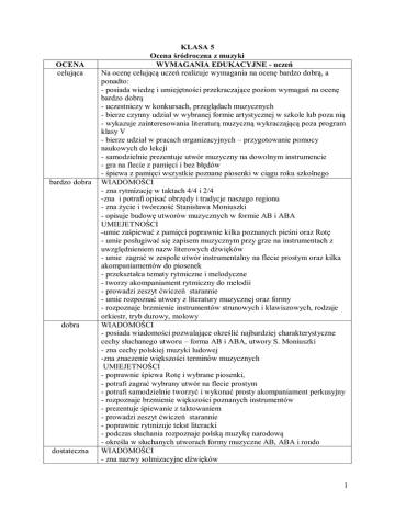 OCENA celująca bardzo dobra dobra dostateczna KLASA 5 Ocena śródroczna z muzyki WYMAGANIA EDUKACYJNE - uczeń Na ocenę celującą uczeń realizuje wymagania na ocenę bardzo dobrą, a ponadto: - posiada wiedzę i umiejętności przekraczające poziom wymagań na ocenę bardzo dobrą - uczestniczy w konkursach, przeglądach muzycznych - bierze czynny udział w wybranej formie artystycznej w szkole lub poza nią - wykazuje zainteresowania literaturą muzyczną wykraczającą poza program klasy V - bierze udział w pracach organizacyjnych – przygotowanie pomocy naukowych do lekcji - samodzielnie prezentuje utwór muzyczny na dowolnym instrumencie - gra na flecie z pamięci i bez błędów - śpiewa z pamięci wszystkie poznane piosenki w ciągu roku szkolnego WIADOMOŚCI - zna rytmizację w taktach 4/4 i 2/4 -zna i potrafi opisać obrzędy i tradycje naszego regionu - zna życie i twórczość Stanisława Moniuszki - opisuje budowę utworów muzycznych w formie AB i ABA UMIEJETNOŚCI -umie zaśpiewać z pamięci poprawnie kilka poznanych pieśni oraz Rotę - umie posługiwać się zapisem muzycznym przy grze na instrumentach z uwzględnieniem nazw literowych dźwięków - umie zagrać w zespole utwór instrumentalny na flecie prostym oraz kilka akompaniamentów do piosenek - przekształca tematy rytmiczne i melodyczne - tworzy akompaniament rytmiczny do melodii - prowadzi zeszyt ćwiczeń starannie - umie rozpoznać utwory z literatury muzycznej oraz formy - rozpoznaje brzmienie instrumentów strunowych i klawiszowych, rodzaje orkiestr, tryb durowy, molowy WIADOMOŚCI - posiada wiadomości pozwalające określić najbardziej charakterystyczne cechy słuchanego utworu – forma AB i ABA, utwory S. Moniuszki - zna cechy polskiej muzyki ludowej -zna znaczenie większości terminów muzycznych UMIEJETNOŚCI - poprawnie śpiewa Rotę i wybrane piosenki, - potrafi zagrać wybrany utwór na flecie prostym - potrafi samodzielnie tworzyć i wykonać prosty akompaniament perkusyjny - rozpoznaje brzmienie większości poznanych instrumentów - prezentuje śpiewanie z taktowaniem - prowadzi zeszyt ćwiczeń starannie - poprawnie rytmizuje tekst literacki - podczas słuchania rozpoznaje polską muzykę narodową - określa w słuchanych utworach formy muzyczne AB, ABA i rondo WIADOMOŚCI - zna nazwy solmizacyjne dźwięków 1 - zna wartości rytmiczne nut i pauz - zna pojęcia: refren, , zespół, chór, solista UMIEJĘTNOŚCI - prowadzi zeszyt ćwiczeń - bierze czynny udział w procesie lekcyjnym - umie zaśpiewać piosenki o średnim stopniu trudności - potrafi zagrać na flecie lub dzwonkach proste melodie - uzupełnia takty wartościami rytmicznymi i pauzami, potrafi taktować - wyklaskuje poznane rytmy - rozpoznaje słuchem muzykę solową, duet, orkiestrę, chór - dobiera do piosenki prosty akompaniament perkusyjny dopuszczająca WIADOMOŚCI - wymienia niektóre terminy muzyczne - potrafi wymienić przynajmniej jednego omawianego kompozytora UMIEJĘTNOŚCI -wykazuje pozytywny stosunek do przedmiotu - zadania wykonuje z pomocą nauczyciela - recytuje tekst piosenki - gra pojedyncze dźwięki na flecie lub dzwonkach - prowadzi zeszyt niesystematycznie - próbuje powtarzać najprostsze ćwiczenia rytmiczne - odróżnia muzykę solową od zespołowej niedostateczna Ocenę niedostateczna otrzymuje uczeń, który nie spełnia wymagań na ocenę dopuszczającą i mimo usilnych starań nauczyciela ma negatywny stosunek do przedmiotu. OCENA celująca bardzo dobra KLASA 5 Ocena roczna z muzyki WYMAGANIA EDUKACYJNE - uczeń Na ocenę celującą uczeń realizuje wymagania na ocenę bardzo dobrą, a ponadto: - posiada wiedzę i umiejętności przekraczające poziom wymagań na ocenę bardzo dobrą - uczestniczy w konkursach, przeglądach muzycznych - bierze czynny udział w wybranej formie artystycznej w szkole lub poza nią - wykazuje zainteresowania literaturą muzyczną wykraczającą poza program klasy V - bierze udział w pracach organizacyjnych – przygotowanie pomocy naukowych do lekcji - samodzielnie prezentuje utwór muzyczny na dowolnym instrumencie - gra na flecie z pamięci i bez błędów - śpiewa z pamięci wszystkie poznane piosenki w ciągu roku szkolnego WIADOMOŚCI - charakteryzuje muzykę programową i filmową - buduje gamę molową i durową - opisuje wybrane instrumenty strunowe i klawiszowe - zna wszystkie pojęcia muzyczne poznane w ciągu całego roku szkolnego UMIEJĘTNOŚCI -umie zaśpiewać z pamięci poprawnie pod względem intonacyjnym, 2 dobra dostateczna dopuszczająca rytmicznym i artykulacyjnym kilka poznanych pieśni - umie posługiwać się zapisem muzycznym przy grze na instrumentach z uwzględnieniem nazw literowych dźwięków - umie zagrać zespole utwór instrumentalny oraz kilka akompaniamentów do piosenek - przekształca tematy rytmiczne i melodyczne - tworzy akompaniament rytmiczny do melodii - prowadzi zeszyt ćwiczeń starannie - umie rozpoznać utwory z literatury muzycznej oraz formy AB, ABA i rondo, - rozpoznaje brzmienie instrumentów strunowych i klawiszowych, rodzaje orkiestr, tryb durowy, molowy - potrafi samodzielnie odczytać wybraną melodię uwzględnieniem znaków chromatycznych WIADOMOŚCI - rozumie znaczenie większości terminów muzycznych trójdźwięk, akord, zespoły instrumentalne, synkopa - rozpoznaje różne rodzaje śpiewu: chorał gregoriański, negro spirituals, jednogłosowy, chóralny, zespołowy i potrafi je scharakteryzować UMIEJĘTNOŚCI - Poprawnie śpiewa wybrane piosenki, - poprawnie zagrać wybrany utwór na dowolnym instrumencie - samodzielnie tworzyć i wykonać prosty akompaniament perkusyjny - posiadać wiadomości pozwalające określić najbardziej charakterystyczne cechy słuchanego utworu - prowadzi zeszyt ćwiczeń starannie - rozpoznaje brzmienie większości poznanych instrumentów - prezentuje śpiewanie z taktowaniem - poprawnie rytmizuje tekst literacki WIADOMOŚCI - zna nazwy solmizacyjne dźwięków - z