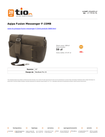 e-mail: [email protected] tel. : 17 770 04 76, Aqipa Fusion Messenger F-15MB www.tio.pl/aqipa-fusion-messenger-f-15mb-produkt-5669.html Stara cena: 109 zł Cena brutto: 59 zł Cena netto: 47.97 zł -46% Rozmiar: 15" Pasuje do: MacBook Pro 15 *Ceny obowiązują wyłącznie przy składaniu zamówień przez sklep internetowy. Ceny w salonie TiO media mogą nieznacznie różnić się od cen prezentowanych na stronach sklepu internetowego. Przedstawiona oferta w sklepie internetowym nie stanowi oferty w rozumieniu Kodeksu Cywilnego, i jest jedynie zaproszeniem do rozpoczęcia rokowań (zgodnie z art. 71 k.c.). Zastrzegamy sobie prawo do niezrealizowania zamówień z ważnych przyczyn ekonomicznych.