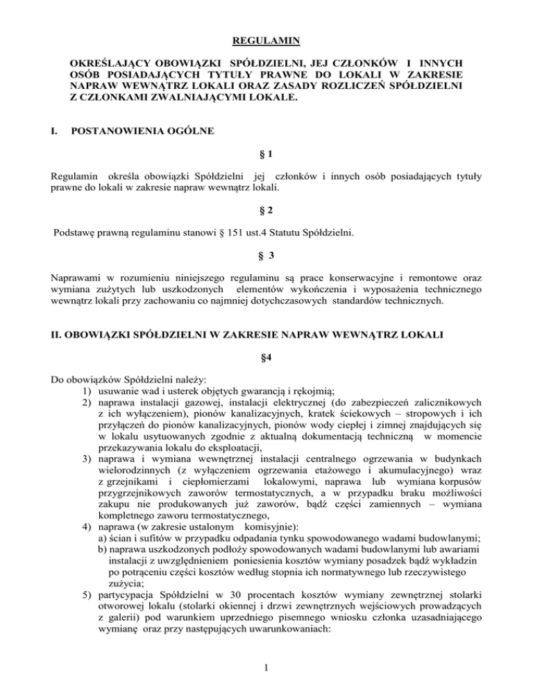 REGULAMIN OKREŚLAJĄCY OBOWIĄZKI SPÓŁDZIELNI, JEJ CZŁONKÓW I INNYCH OSÓB POSIADAJĄCYCH TYTUŁY PRAWNE DO LOKALI W ZAKRESIE NAPRAW WEWNĄTRZ LOKALI ORAZ ZASADY ROZLICZEŃ SPÓŁDZIELNI Z CZŁONKAMI ZWALNIAJĄCYMI LOKALE. I. POSTANOWIENIA OGÓLNE §1 Regulamin określa obowiązki Spółdzielni jej członków i innych osób posiadających tytuły prawne do lokali w zakresie napraw wewnątrz lokali. §2 Podstawę prawną regulaminu stanowi § 151 ust.4 Statutu Spółdzielni. § 3 Naprawami w rozumieniu niniejszego regulaminu są prace konserwacyjne i remontowe oraz wymiana zużytych lub uszkodzonych elementów wykończenia i wyposażenia technicznego wewnątrz lokali przy zachowaniu co najmniej dotychczasowych standardów technicznych. II. OBOWIĄZKI SPÓŁDZIELNI W ZAKRESIE NAPRAW WEWNĄTRZ LOKALI §4 Do obowiązków Spółdzielni należy: 1) usuwanie wad i usterek objętych gwarancją i rękojmią; 2) naprawa instalacji gazowej, instalacji elektrycznej (do zabezpieczeń zalicznikowych z ich wyłączeniem), pionów kanalizacyjnych, kratek ściekowych – stropowych i ich przyłączeń do pionów kanalizacyjnych, pionów wody ciepłej i zimnej znajdujących się w lokalu usytuowanych zgodnie z aktualną dokumentacją techniczną w momencie przekazywania lokalu do eksploatacji, 3) naprawa i wymiana wewnętrznej instalacji centralnego ogrzewania w budynkach wielorodzinnych (z wyłączeniem ogrzewania etażowego i akumulacyjnego) wraz z grzejnikami i ciepłomierzami lokalowymi, naprawa lub wymiana korpusów przygrzejnikowych zaworów termostatycznych, a w przypadku braku możliwości zakupu nie produkowanych już zaworów, bądź części zamiennych – wymiana kompletnego zaworu termostatycznego, 4) naprawa (w zakresie ustalonym komisyjnie): a) ścian i sufitów w przypadku odpadania tynku spowodowanego wadami budowlanymi; b) naprawa uszkodzonych podłoży spowodowanych wadami budowlanymi lub awariami instalacji z uwzględnieniem poniesienia kosztów wymiany posadzek bądź wykładzin po potrąceniu części kosztów według stopnia ich normatywnego lub rzeczywistego zużycia; 5) partycypacja Spółdzielni w 30 procentach kosztów wymiany zewnętrznej stolarki otworowej lokalu (stolarki okiennej i drzwi zewnętrznych wejściowych prowadzących z galerii) pod warunkiem uprzedniego pisemnego wniosku członka uzasadniającego wymianę oraz przy następujących uwarunkowaniach: 1 a) dla stolarki otworowej standardowej, gdy wymiana następuje na okna z wielokomorowych profili PCW lub okna z drewna klejonego, bądź drewnianoaluminiowe procentowy udział partycypacyjny oblicza się następująco: dla okien 5-komorowych lub o wyższym standardzie technicznym - w/g wartości zafakturowanych, uwzględniających standardowe okucia z mikrowentylacją, zamontowane nawietrzaki higrosterowalne (lub podobne), standardowe klamki, kolorystykę zewnętrzną adekwatną do kolorystyki okien danego budynku (gdy jest ona inna niż kolor biały), kosztu montażu w zryczałtowanej aktualnej cenie rynkowej, kosztu szyb zespolonych w aktualnie obowiązującym standardzie ochrony cieplnej ( współczynnik K); rozliczenie partycypacji następuje do wysokości aktualnych średnich katalogowych cen rynkowych; dla okien drewnianych klejonych, drewniano-aluminiowych, bądź innych niż wyżej opisane w/g wartości zafakturowanych, uwzględniających standardowe okucia z mikrowentylacją, zamontowane nawietrzaki higrosterowalne (lub podobne), standardowe klamki, kolorystykę zewnętrzną adekwatną do kolorystyki okien danego budynku (gdy jest ona inna niż kolor biały), kosztu montażu w zryczałtowanej aktualnej cenie rynkowej, kosztu szyb zespolonych w aktualnie obowiązującym standardzie ochrony cieplnej ( współczynnik K); rozliczenie partycypacji następuje do wysokości aktualnych średnich katalogowych cen rynkowych 5-komorowych okien z PCW. W przypadkach innych niż wyżej opisane o sposobie rozliczenia 30-procentowego udziału partycypacyjnego decyduje Zarząd Spółdzielni; b) dla stolarki otworowej niestandardowej, w szczególności dla okien w budynkach objętych ochroną zabytków obowiązuje pełna weryfikacja zasadności wymiany poprzez komisyjną kwalifikację i obowiązujące procedury konserwacji zabytków; udział partycypacyjny Spółdzielni w takich przypadkach wynosi 30% poniesionych uzasadnionych kosztów; c) końcowe rozliczenie partycypacji kosztów wymiany stolarki otworowej przez Spółdzielnię następuje po dokonaniu odbioru prac przez Administrację Osiedla pod warunkiem zachowania podziału architektonicznego, kolorystyki stolarki, przywrócenia kolorystyki elewacji do pierwotnego stanu oraz innych warunków zawartych w piśmie, bądź zaleceniach wydanych przez Administrację Osiedla; d) w szczególnie uzasadnionych przypadkach na pisemny wniosek członka umotywowany ograniczeniami finansowymi Zarząd po weryfikacji technicznego stanu stolarki otworowej i po uzyskaniu pozytywnej opinii Komisji Eksploatacyjnej Rady Nadzorczej może zlecić wymianę stolarki, przy czym część kosztów przypadająca do sfinansowania przez członka zgodnie z postanowieniami zawartymi w podpunktach a) i b) podlega spłacie ratalnej przez członka na podstawie odrębnej umowy zawartej ze Spółdzielnią; e) udział partycypacyjny Spółdzielni określony w podpunktach a) i b) może być wypłacony wyłącznie członkowi, który nie zalega z opłatami za użytkowanie lokalu, przy czym wypłata następuje w miarę posiadanych i zaplanowanych środków funduszu remontowego oraz według kolejności zgłoszeń; f) nie dostosowanie się do wymogów architektonicznych przy wymianie stolarki otworowej, nie zachowanie określonej kolorystyki, nieodpowiednie prace wykończeniowe elewacyjne, bądź też nie dopełnienie procedury zgłoszenia zamiaru wymiany właściwemu organowi budowlanemu Urzędu Miasta stanowi podstawę odmowy partycypowania Spółdzielni w kosztach wymiany; g) w przypadku, gdy członek dokona