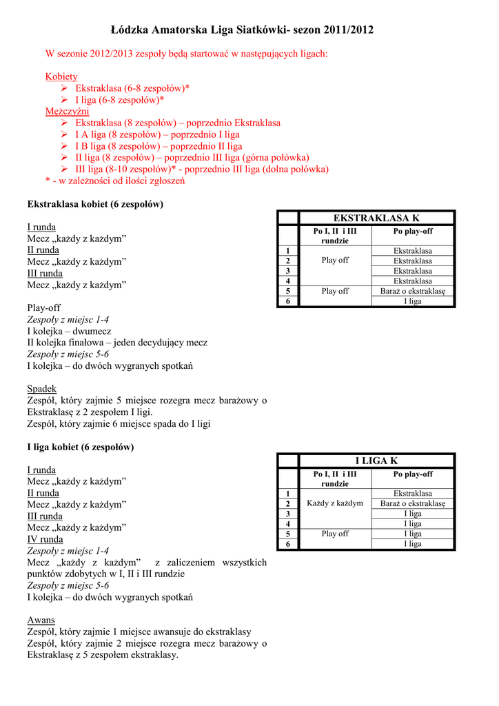 Łódzka Amatorska Liga Siatkówki- sezon 2011/2012 W sezonie 2012/2013 zespoły będą startować w następujących ligach: Kobiety Ekstraklasa (6-8 zespołów)* I liga (6-8 zespołów)* Mężczyźni Ekstraklasa (8 zespołów) – poprzednio Ekstraklasa I A liga (8 zespołów) – poprzednio I liga I B liga (8 zespołów) – poprzednio II liga II liga (8 zespołów) – poprzednio III liga (górna połówka) III liga (8-10 zespołów)* - poprzednio III liga (dolna połówka) * - w zależności od ilości zgłoszeń Ekstraklasa kobiet (6 zespołów) I runda Mecz „każdy z każdym” II runda Mecz „każdy z każdym” III runda Mecz „każdy z każdym” Play-off Zespoły z miejsc 1-4 I kolejka – dwumecz II kolejka finałowa – jeden decydujący mecz Zespoły z miejsc 5-6 I kolejka – do dwóch wygranych spotkań EKSTRAKLASA K Po I, II i III rundzie 1 2 3 4 5 6 Po play-off Ekstraklasa Ekstraklasa Ekstraklasa Ekstraklasa Baraż o ekstraklasę I liga Play off Play off Spadek Zespół, który zajmie 5 miejsce rozegra mecz barażowy o Ekstraklasę z 2 zespołem I ligi. Zespół, który zajmie 6 miejsce spada do I ligi I liga kobiet (6 zespołów) I runda Mecz „każdy z każdym” II runda Mecz „każdy z każdym” III runda Mecz „każdy z każdym” IV runda Zespoły z miejsc 1-4 Mecz „każdy z każdym” z zaliczeniem wszystkich punktów zdobytych w I, II i III rundzie Zespoły z miejsc 5-6 I kolejka – do dwóch wygranych spotkań Awans Zespół, który zajmie 1 miejsce awansuje do ekstraklasy Zespół, który zajmie 2 miejsce rozegra mecz barażowy o Ekstraklasę z 5 zespołem ekstraklasy. I LIGA K Po I, II i III rundzie 1 2 3 4 5 6 Każdy z każdym Play off Po play-off Ekstraklasa Baraż o ekstraklasę I liga I liga I liga I liga Ekstraklasa mężczyzn (8 zespołów) I runda i II runda Mecz i rewanż „każdy z każdym” Play-off Zespoły z miejsc 1-4 I kolejka – do dwóch wygranych spotkań II kolejka finałowa – jeden mecz Zespoły z miejsc 5-8 I kolejka – dwumecz II kolejka finałowa – dwumecz EKSTRAKLSA M Po I i II rundzie 1 2 3 4 5 6 7 8 Play off Play off Po play-off Ekstraklasa Ekstraklasa Ekstraklasa Ekstraklasa Ekstraklasa Baraż o ekstraklasę Baraż o ekstraklasę I A liga Spadek Zespół, który zajmie 6 miejsce rozegra mecz barażowy o Ekstraklasę z 3 zespołem I ligi. Zespół, który zajmie 7 miejsce rozegra mecz barażowy o Ekstraklasę z 2 zespołem I ligi. Zespół, który zajmie 8 miejsce spada do I A ligi I liga (8 zespołów) I runda i II runda Mecz i rewanż „każdy z każdym” Play-off I kolejka – dwumecz II kolejka finałowa – dwumecz Awans i spadek Zespół, który zajmie 1 miejsce awansuje do ekstraklasy Zespół, który zajmie 2 miejsce rozegra mecz barażowy o Ekstraklasę z 7 zespołem ekstraklasy. Zespół, który zajmie 3 miejsce rozegra mecz barażowy o Ekstraklasę z 6 zespołem ekstraklasy. Zespół, który zajmie 6 miejsce rozegra mecz barażowy o I A ligę z 3 zespołem II ligi. Zespół, który zajmie 7 miejsce rozegra mecz barażowy o I A ligę z 2 zespołem II ligi. Zespół, który zajmie 8 miejsce spada do I B ligi I LIGA Po I i II rundzie 1 2 3 4 5 6 7 8 Play off Play off Po play-off Ekstraklasa Baraż o ekstraklasę Baraż o ekstraklasę I A liga I A liga Baraż o I A Baraż o I A I B liga II liga (8 zespołów) I runda i II runda Mecz i rewanż „każdy z każdym” Play-off I kolejka – dwumecz II kolejka finałowa – dwumecz Awans i spadek Zespół, który zajmie 1 miejsce awansuje do I A ligi Zespół, który zajmie 2 miejsce rozegra mecz barażowy o I A ligę z 7 zespołem I ligi. Zespół, który zajmie 3 miejsce rozegra mecz barażowy o I A ligę z 6 zespołem I ligi. II LIGA Po I i II rundzie 1 2 3 4 5 6 7 8 Play off Play off Po play-off I A liga Baraż o I A Baraż o I A I B liga I B liga Baraż o I B Baraż o I B II liga Zespół, który zajmie 6 miejsce rozegra mecz barażowy o I B ligę z 3 zespołem III ligi. Zespół, który zajmie 7 miejsce rozegra mecz barażowy o I B ligę z 2 zespołem III ligi. Zespół, który zajmie 8 miejsce spada do II ligi III liga (16 zespołów) I runda „Każdy z każdym” jeden mecz II runda Zespoły z miejsc 1-4: mecz „każdy z każdym” z zaliczeniem wyników I rundy Zespoły z miejsc 5-12: Jedna runda play-off do dwóch wygranych spotkań o awans do II ligi Zespoły z miejsc 13-16: mecz „każdy z każdym” z zaliczeniem wyników I rundy Awans i spadek Zespół, który zajmie 1 miejsce awansuje do I B ligi Zespół, który zajmie 2 miejsce rozegra mecz barażowy o I B ligę z 7 zespołem II ligi. Zespół, który zajmie 3 miejsce rozegra mecz barażowy o I B ligę z 6 zespołem II ligi. Zespoły które wygrają rundę play-off awansują do II ligi Zespoły które przegrają rundę play-off zostają w III lidze Zespoły z miejsc 9 – 16 zostają w III lidze III LIGA po I rundzie 1 2 3 4 5 6 7 8 9 10 11 12 13 14 15 16 Każdy z każdym jeden mecz Jedna runda play-off do dwóch wygranych spotkań (5-12, 6-11, 7-10, 8-9) Zwycięzcy awansują do II ligi, przegrani zostają w III lidze Każdy z każdym jeden mecz po II rundzie I B liga Baraż o I B Baraż o I B II liga II liga II liga II liga II liga III liga III liga III liga III liga III liga III liga III liga III liga