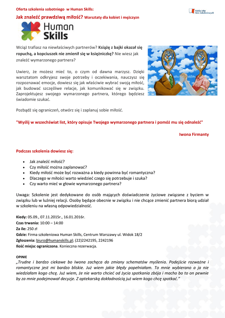Oferta szkolenia sobotniego w Human Skills: Jak znaleźć prawdziwą miłość? Warsztaty dla kobiet i mężczyzn Wciąż trafiasz na niewłaściwych partnerów? Książę z bajki okazał się ropuchą, a kopciuszek nie zmienił się w księżniczkę? Nie wiesz jak znaleźć wymarzonego partnera? Uwierz, że możesz mieć to, o czym od dawna marzysz. Dzięki warsztatom odkryjesz swoje potrzeby i oczekiwania, nauczysz się rozpoznawać emocje, dowiesz się jak właściwie wybrać swoją miłość, jak budować szczęśliwe relacje, jak komunikować się w związku. Zaprojektujesz swojego wymarzonego partnera, którego będziesz świadomie szukać. Pozbądź się ograniczeń, otwórz się i zaplanuj sobie miłość. "Wyślij w wszechświat list, który opisuje Twojego wymarzonego partnera i pomóż mu się odnaleźć" Iwona Firmanty Podczas szkolenia dowiesz się: Jak znaleźć miłość? Czy miłość można zaplanować? Kiedy miłość może być rozważna a kiedy powinna być romantyczna? Dlaczego w miłości warto wiedzieć czego się potrzebuje i szuka? Czy warto mieć w głowie wymarzonego partnera? Uwaga: Szkolenie jest dedykowane do osób mających doświadczenie życiowe związane z byciem w związku lub w luźniej relacji. Osoby będące obecnie w związku i nie chcące zmienić partnera biorą udział w szkoleniu na własną odpowiedzialność. Kiedy: 05.09., 07.11.2015r., 16.01.2016r. Czas trwania: 10:00 – 14:00 Za ile: 250 zł Gdzie: Firma szkoleniowa Human Skills, Centrum Warszawy ul. Widok 18/2 Zgłoszenia: [email protected]; (22)2242195, 2242196 Ilość miejsc ograniczona. Konieczna rezerwacja. OPINIE „Trudne i bardzo ciekawe bo Iwona zachęca do zmiany schematów myślenia. Podejście rozważne i romantyczne jest mi bardzo bliskie. Już wiem jakie błędy popełniałam. To mnie wybierano a ja nie wiedziałam kogo chcę. Już wiem, że nie warto chcieć od życia spotkania zbója i macho bo to on pewnie by za mnie podejmował decyzje. Z aptekarską dokładnością już wiem kogo chcę spotkać.” Oferta szkolenia sobotniego w Human Skills: UWODZENIE MĘŻCZYZN Z KLASĄ – JAK ZNALEŹĆ, OCZAROWAĆ I UTRZYMAĆ „TEGO JEDYNEGO” 10:00 - 10:15 Rozpoczęcie szkolenia. Omówienie celów i potrzeb uczestników pod celu jakim spotkanie wymarzone partnera. 10: 15- 11:15 Wymarzony partner i miłość - nasze nawyki myślenia o związkach Miłość. Czy warto liczyć na szczęśliwy traf pod kątem spotkania wymarzonego partnera? Miłość i jej brak. Jak zrozumieć tajemnicę długoletniej samotności? Dlaczego i po co trafiamy na niewłaściwych partnerów? Jakie skutki daje nam wewnętrzny chaos i brak świadomości tego, czego chcemy w życiu? Dlaczego emocje powodują, że w życiu wiążemy się z nieodpowiednimi partnerami? Miłość - kiedy i dlaczego bywa okrutna? 11:15 - 11:25 Przerwa kawowa 11:25 - 12:25 Wymarzony partner i miłość - przygotowanie strategiczne Miłość i chemia czyli jak zapachy i feromony pomagają w wyborze partnera? Miłość a strategiczne planowanie. Jakie uszy ma mieć mój wymarzony partner? Dlaczego warto być szczegółowych w spisaniu "zamówienia" na partnera? Jak opisać cechy charakteru, cechy fizyczne, cechy wewnętrzne itp. czyli to czego pragniemy? Czy chcesz partnera romantycznego czy rozważnego? Kim ma być nasz partner z którym zbuduję szczęśliwy związek? Jakie są skutki naszych wyborów? Jakie decyzje przy tworzeniu "zamówienie" na partnera musimy podając? Jak ustalać nasze priorytety i uczciwie powiedzieć sobie, czego oczekujemy? Czego my dla siebie chcemy a co nam wmawia społeczeństwo, rodzina? Jak nasz system życia ma się do "zamówienia" na konkretnego partnera? 12:25 - 12:35 Przerwa kawowa 12:35 - 13:40 Jak znaleźć miłość- przygotowanie "zamówienia" Praca z arkuszem "Miłość i mój wymarzony partner to..." Praca z arkuszem "Absolutnie nie życzę sobie..." Omówienie z trenerem wybranych list z podkreśleniem skutków. 13:40 - 14:00 Zakończenie szkolenia. Podsumowanie wniosków i weryfikacja planu działania pod kątem "Wymarzony partner". 2 Oferta szkolenia sobotniego w Human Skills: UWODZENIE MĘŻCZYZN Z KLASĄ – JAK ZNALEŹĆ, OCZAROWAĆ I UTRZYMAĆ „TEGO JEDYNEGO” TRENER: Iwona Firmanty Założyciel i Dyrektor Zarządzający Human Skills Założyciel projektu Sensualna Kobieta Biznesu Psycholog/ Socjolog/ Trener/ Coach Od lat realizuje szkolenia dla kobiet pracujących w korporacjach, administracji publicznej oraz osób prywatnych. Wśród Klientów realizujących szkolenia dla kobiet znalazły się m.in.: Ministerstwo Spraw Zagranicznych, EDF Polska S.A., Open Finance S.A., Procter&Gamble, Volkswagen Poznań, Atem Polska Sp. z o.o., Centrum Artystyczne Fabryka Trzciny, T.U. Euler Hermes S.A. Założyciel projektu Sensualna Kobieta Biznesu, który wspiera osobisty i zawodowy rozwój kobiet. Swoją wiedzę i doświadczenie wykorzystuje realizując projekty szkoleniowe oraz w pracy indywidualnej w zakresie coachingu. Z prawdziwą pasją pomaga kobietom tworzyć i porządkować świadome i satysfakcjonujące relacje oparte na zaufaniu, zrozumieniu i nieprzemijającej wzajemnej fascynacji. W trakcie coachingu diagnozuje główne trudności związków i określa sposoby pracy nad nimi. Autorka artykułów z nurtu psychologii. Wywiady z jej udziałem pojawiają się w miesięczniku „Zwierciadło”. Występuje w mediach m.in.: TVN, DDTVN, TVN Turbo, TTV, TVP2 „Panorama”, Polsat Cafe, Polsat, „Gazeta Wyborcza”, Wirtualna Polska, a także wypowiada się w radio. Ekspert z zakresu umiejętności interpersonalnych, efektywności osobistej, komunikacji, wystąpień publicznych i budowania relacji. Udziela wskazówek jak radzić sobie ze stresem, brakiem asertywności, kreatywnym podejmowaniem decyzji. Uczy jak efektywnie współpracować z innymi, jak być skutecznym liderem. Prowadziła szkolenia i projekty rozwojowe dla branży: Administracja publiczna: m.in.: Narodowy Bank Polski; Urz