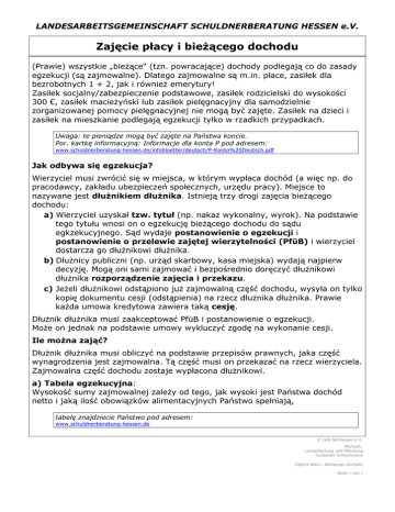 LANDESARBEITSGEMEINSCHAFT SCHULDNERBERATUNG HESSEN e.V. Zajęcie płacy i bieżącego dochodu (Prawie) wszystkie „bieżące“ (tzn. powracające) dochody podlegają co do zasady egzekucji (są zajmowalne). Dlatego zajmowalne są m.in. płace, zasiłek dla bezrobotnych 1 + 2, jak i również emerytury! Zasiłek socjalny/zabezpieczenie podstawowe, zasiłek rodzicielski do wysokości 300 €, zasiłek macieżyński lub zasiłek pielęgnacyjny dla samodzielnie zorganizowanej pomocy pielęgnacyjnej nie mogą być zajęte. Zasiłek na dzieci i zasiłek na mieszkanie podlegają egzekucji tylko w rzadkich przypadkach. Uwaga: te pieniądze mogą być zajęte na Państwa koncie. Por. kartkę informacyjną: Informacje dla konta P pod adresem: www.schuldnerberatung-hessen.de/infoblaetter/deutsch/P-Konto%20Deutsch.pdf Jak odbywa się egzekucja? Wierzyciel musi zwrócić się w miejsca, w którym wypłaca dochód (a więc np. do pracodawcy, zakładu ubezpieczeń społecznych, urzędu pracy). Miejsce to nazywane jest dłużnikiem dłużnika. Istnieją trzy drogi zajęcia bieżącego dochodu: a) Wierzyciel uzyskał tzw. tytuł (np. nakaz wykonalny, wyrok). Na podstawie tego tytułu wnosi on o egzekucję bieżącego dochodu do sądu egkzekucyjnego. Sąd wydaje postanowienie o egzekucji i postanowienie o przelewie zajętej wierzytelności (PfüB) i wierzyciel dostarcza go dłużnikowi dłużnika. b) Dłużnicy publiczni (np. urząd skarbowy, kasa miejska) wydają najpierw decyzję. Mogą oni sami zajmować i bezpośrednio doręczyć dłużnikowi dłużnika rozporządzenie zajęcia i przekazu. c) Jeżeli dłużnikowi odstąpiono już zajmowalną część dochodu, wysyła on tylko kopię dokumentu cesji (odstąpienia) na rzecz dłużnika dłużnika. Prawie każda umowa kredytowa zawiera taką cesję. Dłużnik dłużnika musi zaakceptować PfüB i postanowienie o egzekucji. Może on jednak na podstawie umowy wykluczyć zgodę na wykonanie cesji. Ile można zająć? Dłużnik dłużnika musi obliczyć na podstawie przepisów prawnych, jaka część wynagrodzenia jest zajmowalna. Tą część musi on przekazać na rzecz wierzyciela. Zajmowalna część dochodu zostaje wypłacona dłużnikowi. a) Tabela egzekucyjna: Wysokość sumy zajmowalnej zależy od tego, jak wysoki jest Państwa dochód netto i jaką ilość obowiązków alimentacyjnych Państwo spełniają, tabelę znajdziecie Państwo pod adresem: www.schuldnerberatung-hessen.de © LAG-SB Hessen e.V. Polnisch: Lohnpfändung und Pfändung laufenden Einkommens Zajęcie płacy i bieżącego dochodu Seite 1 von 2 LANDESARBEITSGEMEINSCHAFT SCHULDNERBERATUNG HESSEN e.V. Przykład 1: Znajdujecie się Państwo w związku małżeńskim, macie Państwo dwoje dzieci i zarabiacie miesięczne netto 2.000 €. Zajmowalna część płacy wynosi wtedy 21,49 €. Przykład 2: Jest pani niezamężna/ jest pan nieżonaty, dzieci brak, zarabiacie miesięcznie netto 1500 €. Zajmowalna część płacy wynosi wtedy 298,28 €. Jako prawny obowiązek alimentacyjny uwzględnia się alimenty płacone na dzieci, małżonków (w wypadku wyroku lub dokumentu notarialnego również na żyjących w separacji lub na rozwiedzionych), rodziców (np. przypadające koszty domu spokojnej starości i koszty pielęgnacji), jak również na partnerów z zarejestrowanych jednopłciowych związków partnerskich. Jeżeli rodzice nie są w związku małżeńskim, trzeba płacić również alimenty na małżonka u którego dziecko jest wychowywane, przynajmniej przez okres pierwszych trzech lat życia wspólnego dziecka. Dzieje się to w przypadku, jeżeli małżonek nie posiada wystarczającego własnego dochodu. Jeżeli dłużnikowi dłużnika nie są znane wszystkie obowiązki alimentacyjne (na podstawie wpisu na karcie podatkowej), dłużnik musi mu je dowieść (np. przez uznanie ojcostwa, wyrok rozwodowy), jak i dowieść faktu swoich rzeczywistych płatności. b) Części dochodu, które nie mogą być zajęte: Na poczet płacy mogą być zajęte: zwroty kosztów, zwroty wydatków, połowa wynagrodzenia za nadgodziny, dodatki za brudne warunki, zasiłek urlopowy w zwykłej wysokości i połowa dodatkowego wynagrodzenia z okazji święta Bożego Narodzenia (jednakże max. 500 €). Czy większa ilość dochodów może być zsumowana? Tylko dochody jednej osoby (np. emerytura lub płaca) mogą być zsumowane na podstawie wyroku sądu (względnie na zarządzenie wierzyciela publicznego). Przy podwójnych zarobkach wierzyciel wykonujący egzekucję może złożyć wniosek do sądu, tak aby małżonek wystarczająco zarabiający nie był brany pod uwagę w momencie obliczania obowiązku alimentacyjnego. Czy wierzyciel może dochodzić powiększenia zajmowalnej należności? Jeżeli miejsce ma żądanie dotyczące wypłacania bieżących alimentów, długów z tytułu alimentów z ostatnich 12 miesięcy lub odszkodowań z tytułu umyślnie popełnionego przestępstwa, wierzyciel może zająć więcej niż to, co wynika z tabeli egzekucyjnej. Potrzebuje on w tym celu wyroku sądu. Jednakże dłużnikowi musi być zapewnione minimum egzystencyjne – w razie potrzeby należy złożyć wniosek o ponowne sprawdzenie. Czy dłużnik może dochodzić pomniejszenia zajmowalnej należności? Na wniosek dłużnika sąd lub wierzyciel publiczny wykonujący egzekucję może rozstrzygnąć o tym, że należy ściągnąć mniej. Jest to możliwe, kiedy dłużnik dowiódł, że ze względów zawodowych i prywatnych ponosi on szczególnie wysokie (nieodzowne) koszty. Powiększone koszty związane z zawodem to np. wysokie koszty dojazdów do pracy lub koszty opieki nad dziećmi w wypadku samotnie wychowujących. Powiększone wydatki prywatne to np. powiększone koszty medykamentów i żywienia lub szczególne wydatki po rozłące/rozwodzie lub po zwolnieniu z aresztu. © LAG-SB Hessen e.V. Polnisch: Lohnpfändung und Pfändung laufenden Einkommens Zajęcie płacy i bieżącego dochodu Seite 2 von 2