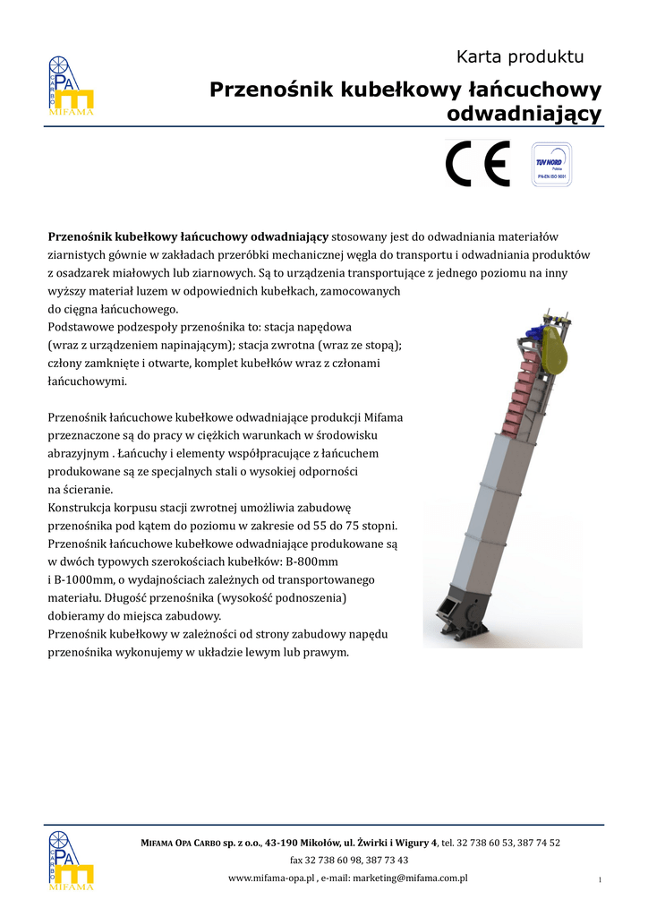 Karta produktu Przenośnik kubełkowy łańcuchowy odwadniający Przenośnik kubełkowy łańcuchowy odwadniający stosowany jest do odwadniania materiałów ziarnistych gównie w zakładach przeróbki mechanicznej węgla do transportu i odwadniania produktów z osadzarek miałowych lub ziarnowych. Są to urządzenia transportujące z jednego poziomu na inny wyższy materiał luzem w odpowiednich kubełkach, zamocowanych do cięgna łańcuchowego. Podstawowe podzespoły przenośnika to: stacja napędowa (wraz z urządzeniem napinającym); stacja zwrotna (wraz ze stopą); człony zamknięte i otwarte, komplet kubełków wraz z członami łańcuchowymi. Przenośnik łańcuchowe kubełkowe odwadniające produkcji Mifama przeznaczone są do pracy w ciężkich warunkach w środowisku abrazyjnym . Łańcuchy i elementy współpracujące z łańcuchem produkowane są ze specjalnych stali o wysokiej odporności na ścieranie. Konstrukcja korpusu stacji zwrotnej umożliwia zabudowę przenośnika pod kątem do poziomu w zakresie od 55 do 75 stopni. Przenośnik łańcuchowe kubełkowe odwadniające produkowane są w dwóch typowych szerokościach kubełków: B-800mm i B-1000mm, o wydajnościach zależnych od transportowanego materiału. Długość przenośnika (wysokość podnoszenia) dobieramy do miejsca zabudowy. Przenośnik kubełkowy w zależności od strony zabudowy napędu przenośnika wykonujemy w układzie lewym lub prawym. MIFAMA OPA CARBO sp. z o.o., 43-190 Mikołów, ul. Żwirki i Wigury 4, tel. 32 738 60 53, 387 74 52 fax 32 738 60 98, 387 73 43 www.mifama-opa.pl , e-mail: [email protected] 1