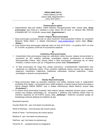 REGULAMIN AKCJI „Pakiet aplikacji od Intel” (zwany dalej „Regulaminem”) z dnia 19.07.2016 r. §1 Postanowienia ogólne 1. Organizatorem akcji pod hasłem „Pakiet Startowy Oprogramowania Intel” (zwana dalej „Akcją promocyjną”) jest Active.pl z siedzibą w Łodzi, adres: 92-116 Łódź, ul. Giewont 38A, REGON 473060843 NIP 727-110-69-84, (zwana dalej „Organizatorem”). §2 Termin i miejsce Akcji promocyjnej 1. Akcja promocyjna prowadzona jest na całym terytorium Rzeczypospolitej Polskiej we wszystkich Sklepach Media Markt i w sklepie internetowym www.mediamarkt.pl( zwane dalej „Sklep”, „Sklepy”). 2. Czas trwania Akcji promocyjnej obejmuje okres od dnia 20.07.2016 r. od godziny 00:01 do dnia 31.10.2016r. do godziny 23:59 lub do wyczerpania zapasów. §3 Uczestnicy Akcji promocyjnej 1. Uczestnikami Akcji promocyjnej mogą być: pełnoletnie osoby fizyczne, będące konsumentami w rozumieniu art. 221 kodeksu cywilnego, posiadające miejsce zamieszkania na terytorium Rzeczpospolitej Polskie, które wezmą udział w Akcji promocyjnej i zdecydują się na zakup Produktu, o którym mowa w §4 ust. 3 Regulaminu (zwane dalej "Uczestnikami"). 2. W Akcji promocyjnej nie mogą brać udziału pracownicy i przedstawiciele Organizatora oraz członkowie ich najbliższej rodziny. Przez członków najbliższej rodziny rozumie się: wstępnych, zstępnych, rodzeństwo, małżonków, małżonków rodzeństwa, rodziców małżonków i osoby pozostające w stosunku przysposobienia. §4 Zasady Akcji promocyjnej 1. Akcją promocyjną objęte są wszystkie notebooki oraz tablety dowolnej marki (z wyłączeniem produktów firmy Apple) z procesorami firmy Intel® dostępne w trakcie trwania Akcji promocyjnej w ofercie Sklepów MEDIA MARKT oraz w sklepie internetowym Media Markt.pl (zwane dalej „Produktami”). 2. W ramach Akcji promocyjnej Uczestnik, który dokona zakupu notebooka otrzyma kupon z kodem ukrytym pod zdrapką uprawniający do korzystania z platformy Intel Software Starter Pack od momentu rejestracji do 30.10.2016 (zwany dalej „Aplikacją”). Platforma umożliwia dostęp do bezpłatnego pobrania aplikacji lub dodatków do gier. Zawartość kuponów: Counter Strike GO – gra / kod steam do pobrania gry World of Warships – kod bonusowy dla nowych graczy World of Tanks – kod bonusowy dla nowych graczy Rainbow 6 - gra / kod steam do pobrania gry WarFace - gra / kod steam do pobrania gry Virtual Dj. 81. – oprogramowanie do ściągnięcia Magic FastCut - oprogramowanie do ściągnięcia Video Studio PRO X9 – oprogramowanie do ściągnięcia oraz aplikacje: Intel TrueKey, ooVoo, Magic YouCast, BeatBuddy 3. Wzór kuponów testowych stanowi załącznik nr 1 do niniejszego regulaminu. 4. Liczba kuponów promocyjnych jest ograniczona. 5. Wartość rynkowa Aplikacji wynosi 600 zł brutto na okres od momentu rejestracji do 20.07.2016. Cena Aplikacji wliczona w cenę Produktu. Po 30.10.2016 Aplikacja nieopłacona przez Uczestnika wygasa. 6. Uczestnikom Akcji promocyjnej nie przysługuje prawo do otrzymania ekwiwalentu pieniężnego w wysokości ceny Aplikacji ani zamiana Aplikacji na inny towar. 7. Uczestnik może brać udział w Akcji promocyjnej wielokrotnie, pod warunkiem każdorazowego spełnienia warunków przewidzianych w Regulaminie. 8. W przypadku zakupu Produktu w sklepie internetowym www.mediamarkt.pl o udziale w Akcji promocyjnej decyduje data zawarcia umowy zawartej na odległość tj. umowa zawarta zgodnie z Regulaminem Sklepu Internetowego www.mediamarkt.pl, Ogólnymi Warunkami Umowy Sprzedaży oraz Polityką prywatności. 9. Uczestnikom nie przysługuje prawo do zastrzeżenia szczególnych cech Produktów ani Aplikacji objętych Akcją promocyjną. 10. Wszelkie prawa zastrzeżone. Intel Inside, Intel Core, Ultrabook, Intel oraz logo Intel są znakami firmowymi firmy Intel Corporation w Stanach Zjednoczonych i/lub innych krajach. 11. Organizator nie jest operatorem strony starterpack.intel.com/softwareoffer oraz softwareoffer.intel.com 12. Akcja promocyjna może być łączona z innymi Akcjami promocyjnymi. 1. 2. 3. 1. 2. 3. 4. 5. 6. 7. §5 Odpowiedzialność Organizator Promocji nie ponosi odpowiedzialności za niedoręczenie Nagrody z powodów niezależnych od organizatora, zależnych od sklepu czy osób trzecich. Organizator nie ponosi odpowiedzialności za nieprawidłowości, związane z opóźnieniem w dystrybucji kuponów wewnątrz sieci handlowej. Odpowiedzialność Organizatora ograniczona jest względem Uczestnika do wysokości zwrotu kosztów zakupu Produktu Promocyjnego. §6 Reklamacje i wymiana towarów Wszelkie reklamacje winny być wysłane drogą pocztową na adres Organizatora w terminie do 30 marca 2016 r. O zachowaniu terminu do składania reklamacji decyduje data doręczenia reklamacji na adres Organizatora. Pisemne reklamacje powinny zawierać imię, nazwisko, dokładny adres uczestnika jak również dokładny opis i wskazanie przyczyny ewentualnych nieprawidłowości. Zgłoszone reklamacje rozpatrywane są przez Organizatora w terminie 14 dni od dnia ich doręczenia, nie później jednak niż do 30 listopada 2016 r. Decyzja Organizatora w przedmiocie reklamacji jest ostateczna i wiążąca. Uczestnik o decyzji Organizatora zostanie powiadomiony listownie na adres podany na formularzu zgłoszeniowym w terminie 14 dni od daty rozpatrzenia reklamacji. Reklamacje dotyczące Produktu mogą być składane w dowolnym Sklepie Media Markt. Uczestnikowi, który dokonał zakupu Produktu w Sklepie Media Markt, przysługuje możliwość wymiany lub zwrotu. Zasady wymiany i zwrotu Produktu obowiązujące u Organizatora zostały określone w odrębnym dokumencie dostępnym w Sklepach Media Markt (sklepy stacjonarne). W przypadku zwrotu Produktu, zgodnie z Warunkami wymiany towaru dostępnymi w Sklepach Media Markt, Uczestnik otrzymuje zwrot ceny zakupu Produktu obowiązującej w ramach Akcji promocyjnej. Jeżeli Uczestnik dokonuje zwrotu Produktu, na zas