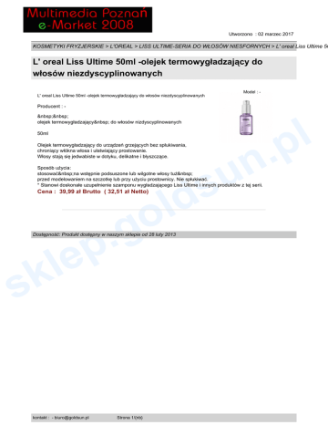 Utworzono : 02 marzec 2017 KOSMETYKI FRYZJERSKIE > L'OREAL > LISS ULTIME-SERIA DO WŁOSÓW NIESFORNYCH > L' oreal Liss Ultime 50 L' oreal Liss Ultime 50ml -olejek termowygładzający do włosów niezdyscyplinowanych Model : - L' oreal Liss Ultime 50ml -olejek termowygładzający do włosów niezdyscyplinowanych Producent : olejek termowygładzający do włosów nizdyscyplinowanych 50ml n u Olejek termowygładzający do urządzeń grzejących bez spłukiwania, chroniący włókna włosa i ułatwiający prostowanie. Włosy stają się jedwabiste w dotyku, delikatne i błyszczące. s ld Sposób użycia: stosować na wstępnie podsuszone lub wilgotne włosy tuż przed modelowaniem na szczotkę lub przy użyciu prostownicy. Nie spłukiwać. * Stanowi doskonałe uzupełnienie szamponu wygładzającego Liss Ultime i innych produktów z tej serii. Cena : 39,99 zł Brutto ( 32,51 zł Netto) p le o .g Dostępność: Produkt dostępny w naszym sklepie od 28 luty 2013 k s kontakt : - [email protected] Strona 1/{nb} l .p