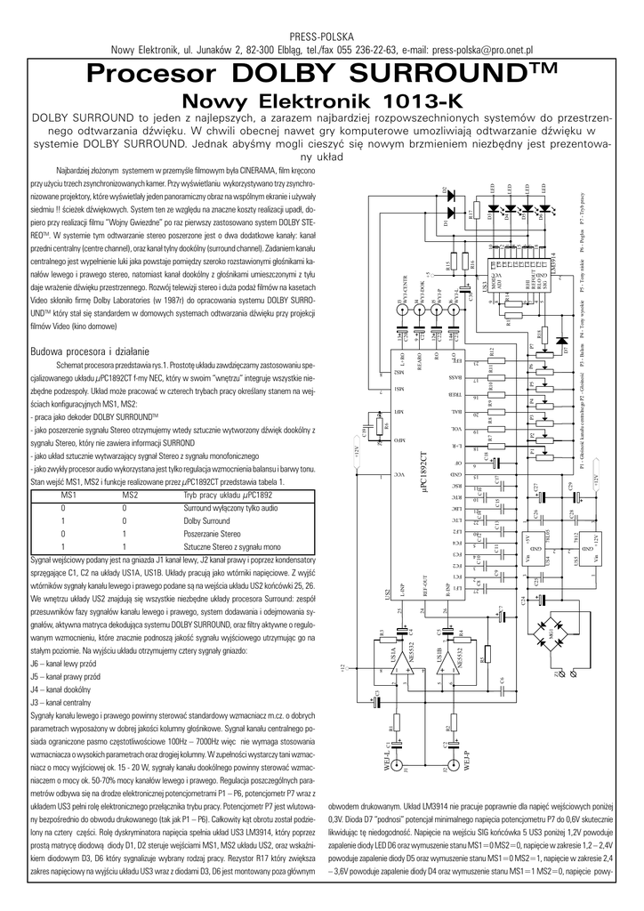 PRESS-POLSKA Nowy Elektronik, ul. Junaków 2, 82-300 Elbl¹g, tel./fax 055 236-22-63, e-mail: [email protected] Procesor DOLBY SURROUNDTM Nowy Elektronik 1013-K P7 - Tryb pracy LED P6 - Pog³os P5 - Tony niskie LM3914 P4 - Tony wysokie D7 P1 - G³onoæ kana³u centralnego P2 - G³onoæ P6 P5 P4 P3 P2 P1 C29 C27 +12V 3 Vin FC2 3 FC1 2 C8 C25 1 US5 US4 FC3 4 Vin 7812 78L05 +5V C11 3 FC4 5 C10 C28 C26 C13 LF2 30 C12 1 C14 LTC 22 LF1 NE5532 US1B MG1 Z1 C6 6 R2 WEJ-P C2 J2 J1 WEJ-L C1 R1 C3 5 8 3 4 2 C7 26 7 R4 C5 24 NE5532 US1A 1 R3 C4 25 C24 27 R-INP C15 LBC 21 R5 1 RTC 10 REF-OUT P3 - Balans P7 R18 R13 R12 R11 R10 R9 C16 VCC L-INP C17 RSC 11 US2 R8 R7 GND 15 C9 µPC1892CT OF 28 +12 C18 MFO L+R 18 C19 19 GND 2 29 VOL 6 2 MFI R6 BAL 20 7 +12V TREB 16 8 MS1 Sygna³ wejciowy podany jest na gniazda J1 kana³ lewy, J2 kana³ prawy i poprzez kondensatory sprzêgaj¹ce C1, C2 na uk³ady US1A, US1B. Uk³ady pracuj¹ jako wtórniki napiêciowe. Z wyjæ wtórników sygna³y kana³u lewego i prawego podane s¹ na wejcia uk³adu US2 koñcówki 25, 26. We wnêtrzu uk³ady US2 znajduj¹ siê wszystkie niezbêdne uk³ady procesora Surround: zespó³ przesuwników fazy sygna³ów kana³u lewego i prawego, system dodawania i odejmowania sygna³ów, aktywna matryca dekoduj¹ca systemu DOLBY SURROUND, oraz filtry aktywne o regulowanym wzmocnieniu, które znacznie podnosz¹ jakoæ sygna³u wyjciowego utrzymuj¹c go na GND MS2 BASS 17 Stan wejæ MS1, MS2 i funkcje realizowane przez µPC1892CT przedstawia tabela 1. MS1 MS2 Tryb pracy uk³adu µPC1892 0 0 Surround wy³¹czony tylko audio 1 0 Dolby Surround 0 1 Poszerzanie Stereo 1 1 Sztuczne Stereo z sygna³u mono EFF ciach konfiguracyjnych MS1, MS2: - praca jako dekoder DOLBY SURROUNDTM - jako poszerzenie sygna³u Stereo otrzymujemy wtedy sztucznie wytworzony dwiêk dookólny z sygna³u Stereo, który nie zawiera informacji SURROND - jako uk³ad sztucznie wytwarzaj¹cy sygna³ Stereo z sygna³u monofonicznego - jako zwyk³y procesor audio wykorzystana jest tylko regulacja wzmocnienia balansu i barwy tonu. 23 Schemat procesora przedstawia rys.1. Prostotê uk³adu zawdziêczamy zastosowaniu specjalizowanego uk³adu µPC1892CT f-my NEC, który w swoim wnêtrzu integruje wszystkie niezbêdne podzespo³y. Uk³ad mo¿e pracowaæ w czterech trybach pracy okrelany stanem na wej- +12V LED LED D6 D5 10 11 12 13 14 15 16 17 18 1 MOD ADJ J6 WYJ-L 14 C23 LO 9 8 J5 WYJ-P 12 C22 RO US3 J4 WYJ-DOK 9 C21 REARO C30 J3 WYJ-CENTR 3 13 C20 L10 L9 L8 R14 L7 L6 L5 6 RHI L4 7 REFOUT L3 4 RLO L2 5 SIG L1 R16 R15 +5 VCC L+RO GND Budowa procesora i dzia³anie uk³adem US3 pe³ni rolê elektronicznego prze³¹cznika trybu pracy. Potencjometr P7 jest wlutowany bezporednio do obwodu drukowanego (tak jak P1 P6). Ca³kowity k¹t obrotu zosta³ podzielony na cztery czêci. Rolê dyskryminatora napiêcia spe³nia uk³ad US3 LM3914, który poprzez prost¹ matrycê diodow¹ diody D1, D2 steruje wejciami MS1, MS2 uk³adu US2, oraz wskanikiem diodowym D3, D6 który sygnalizuje wybrany rodzaj pracy. Rezystor R17 który zwiêksza zakres napiêciowy na wyjciu uk³adu US3 wraz z diodami D3, D6 jest montowany poza g³ównym 2 filmów Video (kino domowe) parametrach wyposa¿ony w dobrej jakoci kolumny g³onikowe. Sygna³ kana³u centralnego posiada ograniczone pasmo czêstotliwociowe 100Hz 7000Hz wiêc nie wymaga stosowania wzmacniacza o wysokich parametrach oraz drogiej kolumny. W zupe³noci wystarczy tani wzmacniacz o mocy wyjciowej ok. 15 - 20 W, sygna³y kana³u dookólnego powinny sterowaæ wzmacniaczem o mocy ok. 50-70% mocy kana³ów lewego i prawego. Regulacja poszczególnych parametrów odbywa siê na drodze elektronicznej potencjometrami P1 P6, potencjometr P7 wraz z D4 D1 przedni centralny (centre channel), oraz kana³ tylny dookólny (surround channel). Zadaniem kana³u centralnego jest wype³nienie luki jaka powstaje pomiêdzy szeroko rozstawionymi g³onikami kana³ów lewego i prawego stereo, natomiast kana³ dookólny z g³onikami umieszczonymi z ty³u daje wra¿enie dwiêku przestrzennego. Rozwój telewizji stereo i du¿a poda¿ filmów na kasetach Video sk³oni³o firmê Dolby Laboratories (w 1987r) do opracowania systemu DOLBY SURROUNDTM który sta³ siê standardem w domowych systemach odtwarzania dwiêku przy projekcji sta³ym poziomie. Na wyjciu uk³adu otrzymujemy cztery sygna³y gniazdo: J6 kana³ lewy przód J5 kana³ prawy przód J4 kana³ dookólny J3 kana³ centralny Sygna³y kana³u lewego i prawego powinny sterowaæ standardowy wzmacniacz m.cz. o dobrych D3 R17 D2 Najbardziej z³o¿onym systemem w przemyle filmowym by³a CINERAMA, film krêcono przy u¿yciu trzech zsynchronizowanych kamer. Przy wywietlaniu wykorzystywano trzy zsynchronizowane projektory, które wywietla³y jeden panoramiczny obraz na wspólnym ekranie i u¿ywa³y siedmiu !! cie¿ek dwiêkowych. System ten ze wzglêdu na znaczne koszty realizacji upad³, dopiero przy realizacji filmu Wojny Gwiezdne po raz pierwszy zastosowano system DOLBY STEREOTM. W systemie tym odtwarzanie stereo poszerzone jest o dwa dodatkowe kana³y: kana³ LED DOLBY SURROUND to jeden z najlepszych, a zarazem najbardziej rozpowszechnionych systemów do przestrzennego odtwarzania dwiêku. W chwili obecnej nawet gry komputerowe umozliwiaj¹ odtwarzanie dwiêku w systemie DOLBY SURROUND. Jednak abymy mogli cieszyæ siê nowym brzmieniem niezbêdny jest prezentowany uk³ad Rys. 1 Schemat ideowy procesora DOLBY SURROUNDTM obwodem drukowanym. Uk³ad LM3914 nie pracuje poprawnie dla napiêæ wejciowych poni¿ej 0,3V. Dioda D7 podnosi potencja³ minimalnego napiêcia potencjometru P7 do 0,6V skutecznie likwiduj¹c tê niedogodnoæ. Napiêcie na wejciu SIG koñcówka 5 US3 poni¿ej 1,2V powoduje zapalenie diody LED D6 oraz wymuszenie stanu MS1=0 MS2=0, napiêcie w zakresie 1,2 2,4V powoduje zapalenie diody D5 oraz wymuszenie stanu MS1=0 MS2=1, napiêcie w zakresie 2,4 3,6V powoduje zapalenie diody D4 oraz wymuszenie stanu MS1=1 MS2=0, napiêcie pow
