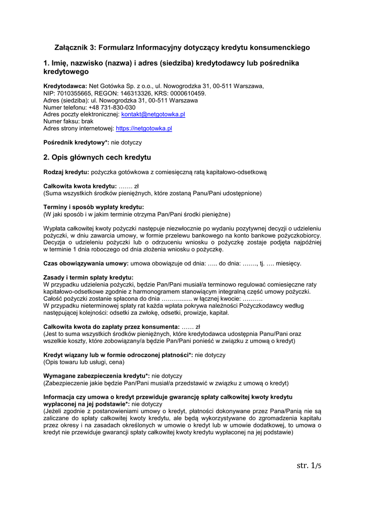 Załącznik 3: Formularz Informacyjny dotyczący kredytu konsumenckiego 1. Imię, nazwisko (nazwa) i adres (siedziba) kredytodawcy lub pośrednika kredytowego Kredytodawca: Net Gotówka Sp. z o.o., ul. Nowogrodzka 31, 00-511 Warszawa, NIP: 7010355665, REGON: 146313326, KRS: 0000610459. Adres (siedziba): ul. Nowogrodzka 31, 00-511 Warszawa Numer telefonu: +48 731-830-030 Adres poczty elektronicznej: [email protected] Numer faksu: brak Adres strony internetowej: https://netgotowka.pl Pośrednik kredytowy*: nie dotyczy 2. Opis głównych cech kredytu Rodzaj kredytu: pożyczka gotówkowa z comiesięczną ratą kapitałowo-odsetkową Całkowita kwota kredytu: ……. zł (Suma wszystkich środków pieniężnych, które zostaną Panu/Pani udostępnione) Terminy i sposób wypłaty kredytu: (W jaki sposób i w jakim terminie otrzyma Pan/Pani środki pieniężne) Wypłata całkowitej kwoty pożyczki następuje niezwłocznie po wydaniu pozytywnej decyzji o udzieleniu pożyczki, w dniu zawarcia umowy, w formie przelewu bankowego na konto bankowe pożyczkobiorcy. Decyzja o udzieleniu pożyczki lub o odrzuceniu wniosku o pożyczkę zostaje podjęta najpóźniej w terminie 1 dnia roboczego od dnia złożenia wniosku o pożyczkę. Czas obowiązywania umowy: umowa obowiązuje od dnia: ….. do dnia: ……., tj. …. miesięcy. Zasady i termin spłaty kredytu: W przypadku udzielenia pożyczki, będzie Pan/Pani musiał/a terminowo regulować comiesięczne raty kapitałowo-odsetkowe zgodnie z harmonogramem stanowiącym integralną część umowy pożyczki. Całość pożyczki zostanie spłacona do dnia ………....... w łącznej kwocie: ………. W przypadku nieterminowej spłaty rat każda wpłata pokrywa należności Pożyczkodawcy według następującej kolejności: odsetki za zwłokę, odsetki, prowizje, kapitał. Całkowita kwota do zapłaty przez konsumenta: …… zł (Jest to suma wszystkich środków pieniężnych, które kredytodawca udostępnia Panu/Pani oraz wszelkie koszty, które zobowiązany/a będzie Pan/Pani ponieść w związku z umową o kredyt) Kredyt wiązany lub w formie odroczonej płatności*: nie dotyczy (Opis towaru lub usługi, cena) Wymagane zabezpieczenia kredytu*: nie dotyczy (Zabezpieczenie jakie będzie Pan/Pani musiał/a przedstawić w związku z umową o kredyt) Informacja czy umowa o kredyt przewiduje gwarancję spłaty całkowitej kwoty kredytu wypłaconej na jej podstawie*: nie dotyczy (Jeżeli zgodnie z postanowieniami umowy o kredyt, płatności dokonywane przez Pana/Panią nie są zaliczane do spłaty całkowitej kwoty kredytu, ale będą wykorzystywane do zgromadzenia kapitału przez okresy i na zasadach określonych w umowie o kredyt lub w umowie dodatkowej, to umowa o kredyt nie przewiduje gwarancji spłaty całkowitej kwoty kredytu wypłaconej na jej podstawie) str. 1/5 3. Koszty kredytu Stopa oprocentowania kredytu oraz warunki jej zmiany: 10% w skali roku Odsetki maksymalne (dwukrotność odsetek ustawowych) zgodnie z art. 359 Ustawy Kodeks Cywilny. Stopa oprocentowania jest zmienna. Może się zmienić w wyniku zmiany stopy referencyjnej NBP. Zmniejszenie wysokości stopy oprocentowania pożyczki obowiązuje od bieżącego okresu (raty), w którym nastąpiło zmniejszenie stopy oprocentowania. Zwiększenie wysokości stopy oprocentowania pożyczki obowiązuje od okresu (raty) następującego po okresie, w którym nastąpiło zwiększenie stopy oprocentowania. W przypadku zmiany stopy oprocentowania pożyczki wysokość poszczególnych rat ulegnie zmianie, a Pożyczkodawca dostarczy na adres poczty elektronicznej Pożyczkobiorcy nowy zaktualizowany harmonogram spłaty rat, który jako załącznik nr 4 stanowi integralną część umowy pożyczki. Rzeczywista roczna stopa oprocentowania: …… % (Jest to całkowity koszt kredytu ponoszony przez konsumenta, wyrażony jako wartość procentowa całkowitej kwoty kredytu w stosunku rocznym przedstawiona aby pomóc Panu/Pani w porównaniu oferowanych kredytów) Założenia przyjęte do obliczenia rzeczywistej rocznej stopy oprocentowania: 1. Datą początkową będzie data wypłaty pożyczki. 2. Odstępy czasu między datami używanymi w obliczeniach są przyjmowane jako rzeczywista liczba miesięcy pomiędzy wypłatą pożyczki a terminami jej spłat. 3. Wynik obliczeń podany został z dokładnością do co najmniej jednego miejsca po przecinku, przy czym jeżeli cyfra występująca po wybranym przez obliczającego miejscu po przecinku jest mniejsza niż 5, cyfrę tę pomija się, gdy zaś jest większa albo równa 5, cyfrę poprzedzającą zwiększa się o 1. 4. Całkowita kwota pożyczki została wypłacone od razu i w całości w dniu zawarcia umowy pożyczki. Obowiązek zawarcia umowy dodatkowej: nie (Do uzyskania kredytu konieczne jest zawarcie przez Pana/Panią umowy dodatkowej, w szczególności umowy ubezpieczenia lub innej umowy) Rodzaj ubezpieczenia oraz jego koszt: nie dotyczy Obowiązek skorzystania z usługi dodatkowej: nie Rodzaj usługi dodatkowej oraz jej koszt: nie dotyczy Koszty, które zobowiązany/a będzie Pan/Pani ponieść w związku z umową o kredyt*: Odsetki zgodnie ze stopą oprocentowania pożyczki (10%): ……………. zł (odsetkowe koszty pożyczki regulowane przez art. 359 Ustawy Kodeks Cywilny). Prowizja za udzielenie pożyczki: 25% kwoty pożyczki, co stanowi: …… zł (pozaodsetkowe koszty pożyczki regulowane przez art. 36a Ustawy o kredycie konsumenckim). Prowizja związana z okresem trwania pożyczki: 30% w skali roku, co stanowi: …….. zł (pozaodsetkowe koszty pożyczki regulowane przez art. 36a Ustawy o kredycie konsumenckim). Koszty prowadzenia jednego lub kilku rachunków w celu dokonywania wpłat i wypłat środków pieniężnych*: nie dotyczy Koszty korzystania z kart kredytowych*: nie dotyczy Inne koszty, które konsument zobowiązany jest ponieść w związku z umową*: a) jednorazowa opłata weryfikacyjna: 0,01 zł (rejestrując się w serwisie netGotówka