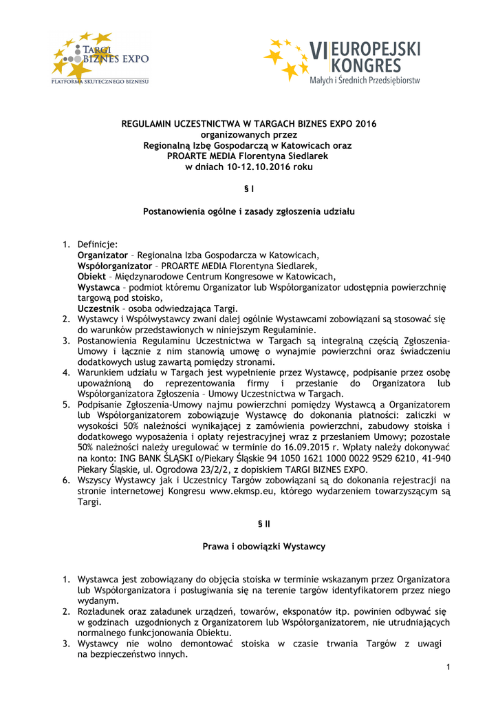 REGULAMIN UCZESTNICTWA W TARGACH BIZNES EXPO 2016 organizowanych przez Regionalną Izbę Gospodarczą w Katowicach oraz PROARTE MEDIA Florentyna Siedlarek w dniach 10-12.10.2016 roku §I Postanowienia ogólne i zasady zgłoszenia udziału 1. Definicje: Organizator – Regionalna Izba Gospodarcza w Katowicach, Współorganizator – PROARTE MEDIA Florentyna Siedlarek, Obiekt – Międzynarodowe Centrum Kongresowe w Katowicach, Wystawca – podmiot któremu Organizator lub Współorganizator udostępnia powierzchnię targową pod stoisko, Uczestnik – osoba odwiedzająca Targi. 2. Wystawcy i Współwystawcy zwani dalej ogólnie Wystawcami zobowiązani są stosować się do warunków przedstawionych w niniejszym Regulaminie. 3. Postanowienia Regulaminu Uczestnictwa w Targach są integralną częścią ZgłoszeniaUmowy i łącznie z nim stanowią umowę o wynajmie powierzchni oraz świadczeniu dodatkowych usług zawartą pomiędzy stronami. 4. Warunkiem udziału w Targach jest wypełnienie przez Wystawcę, podpisanie przez osobę upoważnioną do reprezentowania firmy i przesłanie do Organizatora lub Współorganizatora Zgłoszenia – Umowy Uczestnictwa w Targach. 5. Podpisanie Zgłoszenia-Umowy najmu powierzchni pomiędzy Wystawcą a Organizatorem lub Współorganizatorem zobowiązuje Wystawcę do dokonania płatności: zaliczki w wysokości 50% należności wynikającej z zamówienia powierzchni, zabudowy stoiska i dodatkowego wyposażenia i opłaty rejestracyjnej wraz z przesłaniem Umowy; pozostałe 50% należności należy uregulować w terminie do 16.09.2015 r. Wpłaty należy dokonywać na konto: ING BANK ŚLĄSKI o/Piekary Śląskie 94 1050 1621 1000 0022 9529 6210, 41-940 Piekary Śląskie, ul. Ogrodowa 23/2/2, z dopiskiem TARGI BIZNES EXPO. 6. Wszyscy Wystawcy jak i Uczestnicy Targów zobowiązani są do dokonania rejestracji na stronie internetowej Kongresu www.ekmsp.eu, którego wydarzeniem towarzyszącym są Targi. § II Prawa i obowiązki Wystawcy 1. Wystawca jest zobowiązany do objęcia stoiska w terminie wskazanym przez Organizatora lub Współorganizatora i posługiwania się na terenie targów identyfikatorem przez niego wydanym. 2. Rozładunek oraz załadunek urządzeń, towarów, eksponatów itp. powinien odbywać się w godzinach uzgodnionych z Organizatorem lub Współorganizatorem, nie utrudniających normalnego funkcjonowania Obiektu. 3. Wystawcy nie wolno demontować stoiska w czasie trwania Targów z uwagi na bezpieczeństwo innych. 1 4. Wystawca zobowiązany jest do przestrzegania przepisów BHP i ppoż, regulaminu Obiektu, zarządzeń i zaleceń właściwych służb - w szczególności Policji, Straży Pożarnej oraz ratownictwa medycznego. 5. Wszystkie osoby wchodzące na teren Obiektu mogą zostać poddane czynnościom kontrolnym. Na teren Obiektu nie zostaną wpuszczone osoby, których wygląd lub zachowanie wzbudza podejrzenie, że pozostają pod wpływem alkoholu / środków odurzających lub mogą zagrażać bezpieczeństwu. 6. Prawa Wystawcy co do najmu powierzchni nie mogą być przekazane na żadną inną firmę ani osobę bez zgody Organizatora lub Współorganizatora i wniesienia opłat. Wystawca ponosi odpowiedzialność za wszystkie działania Współwystawców. 7. Wystawca ma prawo wystawiać swoje produkty wyłącznie w ramach stoiska pod warunkiem, że przedmioty nie zasłonią sąsiednich stoisk. Aranżacja stoiska powinna odbywać się bez ingerencji w ściany i stelaż elementów zabudowy i wyposażenia Organizatora. Reklama świetlna lub dźwiękowa jest możliwa tylko za zgodą i wiedzą Organizatora lub Współorganizatora. 8. Wystawcy nie wolno korzystać z powierzchni targowej w sposób niezgodny z jej właściwościami i przeznaczeniem oraz w sposób wykraczający poza normalne sposoby używania. 9. Materiały informacyjne i reklamowe wykorzystywane podczas Targów przez Wystawcę nie mogą zawierać treści obraźliwych, prowokacyjnych, rasistowskich, a także nie mogą naruszać dóbr osobistych, uczuć religijnych oraz godności osób trzecich. 10. Każdy Uczestnik Targów powinien zachowywać się w sposób zgodny z zasadami kultury i normami społecznymi, a swoim zachowaniem nie może utrudniać przeprowadzenia Imprezy. 11. Na terenie Obiektu zabronione jest: prowadzenie bez zgody Organizatora lub Współorganizatora działalności handlowej, rozdawanie ulotek i materiałów reklamowych a także prowadzenie agitacji i zbiórek, pozostawianie eksponatów będących urządzeniami lub maszynami w stanie umożliwiającym ich uruchomienie przez osoby nieuprawnione, pozostawianie bez należytego zabezpieczenia substancji mogących powodować samozapłon, wnoszenie na teren Obiektu napojów alkoholowych, substancji odurzających oraz broni i innych przedmiotów niebezpiecznych, wprowadzanie zwierząt, palenie tytoniu- poza miejscami do tego wyznaczonymi, zaśmiecanie terenu Obiektu. 12. Wystawca zobowiązuje się do umożliwienia dostępu do zajmowanej powierzchni targowej na każde żądanie podmiotów uprawnionych do wykonywania czynności kontrolnych. 13. Wystawcy nie wolno wykorzystywać wizualizacji Obiektu lub jego znaku towarowego w celach komercyjnych bez zgody Organizatora, w szczególności podejmować działań lub zaniechań informacyjnych, promocyjnych, reklamowych lub podobnych, poprzez które Zleceniodawca mógłby wywołać wrażenie, że jest oficjalnym sponsorem, partnerem, dostawcą lub jest w jakikolwiek inny sposób związany z Obiektem. 14. W czasie trwania Targów Organizator, Współorganizator, Właściciel lub Operator Obiektu mogą przeprowadzać sesje fotograficzne i video. Uczestnictwo w Targach jest równoznaczne z wyrażeniem zgody na wykorzystywanie wizerunku każdego z Wystawców i Uczestników w materiałach informacyjnych i promocyjnych. 15. Wystawca ma prawo odwołać udział w targach jedynie na 30 dni przed rozpoczęciem imprezy. Rezygnacja powoduje przepadek wpłaconej zaliczki. Odwołanie udziału 