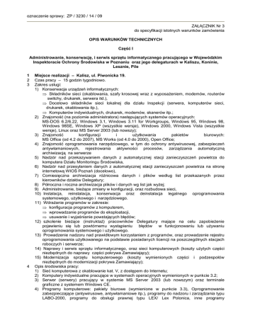 oznaczenie sprawy: ZP / 3230 / 14 / 09 ZAŁĄCZNIK Nr 3 do specyfikacji istotnych warunków zamówienia OPIS WARUNKÓW TECHNICZNYCH Część I Administrowanie, konserwację, i serwis sprzętu informatycznego pracującego w Wojewódzkim Inspektoracie Ochrony Środowiska w Poznaniu oraz jego delegaturach w Kaliszu, Koninie, Lesznie, Pile 1 2 3 4 Miejsce realizacji – Kalisz, ul. Piwonicka 19. Czas pracy – 15 godzin tygodniowo. Zakres usługi: 1) Konserwacja urządzeń informatycznych: Składników sieci (okablowania, szafy krosowej wraz z wyposażeniem, modemów, routerów switchy, drukarek, serwera itd.), Docelowo składników sieci lokalnej dla działu Inspekcji (serwera, komputerów sieci, drukarek, okablowania itp.), Komputerów indywidualnych, drukarek, modemów, skanerów itp.; 2) Znajomość (na poziomie administratora) następujących systemów operacyjnych: MS-DOS 6.2/6.22, Windows 3.1, Windows 3.11 for Workgroups, Windows 95, Windows 98, Windows 98SE, Windows XP (wszystkie wersje), Windows 2000, Windows Vista (wszystkie wersje), Linux oraz MS Server 2003 (lub nowszy); 3) Znajomość konfiguracji i użytkowania pakietów biurowych: MS Office (od 4.2 do 2007), MS Works (od 4.0 do 2000), Open Office; 4) Znajomość oprogramowania narzędziowego, w tym do ochrony antywirusowej, zabezpieczeń antywłamaniowych, rejestrowania aktywności procesów, zarządzania automatyczną archiwizacją na serwerze 5) Nadzór nad przekazywaniem danych z automatycznej stacji zanieczyszczeń powietrza do komputera Działu Monitoringu Środowiska, 6) Nadzór nad przesyłaniem danych z automatycznej stacji zanieczyszczeń powietrza na stronę internetową WIOŚ Poznań (docelowo), 7) Comiesięczna archiwizacja różnicowa danych i plików według list przekazanych przez kierowników działów Delegatury; 8) Półroczna i roczna archiwizacja plików i danych wg list jak wyżej; 9) Administrowanie, bieżące zmiany w konfiguracji, oraz rozbudowa sieci, 10) Instalacja, reinstalacja, konserwacja oraz deinstalacja legalnego oprogramowania systemowego, użytkowego i narzędziowego. 11) Wdrażanie programów w zakresie: konfiguracja programów z komputerem, wprowadzanie programów do eksploatacji, usuwanie i wyjaśnianie powstających błędów; 12) szkolenie bieżące (instruktaż) pracowników Delegatury mające na celu zapobieżenie pojawieniu się lub powtórnemu wystąpieniu błędów w funkcjonowaniu lub używaniu oprogramowania systemowego i użytkowego. 13) Prowadzenie nadzoru nad prawidłowym korzystaniem z programów, oraz prowadzenie rejestru oprogramowania użytkowanego na podstawie posiadanych licencji na poszczególnych stacjach roboczych i serwerze; 14) Naprawy i serwis sprzętu informatycznego, oraz sieci komputerowych (koszty użytych części niezbędnych do naprawy części pokrywa Zamawiający); 15) Modernizacja sprzętu komputerowego (koszty wymienionych części i podzespołów niezbędnych do modernizacji pokrywa Zamawiający); Opis środowiska pracy: 1) Sieć komputerowa z okablowanie kat. V, z dostępem do Internetu; 2) Komputery indywidualne pracujące w systemach operacyjnych wymienionych w punkcie 3.2; 3) Serwer (serwery) pracujący w systemie MS Server 2003 (lub nowszym) oraz terminale graficzne z systemem Windows CE. 4) Programy komputerowe: pakiety biurowe (wymienione w punkcie 3.3), Oprogramowanie zabezpieczające (antywirusowe, antywłamaniowe itp.), programy do nadzoru i zarządzania typu LABO-2000, programy do obsługi prawnej typu LEX/ Lex Polonica, inne programy oznaczenie sprawy: ZP / 3230 / 14 / 09 specjalistyczne, jak Np. program KARY (naliczanie kar pieniężnych), docelowo także program do zarządzania obiegiem dokumentów w urzędzie, 5 Opis sprzętu objętego usługą: 1) Sieć składająca się z okablowania, szafy krosowej z wyposażeniem i (docelowo) serwera; 2) Komputery (różne typy i konfiguracje) w liczbie do 40 szt., pracujące jako indywidualne, sprzężone z aparaturą analityczną oraz w sieci; 3) Serwer i terminale graficzne w liczbie do 15 szt.; 4) Drukarki w ilości do 20 szt. (różne typy), skanery, nagrywarki CD, zasilacze UPS, modem, routery, switche itp.; 6 Terminy i czas wykonania usługi: 1) Administrowanie i konserwacja minimum 15 (piętnaście) godzin tygodniowo w dni robocze w 30 30 godzinach od 7 do 14 (szczegółowe terminy do uzgodnienia). Udokumentowanie wykonanej pracy w dziale Obsługi. 2) Czas reakcji – nie więcej niż 1 (jedna) godzina od momentu otrzymania zgłoszenia przez telefon, telefon komórkowy, sms, bądź pocztą elektroniczną (w przypadku konieczności przesłania szczegółowych informacji jako uzupełnienia zgłoszenia przekazanego uprzednio jedną z metod łączności telefonicznej); 3) W sytuacji bardzo pilnej zagrażającej znaczną awarią sprzętu bądź utratą istotnych danych – niezwłoczne udzielanie przez telefon (w sposób prosty i komunikatywny) instrukcji mających na celu zapobieżenie rozszerzaniu się awarii sprzętowej lub utracie danych, bądź zwiększeniu się skali tej utraty; 4) Usunięcie awarii I stopnia – usterki hostów, serwerów oraz innego uzgodnionego sprzętu ograniczające w istotny sposób normalną pracę Inspektoratu: 4 godziny od chwili zgłoszenia, z wyjątkiem sytuacji, gdy usunięcie awarii wymaga wymiany podzespołów lub oddania sprzętu do specjalistycznego serwisu 5) Usunięcie awarii II stopnia – usterki sprzętu niekrytyczne dla funkcjonowania Inspektoratu: 48 godzin od chwili zgłoszenia, Zamawiający przewiduje możliwość wymiany lub modernizacji przestarzałego sprzętu komputerowego, drukarek, itp. zgodnie z umową 1 2 3 Miejsce realizacji – Konin, ul. Wyszyńskiego 3a. Czas pracy – 15 godzin tygodniowo. Zakres usługi: 1) Konserwacja urządzeń informatycznych: składników sieci (serwera, drukarek, okablowania, itp.), składników sieci lokalnych dla działu Inspekcji i Laboratorium (serwerów, komputerów sieci, monitorów, drukarek, okablowania, modem