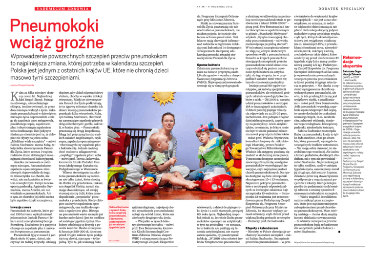 nr 36 / 9 września 2012 va d e m e c u m z d row i a Pneumokoki wciąż groźne Wprowadzenie powszechnych szczepień przeciw pneumokokom to najpilniejsza zmiana, której potrzeba w kalendarzu szczepień. Polska jest jednym z ostatnich krajów UE, które nie chronią dzieci masowo tymi szczepieniami. Joanna Przepiórkowska K uba za kilka miesięcy skończy osiem lat. Najbardziej lubi biegać i liczyć. Patrząc na zdrowego, uśmiechniętego chłopca, trudno uwierzyć, że przez dwa miesiące walczył o życie. Zakażenie pneumokokami w dziewiątym miesiącu życia doprowadziło u niego do zapalenia opon mózgowych, powikłanego sepsą, zapaleniem płuc i obustronnym zapaleniem ucha środkowego. Dziś jedynym śladem po chorobie jest to, że chłopiec nie słyszy na jedno ucho. „Mieliśmy wiele szczęścia” – mówi Sabina Szafraniec, mama Kuby, założycielka stowarzyszenia Parasol dla Życia, które zrzesza i wspiera rodziców dzieci dotkniętych inwazyjnymi chorobami bakteryjnymi. Anielka zachorowała w siódmym miesiącu. Pneumokokowe zapalenie opon mózgowo-rdzeniowych doprowadziło do tego, że dziewczynka nie chodzi, nie widzi, nie ma kontaktu ze światem zewnętrznym. Cierpi na lekooporną padaczkę. Agnieszka Szymańska, mama Anielki, nic nie wiedziała o pneumokokach. Ani o tym, że chorobie jej córki można było zapobiec dzięki szczepionce. dopiero, gdy układ odpornościowy słabnie, choćby w wyniku infekcji wirusowej. Matki ze stowarzyszenia Parasol dla Życia podkreślają, że to typowy schemat choroby ich dzieci: inwazję pneumokoków poprzedzało kilka wirusówek. Kuba, syn Sabiny Szafraniec, chorował na nawracające zapalenie górnych dróg oddechowych: gardła, oskrzeli, w końcu płuc. – Pneumokoki przenoszą się drogą kropelkową. Mogą być przyczyną bardzo ciężkich zakażeń uogólnionych, czyli sepsy, zapalenia opon mózgowo-rdzeniowych czy zapalenia płuc z bakteriemią. Jednak częściej, choć trudno to zdiagnozować, „zwykłego” zapalenia płuc i ucha – mówi prof. Teresa Jackowska, kierownik Kliniki Pediatrii Centrum Medycznego Kształcenia Podyplomowego w Warszawie. Wbrew stereotypom na zakażenie pneumokokami są narażone nie tylko dzieci, które chodzą do żłobka czy przedszkola. Łukasz, syn Angeliki Plichty, zaraził się, mając dwa miesiące, od swojej starszej siostry Julii, która prawdopodobnie „przyniosła” pneumokoka z przedszkola. Kiedy chłopiec walczył z zapaleniem opon mózgowych, ona trafiła do szpiInwazja z nosa Pneumokoki to bakterie, które po- tala z zapaleniem płuc. Dlatego na pneumokoki warto szczepić już nad 130 lat temu wykryli niemal bardzo małe dzieci (jest to możliwe jednocześnie Ludwik Pasteur i leod szóstego tygodnia życia). Niekarz armii amerykańskiej George Sternberg. Znaleziono je u pacjenta którzy odwlekają tę decyzję z pochorego na zapalenie płuc i nazwa- wodu kosztów. Dawka szczepionki kosztuje 250-300 zł, dzieciom no Streptococcus pneumoniae. Pneumokoki żyją w nosach i gar- przed drugim rokiem życia podaje się trzy dawki, starszym – tylko dłach około 60 proc. dzieci, nie czyniąc im żadnej krzywdy. Atakują jedną. Tyle że, jak wskazują dane Sabina Szafraniec z synami: Kubą, który zaraził się pneumokokami, i Szymonem, zaszczepionym już w szóstym tygodniu życia Fot. cor bis epidemiologiczne, najwięcej chorób wywołanych pneumokokami notuje się wśród dzieci, które nie ukończyły drugiego roku życia. – Wszystko w rękach lekarzy pierwszego kontaktu – mówi prof. Ewa Bernatowska, kierownik Kliniki Immunologii Centrum Zdrowia Dziecka, ekspert WHO i wiceprzewodnicząca Pediatrycznego Zespołu Ekspertów z obniżoną wrażliwością na penicylinę wzrósł ponaddwukrotnie w porównaniu z latami 2006-2009” – piszą prof. Ewa Bernatowska i Anna Skoczyńska w opublikowanym w piśmie „Standardy Medyczne” artykule „Ryzyko inwazyjnej choroby pneumokokowej – od wieku niemowlęcego po późną starość”. W tej sytuacji szczepienia ochronne stają się jednym skutecznym sposobem walki z pneumokokami. Ponadto w krajach powszechnie stosujących szczepionki przeciw pneumokokom wśród dzieci znaOporne bakterie cząco obniżył się poziom oporZakażenia pneumokokami są co ności tych bakterii na antybioroku na świecie przyczyną około 1,6 mln zgonów – wynika z danych tyki, do tego stopnia, że w przypadkach zakażeń nimi wraca się Światowej Organizacji Zdrowia (WHO). Najwięcej zachorowań ob- tam do stosowania penicyliny. Istnieje ponad 90 typów (seserwuje się w skrajnych grupach rotypów, jak mówią specjaliści) pneumokoków, ale większość groźnych zakażeń wywołują tylko niektóre z nich. – Od 2009 r. wzrasta udział pneumokoków o serotypie 19A w inwazyjnych zakażeniach. U dzieci poniżej piątego roku życia odpowiada on za 25-29 proc. zachorowań. Jest jednym z najbardziej niebezpiecznych, często oporny na penicylinę i wiele antybiotyków, co oznacza, że lekarz może nie być w stanie pokonać zakażenia nawet przy użyciu kilku leków – mówi prof. Waleria Hryniewicz, konsultant krajowy ds. mikrobiologii lekarskiej, prezes Polskiego Towarzystwa Mikrobiologów. Właśnie ich antygeny powinny się znaleźć w skutecznej szczepionce. Tymczasem dostępne szczepionki zawierają różną liczbę serotypów pneumokoków wywołujących inwazyjne, czyli najcięższe postaci chorób pneumokokowych. Na rynku dostępne są dwie szczepionki skoniugowane: 10- i 13-walentna. Najszersze pokrycie pneumokoków o serotypach odpowiedzialnych za inwazyjne zakażenia daje szczepionka 13-walentna. – Szczepionka 13-walentna jest rekomendowana przez Pediatryczny Zespół Ekspertów ds. Programu Szczewiekowych, u dzieci do piątego ro- pień Ochronnych przy Ministrze ku życia i u osób starszych, powyżej Zdrowia, bo stanowi większy parasol ochronny, czyli chroni przed 60. roku życia. Najbardziej niepokoi jednak to, że rośnie liczba pn