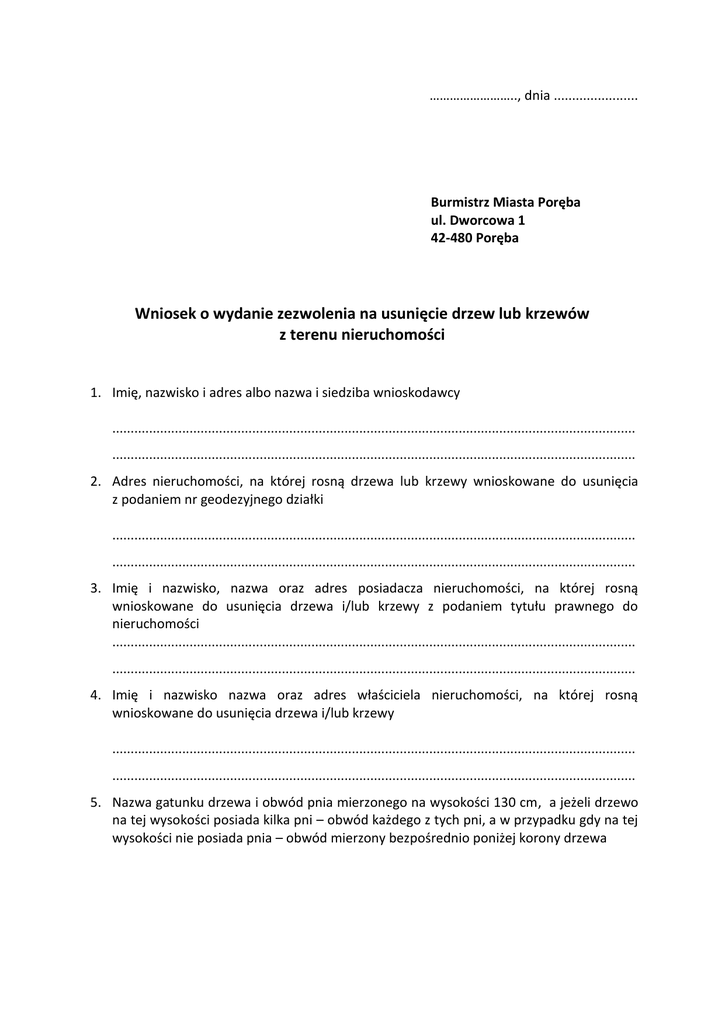 …………………….., dnia ....................... Burmistrz Miasta Poręba ul. Dworcowa 1 42-480 Poręba Wniosek o wydanie zezwolenia na usunięcie drzew lub krzewów z terenu nieruchomości 1. Imię, nazwisko i adres albo nazwa i siedziba wnioskodawcy .............................................................................................................................................. .............................................................................................................................................. 2. Adres nieruchomości, na której rosną drzewa lub krzewy wnioskowane do usunięcia z podaniem nr geodezyjnego działki .............................................................................................................................................. .............................................................................................................................................. 3. Imię i nazwisko, nazwa oraz adres posiadacza nieruchomości, na której rosną wnioskowane do usunięcia drzewa i/lub krzewy z podaniem tytułu prawnego do nieruchomości .............................................................................................................................................. .............................................................................................................................................. 4. Imię i nazwisko nazwa oraz adres właściciela nieruchomości, na której rosną wnioskowane do usunięcia drzewa i/lub krzewy .............................................................................................................................................. .............................................................................................................................................. 5. Nazwa gatunku drzewa i obwód pnia mierzonego na wysokości 130 cm, a jeżeli drzewo na tej wysokości posiada kilka pni – obwód każdego z tych pni, a w przypadku gdy na tej wysokości nie posiada pnia – obwód mierzony bezpośrednio poniżej korony drzewa L.p. Gatunek Obwód pnia 1 ………………………………………………………………………………………. ………………………… cm 2 ………………………………………………………………………………………. ………………………… cm 3 ………………………………………………………………………………………. ………………………… cm 4 ………………………………………………………………………………………. ………………………… cm 5 ………………………………………………………………………………………. ………………………… cm UWAGA: Numer drzewa nadany we wniosku powinien być zgodny z numerem drzewa oznaczonym na załączniku mapowym (lub rysunku). 6. Nazwa gatunku krzewu i wielkość powierzchni, z której zostanie usunięty krzew (za powierzchnie przyjmuje się wielkość powierzchni rzutu poziomego krzewu) L.p. Gatunek Powierzchnia 1 ………………………………………………………………………………………. ………………………… m2 2 ………………………………………………………………………………………. ………………………… m2 3 ………………………………………………………………………………………. ………………………… m2 4 ………………………………………………………………………………………. ………………………… m2 5 ………………………………………………………………………………………. ………………………… m2 UWAGA: Numer krzewu nadany we wniosku powinien być zgodny z numerem krzewu oznaczonym na załączniku mapowym (lub rysunku). 7. Przyczyna i termin zamierzonego usunięcia drzew lub krzewów: ………………………………………………………………………………………………………………………………………… ………………………………………………………………………………………………………………………………………… ………………………………………………………………………………………………………………………………………… ………………………………………………………………………………………………………………………………………… 8. Wskazanie, czy usunięcie wynika z celu związanego z prowadzeniem działalności gospodarczej – TAK / NIE. …………………………………………………… (czytelny podpis wnioskodawcy) UWAGA: Poniższe oświadczenie należy wypełnić w przypadku wniosku składanego przez posiadacza nieruchomości o uregulowanym stanie prawnym Oświadczam, że posiadam tytuł prawny władania nieruchomością wskazaną w pkt 2 niniejszego wniosku na podstawie tytułu prawnego wskazanego w pkt 3 niniejszego wniosku. Świadomy/a/ odpowiedzialności karnej za podanie w niniejszym oświadczeniu nieprawdy zgodnie z art. 233 k.k., potwierdzam własnoręcznym podpisem prawdziwość danych zamieszczonych powyżej. …………………………………………………… (czytelny podpis wnioskodawcy) UWAGA: Poniższe oświadczenie należy wypełnić w przypadku wniosku składanego przez posiadacza nieruchomości o nieuregulowanym stanie prawnym Oświadczam, że jestem posiadaczem nieruchomości o nieuregulowanym stanie prawnym oznaczonej w pkt 3 niniejszego wniosku. Świadomy/a/ odpowiedzialności karnej za podanie w niniejszym oświadczeniu nieprawdy zgodnie z art. 233 k.k., potwierdzam własnoręcznym podpisem prawdziwość danych zamieszczonych powyżej. …………………………………………………… (czytelny podpis wnioskodawcy) U