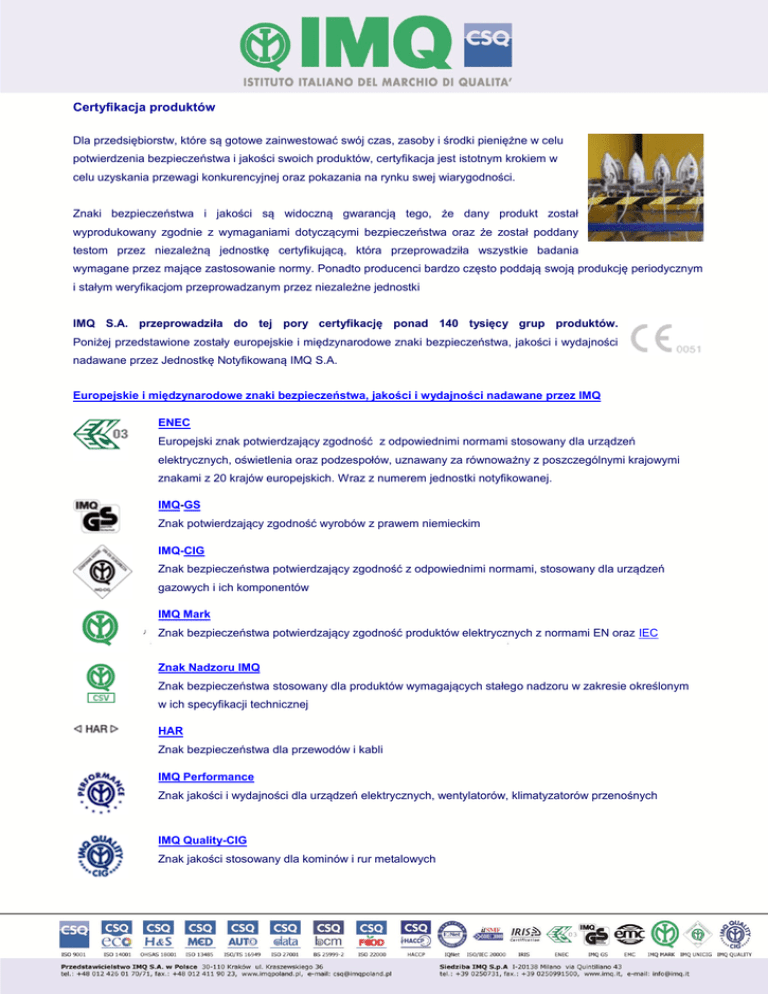 Certyfikacja produktów Dla przedsiębiorstw, które są gotowe zainwestować swój czas, zasoby i środki pieniężne w celu potwierdzenia bezpieczeństwa i jakości swoich produktów, certyfikacja jest istotnym krokiem w celu uzyskania przewagi konkurencyjnej oraz pokazania na rynku swej wiarygodności. Znaki bezpieczeństwa i jakości są widoczną gwarancją tego, że dany produkt został wyprodukowany zgodnie z wymaganiami dotyczącymi bezpieczeństwa oraz że został poddany testom przez niezależną jednostkę certyfikującą, która przeprowadziła wszystkie badania wymagane przez mające zastosowanie normy. Ponadto producenci bardzo często poddają swoją produkcję periodycznym i stałym weryfikacjom przeprowadzanym przez niezależne jednostki IMQ S.A. przeprowadziła do tej pory certyfikację ponad 140 tysięcy grup produktów. Poniżej przedstawione zostały europejskie i międzynarodowe znaki bezpieczeństwa, jakości i wydajności nadawane przez Jednostkę Notyfikowaną IMQ S.A. Europejskie i międzynarodowe znaki bezpieczeństwa, jakości i wydajności nadawane przez IMQ ENEC Europejski znak potwierdzający zgodność z odpowiednimi normami stosowany dla urządzeń elektrycznych, oświetlenia oraz podzespołów, uznawany za równoważny z poszczególnymi krajowymi znakami z 20 krajów europejskich. Wraz z numerem jednostki notyfikowanej. IMQ-GS Znak potwierdzający zgodność wyrobów z prawem niemieckim IMQ-CIG Znak bezpieczeństwa potwierdzający zgodność z odpowiednimi normami, stosowany dla urządzeń gazowych i ich komponentów IMQ Mark Znak bezpieczeństwa potwierdzający zgodność produktów elektrycznych z normami EN oraz IEC Znak Nadzoru IMQ Znak bezpieczeństwa stosowany dla produktów wymagających stałego nadzoru w zakresie określonym w ich specyfikacji technicznej HAR Znak bezpieczeństwa dla przewodów i kabli IMQ Performance Znak jakości i wydajności dla urządzeń elektrycznych, wentylatorów, klimatyzatorów przenośnych IMQ Quality-CIG Znak jakości stosowany dla kominów i rur metalowych IMQ l'Istituto Italiano del Marchio di Qualità Via Quintiliano, 43 20138 Milano - Italia Telefono +39 02 50731.1 Fax +39 02 50991500 E-mail: [email protected] www.imq.it IMQ w Polsce ul. Kraszewskiego 36, 30-110 Kraków tel. +48 012 426 01 70 fax. +48 012 411 90 23 E-mail: [email protected] www.imqpoland.pl IMQ Security System Znak jakości i wydajności dla produktów i komponentów stosowanych w systemach przeciwpożarowych, antywłamaniowych i alarmach IMQ-EMC Europejski znak potwierdzający zgodność z wymaganiami EMC (kompatybilność elektromagnetyczna) określonymi przez europejskie normy Emc-International Znak poświadczający zgodność z wymogami EMC (kompatybilność elektromagnetyczna) na rynku europejskim, japońskim, australijskim i amerykańskim Znak CCC i CQC Znak poświadczający zgodność z odpowiednimi normami stosowany dla produktów elektrycznych na rynek chiński Znak FCC Znak poświadczający zgodność z odpowiednimi normami FCC (Federal Communications Commission Federalna Komisja Łączności USA) stosowany w radiofonii, telekomunikacji i telewizji na terenie USA Znak cCSAus Znak poświadczający zgodność z odpowiednimi normami stosowany dla sprzętu elektrycznego na rynek USA i Kanady Znak CSA star Znak poświadczający zgodność z odpowiednimi normami stosowany dla urządzeń gazowych na rynku USA Znak CSA flame Znak poświadczający zgodność z odpowiednimi normami stosowany dla urządzeń gazowych na rynku kanadyjskim Znak IMQ Food Znak jakości stosowany dla sektora rolno-spożywczego Certyfikacja GLOBALGAP Znak stosowany dla certyfikacji produkcji warzyw i owoców, który również promuje stosowanie dobrej praktyki rolniczej BRC Global Standard for Food Safety Certyfikacja zgodnie z europejskimi normami bezpieczeństwa żywności IFS International Food Standard Certyfikacja zgodnie z europejskimi normami bezpieczeństwa żywności CE Znak CE wraz z numerem jednostki notyfikowanej dopuszczającej produkt do obrotu na terenie Unii Europejskiej FSC Certyfikacja na zgodność z wymogami FSC (FOREST STEWARDSHIP COUNCIL) IMQ l'Istituto Italiano del Marchio di Qualità Via Quintiliano, 43 20138 Milano - Italia Telefono +39 02 50731.1 Fax +39 02 50991500 E-mail: [email protected] www.imq.it IMQ w Polsce ul. Kraszewskiego 36, 30-110 Kraków tel. +48 012 426 01 70 fax. +48 012 411 90 23 E-mail: [email protected] www.imqpoland.pl