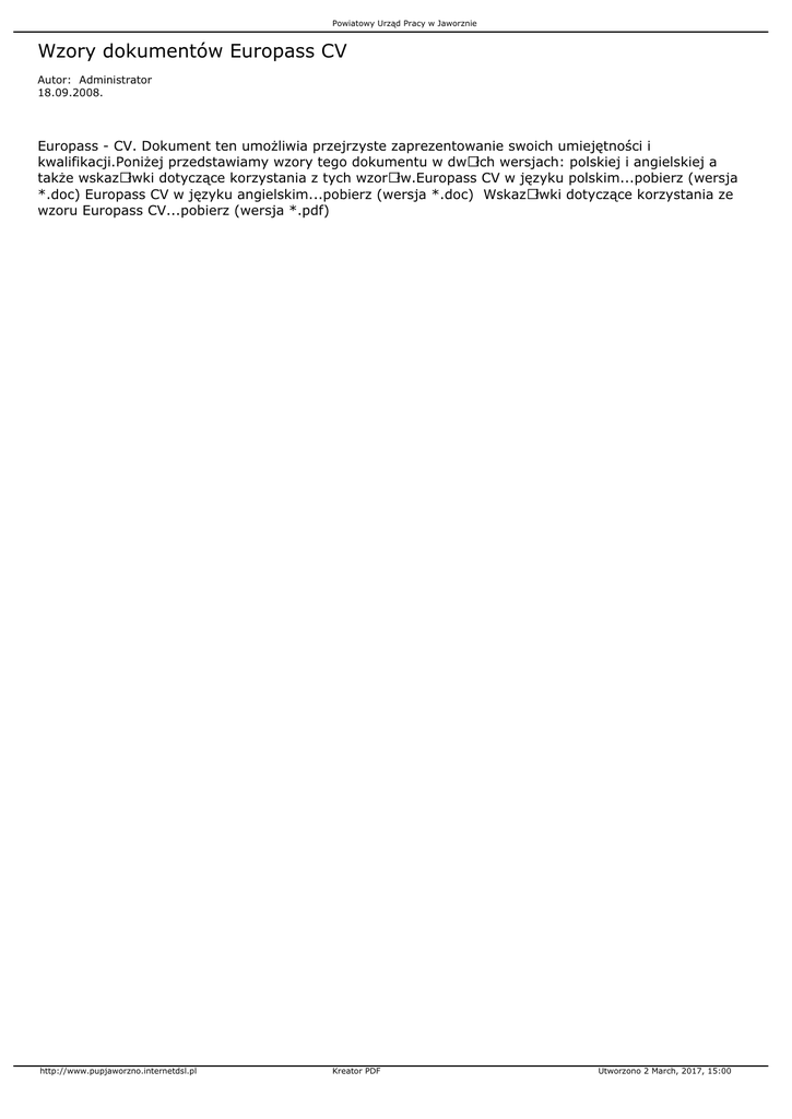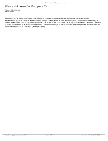 Powiatowy Urząd Pracy w Jaworznie Wzory dokumentów Europass CV Autor: Administrator 18.09.2008. Europass - CV. Dokument ten umożliwia przejrzyste zaprezentowanie swoich umiejętności i kwalifikacji.Poniżej przedstawiamy wzory tego dokumentu w dwÃłch wersjach: polskiej i angielskiej a także wskazÃłwki dotyczące korzystania z tych wzorÃłw.Europass CV w języku polskim...pobierz (wersja *.doc) Europass CV w języku angielskim...pobierz (wersja *.doc) WskazÃłwki dotyczące korzystania ze wzoru Europass CV...pobierz (wersja *.pdf) http://www.pupjaworzno.internetdsl.pl Kreator PDF Utworzono 2 March, 2017, 15:00