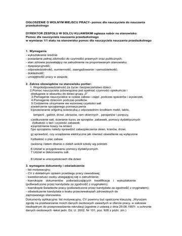 OGŁOSZENIE O WOLNYM MIEJSCU PRACY- pomoc dla nauczyciela do nauczania przedszkolnego DYREKTOR ZESPOŁU W SOLCU KUJAWSKIM ogłasza nabór na stanowisko: Pomoc dla nauczyciela nauczania przedszkolnego w wymiarze 1/1 etatu na stanowisko pomoc dla nauczyciela nauczania przedszkolnego 1. Wymagania - wykształcenie średnie - posiadanie pełnej zdolności do czynności prawnych oraz publicznych; - stan zdrowia pozwalający na zatrudnienie na proponowanym stanowisku; - dyspozycyjność; - odpowiedzialność, sumienność, zaangażowanie i samodzielność; - dokładność; - umiejętność pracy w zespole. 2. Zakres obowiązków na stanowisku portier: 1. Współodpowiedzialność za życie i bezpieczeństwo dzieci. 2.Pomoc nauczyciela zobowiązana jest spełniać czynności opiekuńcze i obsługowe w stosunku do dzieci grupy „0” 3.Pomaganie nauczycielce w czasie zabaw i zajęć ,podczas spacerów i wycieczek. 4.Pomaganie dzieciom podczas posiłków. 5.Codzienne utrzymanie we wzorowej czystości sali a)wietrzenie sprzątanego pomieszczenia b)przecieranie wilgotną ściereczką z odpowiednim środkiem mebli, tablic, lamperii , gablot, drzwi ,obrazów, ram okiennych , parapetów i poręczy, c)odkurzanie sali, ścieranie kurzu ze sprzętów ,zabawek, pomocy dydaktycznych d)dbałość o ład i czystość zabawek e)opróżnianie koszy na śmieci f)po sprzątaniu należy sprawdzić zabezpieczenia okien, kranów, drzwi, g) sprawdzić, czy urządzenia elektryczne jak również oświetlenie są wyłączone h)dbałość o plac zabaw i)wiosną i latem dbanie o zieleń wokół szkoły wg potrzeb 6.Udział w przygotowaniu pomocy dydaktycznych. 7.Udział w dekorowaniu sali. 8.Udział w uroczystościach dla dzieci 3. wymagane dokumenty i oświadczenia: - list motywacyjny; - CV z dokładnym opisem przebiegu pracy zawodowej; - kwestionariusz osoby ubiegającej się o zatrudnienie; - kserokopie dokumentów poświadczających kwalifikacje i wykształcenie (poświadczone przez kandydata za zgodność z oryginałem); - kserokopie świadectw pracy (poświadczone przez kandydata za zgodność z oryginałem); - oświadczenie kandydata o braku przeciwwskazań zdrowotnych do zajmowanego stanowiska. Dokumenty aplikacyjne: list motywacyjny, CV powinny być opatrzone klauzulą: „Wyrażam zgodę na przetwarzanie moich danych osobowych zawartych w ofercie pracy, w zakresie niezbędnym do przeprowadzenia rekrutacji (zgodnie z ustawą z dnia 29.08.1997r. o ochronie danych osobowych -tekst jedn. Dz. U. 2002, Nr 101, poz. 926 z późn. zm.) Wymagane dokumenty aplikacyjne należy złożyć w sekretariacie Szkoły lub przesłać w terminie do dnia. 01.07.2011 r. do godz. 15:00 na adres: Zespół Szkół w Solcu Kujawskim ul. Tartaczna 25, w zaklejonych kopertach z dopiskiem: „Nabór na wolne stanowisko sprzątaczki w Zespole Szkół w Solcu Kujawskim". Aplikacje, które wpłyną do Szkoły po wyżej określonym terminie nie będą rozpatrywane. Otwarcie ofert nastąpi w Zespole Szkół w Solcu Kujawskim w dniu 02.07.2011 r. 13.00 o godz. O terminie rozmowy kwalifikacyjnej kandydaci zostaną powiadomieni indywidualnie. Dodatkowe informacje można uzyskać pod numerem telefonu 387 13 26. Dokumenty nieodebrane po upływie 1 miesiąca od dnia rozstrzygnięcia naboru zostaną protokolarnie zniszczone. Dyrektor Zespołu Szkół w Solcu Kujawskim Małgorzata Niedźwiedzka