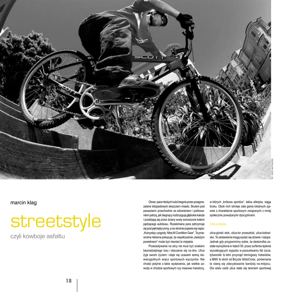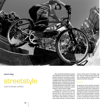 fot.: scott usa bicycles marcin klag streetstyle czyli kowboje asfaltu 18 Obraz: para młodych ludzi biegnie przez posępne, zalane listopadowym deszczem miasto. Skuleni pod parasolami przechodnie ze zdziwieniem i politowaniem patrzą, jak biegnący rozbryzgują głębokie kałuże i przebijają się przez ściany wody wznoszone kołami pędzącego autobusu. Roześmiana para zatrzymuje się pod pękniętą rynną, a na ekranie pojawia się napis: „Korzystaj z pogody. Nike All Condition Gear”. Ta przewrotna reklama pokazuje, że współcześnie „świeżym powietrzem” może być również to miejskie. Przesiadywanie na ulicy nie musi być znakiem beznadziejnego losu i staczania się na dno. Ulica żyje swoim życiem i staje się czasami areną niewiarygodnych wręcz sportowych wyczynów. Nie chodzi jedynie o takie wydarzenia, jak wielkie zawody w chodzie sportowym czy masowe maratony, w których „królowa sportów”, lekka atletyka, sięga bruku. Obok nich istnieje cała gama lokalnych zjawisk o charakterze sportowym związanych z mniej społecznie poważanymi dyscyplinami. Ulica-plaża, ulica-górski stok, ulica-tor przeszkód, ulica-lodowisko. Te zestawienia mogą wydać się dziwne i rażące. Jednak gdy przypomnimy sobie, że deskorolka została wymyślona w latach 50. przez surferów tęsknie wyczekujących wyjazdu w poszukiwaniu fali życia, łyżworolki to letni przyrząd treningowy hokeistów, a BMX to skrót od Bicycle MotoCross, porównania te staną się zdecydowanie bardziej na miejscu. Dla wielu osób ulica stała się terenem sportowej fot. dzięki: g-sport bmx, sheffield fot. dzięki: g-sport bmx, sheffield rywalizacji. Nie chodzi tylko o streetowy styl jazdy na rolkach, desce czy BMX-ie, ale również o inne, mniej znane dyscypliny. Od wielu lat kurierzy rowerowi z wielkich miast urządzają coroczne zawody. Mają nawet swoje mistrzostwa świata, w których celem jest dostarczyć w autentycznym ruchu drogowym symboliczną przesyłkę. Często nazywają siebie alley cats, co po polsku znaczy „koty dachowce”, a w dosłownym tłumaczeniu Streetball to odmiana koszykówki, którą zna większość chłopaków, choć często nawet nie wie, że „to” się tak nazywa – jeden kosz i trzech na trzech. A „zośka”? To też rodzaj miejskiego sportu, jednego z tych, które nie wymagają wielkich, otwartych przestrzeni lub specjalnie przygotowanych obiektów. Bo właśnie dostępność jest jednym z atutów nowych miejskich sportów. Dostępność i oczywiście ich niezaprzeczalna widowiskowość, a także fakt, że rywa- fot.: www.skatepile.com fot.: expn.go.com „koty (z) zaułków”. 19 lizacja jest tu połączona ze wspólnym odkrywaniem poszczególnych stopni zaawansowania. Dyscypliny zwane freestylowymi, polegające na wykonywaniu wręcz cyrkowych sztuczek, w swoją naturę wpisane mają widowiskowość i indywidualizm, co powoduje, że zmniejsza się znaczenie bezpośredniej rywalizacji. Wszyscy zawodnicy skateboardu, rolkarze czy BMX-owcy podkreślają, że najważniejszym aspektem ich dyscyplin jest styl, albo – jak sami mówią – „ekspresja”. Różnice charakteru najlepiej zaobserwować w breakdance. To styl tańca stworzony na amerykańskich chodnikach. Swoisty taniec wojenny. Każdy z tancerzy wykonuje swoje popisowe figury jak najlepiej, aby zawstydzić przeciwnika. Pojedynki taneczne to do dziś często wykorzystywany w muzycznych wideoklipach element kultury. Kto nie pamięta wrażenia, jakie robił teledysk „Bad” Michaela Jacksona? Wydaje się, że współczesny taniec uliczny, który zaczerpnął wiele z brazylijskiej capoeiry, tańca jazzowego czy wręcz baletu nowoczesnego (który z kolei przejął z break’a wiele ele- fot.: red bull crushed ice mentów) wznosi się na wyższy poziom. Odrodzony na fali mody na freestyle, breakdance pojawia się znów na ulicach miast. Sporty uliczne balansują na granicy przepisów, a czasem nawet wychylają się nieco poza nią. Nikt nie pozwala na zjazd na wyposażonych w koła saneczkach po publicznej drodze, ale zawsze znajdzie się kilku oszołomów, którzy to jednak robią. Kurierzy rowerowi często sporo ryzykują jeżdżąc na rowerach bez hamulców, z nogami przypiętymi do pedałów mocnymi paskami i na „ostrym kole” (koła się kręcą i nie można przestać pedałować), ale ich wypowiedzi sugerują, że mało co daje tak intensywne przeżycia. Czują się panami drogi, fot.: www.sessions.com nieco na marginesie prawa, 20 ale jednocześnie, paradoksalnie, mają duże poczucie misji. To prawda – w dużych miastach dostarczenie przesyłki na czas, wbrew korkom i zakazom ruchu samochodów, jest dla klienta warte często duże pieniądze. Firmy prawnicze, architektoniczne i maklerskie w Nowym Jorku czy Londynie, które wysyłają setki dokumentów, lubią kurierów, taksówkarze znacznie mniej. Moda na naturalne dawki adrenaliny rozszerza swoje dziedziny schodząc z hal i turni w miejskie wąwozy, gdzie, niedaleko od domu, można doświadczyć podniecającego dreszczyku emocji, ocierając się o niebezpieczeństwo. Oprócz sportów typowo ulicznych, które można z łatwością uprawiać indywidualnie, do miasta docierają również dyscypliny niekoniecznie typowo miejskie i wymagające dużych nakładów finansowych i organizacyjnych. fot.: red bull fot.: trek bicycles marcin klag - projektant, absolwent Wydziału Form Przemysłowych krakowskiej ASP. Specjalizuje się w projektowaniu grafiki i identyfikacji wizualnej. Publikował artykuły o dizajnie w czasopismach: „Top Dom”, „Architektura i Biznes” oraz w „Biuletynie sztuki projektowania – Zabawka”. Prowadził dział testów w czasopiśmie „bikeBoard – magazyn rowerowy” – bo lubi rowery. 21 Red Bull promuje swój napój organizując niezwykłe wydarzenia sportowe, od skoków z trzydziestometrowych klifów do morza po miejskie wyścigi zjazdowe na rowerach. Jednymi z bardziej spektakularnych wydarzeń były 