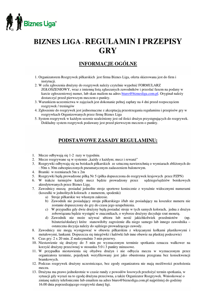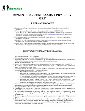 BIZNES LIGA - REGULAMIN I PRZEPISY GRY INFORMACJE OGÓLNE 1. Organizatorem Rozgrywek piłkarskich jest firma Biznes Liga, oferta skierowana jest do firm i instytucji. 2. W celu zgłoszenia drużyny do rozgrywek należy czytelnie wypełnić FORMULARZ ZGŁOSZENIOWY, wraz z imienną listą zgłaszanych zawodników i przesłać faxem na podany w karcie zgłoszeniowej numer, lub skan mailem na adres [email protected]. Oryginał należy dostarczyć przed pierwszym meczem o punkty. 3. Warunkiem uczestnictwa w zajęciach jest dokonanie pełnej zapłaty na 4 dni przed rozpoczęciem rozgrywek / treningów 4. Zgłoszenie do rozgrywek jest jednoznaczne z akceptacją przestrzegania regulaminu i przepisów gry w rozgrywkach Organizowanych przez firmę Biznes Liga 5. System rozgrywek w każdym sezonie uzależniony jest od ilości drużyn przystępujących do rozgrywek. Dokładny system rozgrywek podawany jest przed pierwszym meczem o punkty. PODSTAWOWE ZASADY REGULAMINU: 1. Mecze odbywają się 1-2 razy w tygodniu. 2. Mecze rozgrywane są w systemie „każdy z każdym; mecz i rewanż” 3. Rozgrywki odbywają się na boiskach piłkarskich ze sztuczną nawierzchnią o wymiarach zbliżonych do : 50m x 30m zabezpieczonych pneumatycznym zadaszeniem balonowym. 4. Bramki w rozmiarach 5m x 2m 5. Rozgrywki będą prowadzone piłką Nr 5 (piłka dopuszczona do rozgrywek krajowych przez PZPN) 6. W trakcie turniejów każdy mecz będzie prowadzony przez sędziego/sędziów boiskowych akredytowanych przez Biznes Ligę. 7. Zawodnicy muszą posiadać jednolite stroje sportowe koniecznie z wyraźnie widocznymi numerami (koszulki w jednolitych kolorach z numerem, spodenki) a) Stroje piłkarskie we własnym zakresie. b) Zawodnik nie posiadający stroju piłkarskiego i/lub nie posiadający na koszulce numeru nie zostanie dopuszczony do gry do czasu jego uzupełnienia. c) W przypadku gdy dwie drużyny będą posiadać stroje w tych samych kolorach, jedna z drużyn zobowiązana będzie wystąpić w znacznikach, o wyborze drużyny decyduje rzut monetą. d) Zawodnik nie może używać ubioru lub nosić jakichkolwiek przedmiotów (np. biżuteria/okulary) które stanowiłoby zagrożenie dla niego samego lub innego zawodnika – ostateczna decyzja należy do sędziego prowadzącego zawody. 8. Zawodnicy nie mogą występować w obuwiu piłkarskim z wkręcanymi kołkami plastikowymi i metalowymi, lankami. Dopuszcza się śniegówki i halówki lub inne obuwie na płaskiej podeszwie) 9. Czas gry: 2 x 20 min. Z maksymalnie 3 min przerwy. 10. Niestawienie się drużyny do 5 min po wyznaczonym terminie spotkania oznacza walkower na korzyść drużyny przeciwnej w stosunku 5:0 i 3 punkty minusowe. 11. W przypadku niestawienia się obydwu drużyn i nie odbycia meczu w wyznaczonym przez organizatora terminie, pojedynek weryfikowany jest jako obustronna przegrana bez konsekwencji bramkowych. 12. Podczas rozgrywek drużyny uczestniczące, bez zgody organizatora nie mają możliwości przełożenia meczu. 13. Drużyna ma prawo jednokrotnie w czasie rundy z powodów losowych przełożyć termin spotkania, w sytuacji gdy wyrazi na to zgodę drużyna przeciwna, a także Organizator Rozgrywek. Wnioskować o zmianę należy telefonicznie lub emailem na adres [email protected] najpóźniej do godziny 16.00 dnia poprzedzającego rozgrywki danej ligi. 14. Organizator zastrzega sobie prawo do zmiany terminów w sytuacjach wyjątkowych. 15. W przypadku braku składu sędziowskiego zawody Biznes Ligi może prowadzić koordynator danej ligi. Fakt powyższy opisuje w „Sprawozdaniu meczowym” prowadzący sędzia. Dokument ten winien być podpisany przez kapitanów /opiekunów/ obydwu drużyn. System punktowy, awanse i spadki: 16. System awansów i spadków uzależniony jest od ilości drużyn przystępujących do rozgrywek, oraz od możliwości organizacyjnych w danym sezonie. 17. Zakładany System awansów i spadków w sezonie jesień/zima - 2011/2012: a) Z Extraklasy do I Ligi spadną przynajmniej 4 ostatnie zespoły. b) Z I Ligi gr. A do Extraklasy awansują 2 pierwsze zespoły- do II Ligi spadną przynajmniej 4 ostatnie zespoły. c) Z I Ligi gr. B do Extraklasy awansują 2 pierwsze zespoły- do II Ligi spadną przynajmniej 4ostatnie zespoły. d) Z II Ligi gr. A do I Ligi awansują 2 pierwsze zespoły. e) Z II Ligi gr. B do I Ligi awansują 2 pierwsze zespoły. f) Z II Ligi gr. C do I Ligi awansują 2 pierwsze zespoły g) Z II Ligi gr. D do I Ligi awansują 2 pierwsze zepoły 18. Organizator zastrzega sobie prawo do zmiany systemu awansów i spadków wraz z rozpoczęciem nowego sezonu jesień/zima - 2011/2012 w zależności od ilości drużyn przystępujących do rozgrywek. 19. System awansów i spadków w sezonie jesień/zima - 2011/2012 ostatecznie będzie uzależniony od struktury rozgrywek Biznes Ligi w kolejnym sezonie. 20. O mistrzostwie w danej lidze decyduje pierwsze miejsce w tabelach po zakończonych rozgrywkach. 21. Za zwycięstwo drużyna otrzymuje 3 pkt. Za remis 1 pkt. Za przegraną 0 pkt. W przypadku walkowera drużyna wygrywająca otrzymuje 3 pkt. i 5:0 w bramkach. W przypadku walkowera drużyna przegrywająca ukarana zostaje 3 punktami minusowymi (w przypadku nie stawienia się drużyny na mecz). 22. O kolejności w tabeli decyduje: a) Po pierwsze większa ilość zdobytych punktów. b) Po drugie wynik bezpośredniego pojedynku między zainteresowanymi drużynami, w przypadku 3 lub większej ilości takich drużyn tworzymy małą tabelkę. c) Po trzecie większa ilość goli dodatnich wynikająca z różnicy goli zdobytych i straconych d) Po czwarte większa ilość goli zdobyta w rozgrywkach. e) Po piąte losowanie 23. System rozgrywek uzależniony jest od ilości drużyn przystępujących do danej edycji, dokładny system rozgrywek zostanie podany przed pierwszym meczem o punkty. Uprawnieni zawodnicy, skład drużyny i wprowadzanie zmian do składu: 24. Uczestnikami rozgrywek mogą być wyłącznie zespoły składające się z 