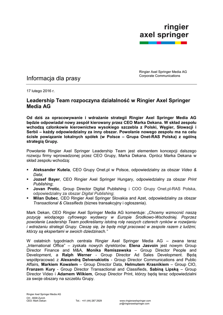 Informacja dla prasy Ringier Axel Springer Media AG Corporate Communications 17 lutego 2016 r. Leadership Team rozpoczyna działalność w Ringier Axel Springer Media AG Od dziś za opracowywanie i wdrażanie strategii Ringier Axel Springer Media AG będzie odpowiadał nowy zespół kierowany przez CEO Marka Dekana. W skład zespołu wchodzą członkowie kierownictwa wysokiego szczebla z Polski, Węgier, Słowacji i Serbii – każdy odpowiedzialny za inny obszar. Powołanie nowego zespołu ma na celu ścisłe powiązanie lokalnych spółek (w Polsce – Grupa Onet-RAS Polska) z ogólną strategią Grupy. Powołanie Ringier Axel Springer Leadership Team jest elementem koncepcji dalszego rozwoju firmy wprowadzonej przez CEO Grupy, Marka Dekana. Oprócz Marka Dekana w skład zespołu wchodzą:     Aleksander Kutela, CEO Grupy Onet.pl w Polsce, odpowiedzialny za obszar Video & Data; Jozsef Bayer, CEO Ringier Axel Springer Hungary, odpowiedzialny za obszar Print Publishing; Jovan Protic, Group Director Digital Publishing i COO Grupy Onet.pl-RAS Polska, odpowiedzialny za obszar Digital Publishing; Milan Dubec, CEO Ringier Axel Springer Slovakia and Azet, odpowiedzialny za obszar Transactional & Classifieds (biznes transakcyjny i ogłoszenia). Mark Dekan, CEO Ringier Axel Springer Media AG komentuje: „Chcemy wzmocnić naszą pozycję wiodącego cyfrowego wydawcy w Europie Środkowo-Wschodniej. Poprzez powołanie Leadership Team podkreślamy istotną rolę naszych czterech rynków w rozwijaniu i wdrażaniu strategii Grupy. Cieszę się, że będę mógł pracować w zespole razem z ludźmi, którzy są ekspertami w swoich dziedzinach.” W ostatnich tygodniach centrala Ringier Axel Springer Media AG – zwana teraz „International Office” – zyskała nowych dyrektorów. Elena Jasvoin jest nowym Group Director Finance and M&A, Monika Remiszewska – Group Director People and Development, a Ralph Werner - Group Director Ad Sales Development. Będą współpracować z Alexandrą Delvenakiotis - Group Director Communications and Public Affairs, Markiem Kowalem – Group Director Data, Helmutem Krasnikiem – Group CIO, Franzem Kury - Group Director Transactional and Classifieds, Sabiną Lipską – Group Director Video i Adamem Wilkiem, Group Director Print, którzy będą teraz odpowiedzialni za swoje obszary na szczeblu Grupy. Ringier Axel Springer Media AG CH - 8008 Zurich CEO: Mark Dekan Tel.: +41 (44) 267 2929 www.ringieraxelspringer.com [email protected] Kontakt dla mediów: Alexandra Delvenakiotis Group Director Communications and Public Affairs Ringier Axel Springer Media AG Tel. +41 44 267 29 14 [email protected] www.ringieraxelspringer.com