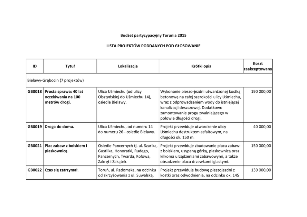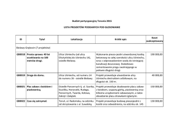 Budżet partycypacyjny Torunia 2015 LISTA PROJEKTÓW PODDANYCH POD GŁOSOWANIE ID Tytuł Lokalizacja Krótki opis Koszt zaakceptowany Bielawy-Grębocin (7 projektów) GB0018 Prosta sprawa: 40 lat oczekiwania na 100 metrów drogi. Ulica Uśmiechu (od ulicy Olsztyńskiej do Uśmiechu 14), osiedle Bielawy. Wykonanie pieszo-jezdni utwardzonej kostką betonową na całej szerokości ulicy Uśmiechu, wraz z odprowadzeniem wody do istniejącej kanalizacji deszczowej. Dodatkowo zamontowanie progu zwalniającego w połowie długości drogi. GB0019 Droga do domu. Ulica Uśmiechu, od numeru 14 do numeru 26 - osiedle Bielawy. Projekt przewiduje utwardzenie ulicy Uśmiechu destruktem asfaltowym, na długości ok. 150 m. GB0021 Plac zabaw z boiskiem i piaskownicą. Osiedle Pancernych tj. ul. Szarika, Gustlika, Honoratki, Rudego, Pancernych, Twarda, Kołowa, Zakręt i Zakątek. Projekt przewiduje zbudowanie placu zabaw: z boiskiem, usypaną górką, piaskownicą oraz kilkoma urządzeniami zabawowymi, a także obsadzenie placu drzewkami iglastymi. 150 000,00 GB0022 Czas się zatrzymał. Toruń, ul. Radomska, na odcinku Projekt przewiduje budowę pieszojezdni z od skrzyżowania z ul. Suwalską. kostki oraz odwodnienia, na odcinku ok. 145 130 000,00 190 000,00 40 000,00 m, od skrzyżowania z ul. Suwalską. GB0023 Budowa oświetlenia drogowego w północnej części ulicy Ciekawej. Ulica Ciekawa, osiedle BielawyGrębocin. GB0025 Trochę drogowego optymizmu na Osiedlu bloków socjalnokomunalnych przy ul. Olsztyńska-Guliwera. Grunt gminny położony od Dokończenie budowy drogi i chodników na strony północno-wschodniej, odcinku ok. 100 m. zaczynający się od bloku socjalnego 116D do odcinka ulicy Guliwera, tj. między blokami komunalnymi ul. Olsztyńska 126128. GB0027 Zbudowanie pieszojezdni z Osiedle Pancernych, ulice: kostki wraz ze Szarika i Gustlika. studzienkami deszczowymi. Projekt przewiduje wykonanie dokumentacji oraz postawienie 8 latarń LED, na odcinku o długości ok. 200 m). Projekt przewiduje zbudowanie pieszojezdni z kostki wraz ze studzienkami deszczowymi. Łączna długość ok. 340 m. 36 000,00 120 000,00 280 000,00 Bydgoskie (22 projekty) B0051 Pokaż klasę posprzątaj po swoim psie. Cały obszar Bydgoskiego Przedmieścia ze szczególną koncentracją wokół popularnych miejsc spacerów z psami takich jak teren Parku Bydgoskiego, Piekarskich Gór, terenu wokół byłej stacji CPN oraz ulic prowadzących w te miejsca. Projekt przewiduje postawienie 20 koszy na psie odchody wraz z podajnikami tacek / woreczków / rękawiczek oraz przeprowadzenie kampanii informacyjnopromocyjnej zachęcającej mieszkańców do sprzątania po swoich psach. 20 000,00 B0073 Wyposażenia Pracowni Komputerowej w Szkole Podstawowej Nr 7. Szkoła Podstawowa Nr 7, ul. Gen. Wyposażenie pracowni komputerowej w 20 J.Bema 66, 87-100 Toruń. zestawów komputerowych, 10 biurek komputerowych i 28 krzeseł obrotowych. B0074 Letnia przygoda z Tańcem! Osiedle Bydgoskie Park Bydgoski Martówka. Projekt zakłada zorganizowanie kilkudniowego happeningu tanecznego w Parku Bydgoskim. Podczas wydarzenia instruktorzy szkół tańca typu Latino (Salsa, Kizomba, Bachata, Cubana i in.) będą pokazywać układy taneczne, zachęcając uczestników spotkania do wspólnej zabawy. Realizacja na podstawie otwartego konkursu ofert dla ngo lub przez jednostkę miejską. 100 000,00 B0082 Ulica Stroma: z ciemności do bezpieczeństwa. Ulica Stroma, osiedle Bydgoskie Przedmieście. Projekt przewiduje postawienie lampy ulicznej na ulicy Stromej - na działce nr 191 oraz ustawienie pojemnika na psie odchody na działce nr 193 (w pobliżu lampy ulicznej). Realizacja możliwa pod warunkiem uzyskania zgody właściciela terenu. 8 000,00 B0094 Parking samochodowy wewnątrzosiedlowy przy ul. Szosa Okrężna 28-42. Toruń, ul. Szosa Okrężna 28-42. Teren między blokiem mieszkalnym, a uliczką dojazdową do sklepu POLO Market (pas nieużytków między chodnikiem, a drogą dojazdową do sklepu). Projekt przewiduje budowę na wskazanym terenie ok. 40 miejsc parkingowych. 55 400,00 136 000,00 B0095 Toruński streetworking szansa dla młodzieży Bydgoskiego Przedmieścia. Bydgoskie Przedmieście. Projekt przewiduje zatrudnienie czterech streetworkerów (pracowników socjalnych i animatorów działających w otwartym terenie), którzy będą prowadzić działania informacyjno-edukacyjne, animacyjne, pedagogiczne i interwencyjne na rzecz młodzieży. Postawione zadania: prewencja, zmiana postaw społecznych, ograniczenie zachowań kryminogennych, edukacja nieformalna, animacja czasu wolnego i integracja społeczna. Realizacja na podstawie otwartego konkursu ofert dla ngo lub przez jednostkę miejską. 150 000,00 B0114 Święto Bydgoskiego Przedmieścia 2015. Bydgoskie Przedmieście. Projekt przewiduje wsparcie finansowe miasta dla cyklu imprez składających się na Święto Bydgoskiego Przedmieścia. O mikrogranty (max. po 2 tys. zł) mogłyby się ubiegać osoby fizyczne, grupy nieformalne, organizacje pozarządowe. Przeznaczenie wsparcia - m.in. na: zakup materiałów warsztatowych, transport, promocję imprez, wynajem sprzętu (np. sceny i nagłośnienia), nagrody dla uczestników konkursów. Realizacja poprzez otwarte konkursy dla organizacji pozarządowych lub inicjatywy lokalne, lub za pośrednictwem miejskiej instytucji kultury. 30 000,00 B0116 Park Działa. Park Miejski na Bydgoskim Przedmieściu. Projekt przewiduje organizowanie wydarzeń kulturalno-rozrywkowych, w tym animacji edukacyjnych dla dzieci w Parku Miejskim, w każdą sobotę, w okresie od maja do września 2015, a także letnich koncertów plenerowych (w niedziele). Realizacja na podstawie otwartego konkursu ofert dla ngo lub przez jednostkę miejską. 80 000,00 B0118 Renowacja pomnika Stanisława Moniuszki. Obszar miasta Torunia ograniczony ulicami: F. Chopina, Bydgoskiej, Al. 500-lecia. Odnowienie i konserwacja elementów dekoracyjnych na cokole pomnika, wykonanie i zamontowan