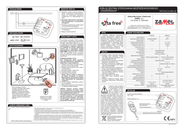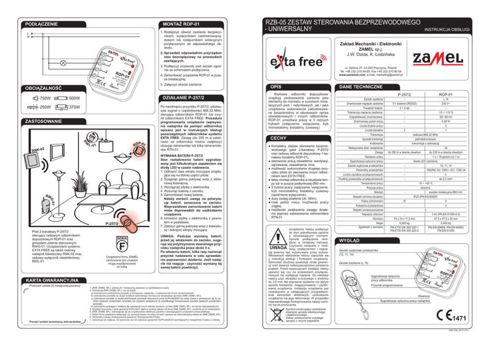 PODŁĄCZENIE MONTAŻ ROP-01 1.Rozłączyć obwód zasilania bezpiecznikiem, wyłącznikiem nadmiarowoprądowym lub rozłącznikiem izolacyjnym przyłączonymi do odpowiedniego obwodu. RZB-05 ZESTAW STEROWANIA BEZPRZEWODOWEGO - UNIWERSALNY Zakład Mechaniki i Elektroniki ZAMEL sp.j. J.W. Dzida, K. Łodzińska 2.Sprawdzić odpowiednim przyrządem stan beznapięciowy na przewodach zasilających. 3.Podłączyć przewody pod zaciski zgodnie ze schematem podłączenia. ul. Zielona 27, 43-200 Pszczyna, Poland Tel. +48 (32) 210 46 65, Fax +48 (32) 210 80 04 www.zamelcet.com, e-mail: [email protected] 4.Zamontować urządzenie ROP‑01 w puszce instalacyjnej. 5. Załączyć obwód zasilania. OBCIĄŻALNOŚĆ 750W 250W DZIAŁANIE P-257/2 500W Po naciśnięciu przycisku P-257/2, pilotwysyła sygnał o częstotliwości 868,32 MHz, sterujący odbiornikiem ROP-01 lub innymi odbiornikami EXTA FREE. Procedura programowania urządzenia (wpisywania nadajnika do pamięci odbiornika) opisana jest w instrukcjach obsługi poszczególnych odbiorników systemu EXTA FREE. Zasięg (do 250 m w zależności od odbiornika) można zwiększyć stosując retransmiter lub kilka retransmiterów RTN-01. 375W ZASTOSOWANIE Pilot 2-kanałowy P-257/2 sterujący radiowym odbiornikiem dopuszkowym ROP-01 oraz gniazdem zdalnie sterowanym RWG-01. Urządzeniami systemu EXTA FREE są także radiowy nadajnik klawiszowy RNK-02 oraz radiowy wyłącznik oświetleniowy RWL-01. WYMIANA BATERII P-257/2 Stan rozładowania baterii sygnalizowany jest kilkukrotnym zapaleniem się diody LED w czasie nadawania. 1.Odkręcić dwa wkręty mocujące znajdujące się na dolnej części pilota. 2.Ściągnąć górną pokrywę wraz z silikonową klawiaturą. 3.Wyciągnąć płytkę z elektroniką. 4.Wysunąć baterię z zacisku. 5.Zamontować nową baterię. Należy zwrócić uwagę na polaryzację baterii, oznaczoną na zacisku. Nieprawidłowe zamontowanie baterii może doprowadzić do uszkodzenia urządzenia. 6.Umieścić płytkę z elektroniką z powrotem w podstawie. 7.Założyć górną pokrywę wraz z klawiaturą i dokręcić wkręty mocujące. Urządzenia firmy ZAMEL cechowane tym znakiem mogą współpracować ze sobą. UWAGA: Podczas wymiany baterii, przed jej włożeniem do zacisku, sugeruje się przytrzymanie dowolnego przycisku nadajnika przez około 5 s. Po włożeniu baterii, kilka razy nacisnąć przycisk nadawania w celu sprawdzenia poprawności działania. Jeśli nadajnik nie reaguje - czynność wymiany tej samej baterii powtórzyć. KARTA GWARANCYJNA Producent udziela 24 miesięcznej gwarancji Pieczęć i podpis sprzedawcy, data sprzedaży 1. ZMIE ZAMEL SP.J. udziela 24- miesięcznej gwarancji na sprzedawane towary. 2. Gwarancją ZMIE ZAMEL SP.J. nie są objęte: a) mechaniczne uszkodzenia powstałe w transporcie, załadunku / rozładunku lub innych okolicznościach, b) uszkodzenia powstałe na skutek wadliwie wykonanego montażu lub eksploatacji wyrobów ZMIE ZAMEL SP.J., c) uszkodzenia powstałe na skutek jakichkolwiek przeróbek dokonanych przez KUPUJĄCEGO lub osoby trzecie a odnoszących się do wyrobów będących przedmiotem sprzedaży lub urządzeń niezbędnych do prawidłowego funkcjonowania wyrobów będących przedmiotem sprzedaży, d) uszkodzenia wynikające z działania siły wyższej lub innych zdarzeń losowych, za które ZMIE ZAMEL SP.J. nie ponosi odpowiedzialności. 3. Wszelkie roszczenia z tytułu gwarancji KUPUJĄCY zgłosi w punkcie zakupu lub firmie ZMIE ZAMEL SP.J. na piśmie po ich stwierdzeniu. 4. ZMIE ZAMEL SP.J. zobowiązuje się do rozpatrywania reklamacji zgodnie z obowiązującymi przepisami prawa polskiego. 5. Wybór formy załatwienia reklamacji, np. wymiana towaru na wolny od wad, naprawa lub zwrot pieniędzy należy do ZMIE ZAMEL SP.J. 6. Terytorialny zasięg obowiązywania gwarancji: Rzeczpospolita Polska. 7. Gwarancja nie wyłącza, nie ogranicza, ani nie zawiesza uprawnień KUPUJĄCEGO wynikających z niezgodności towaru z umową. INSTRUKCJA OBSŁUGI OPIS DANE TECHNICZNE Radiowe odbiorniki dopuszkowe znajdują zastosowanie zarówno jako elementy do montażu w puszkach instalacyjnych pod- i natynkowych, jak i jako urządzenia wykonawcze zabudowywane bezpośrednio w obudowach opraw oświetleniowych i innych odbiorników. ROP-01 umożliwia pracę w 5 różnych trybach (załączenie, wyłączenie, tryb monostabilny, bistabilny, czasowy). P-257/2 Zaciski zasilania: Znamionowe napięcie zasilania: Trwałość baterii: Urządzenie należy podłączyć do sieci jednofazowej zgodnie z obowiązującymi normami. Sposób podłączenia określono w niniejszej instrukcji. Czynności związane z: instaUWAGA lacją, podłączeniem i regulacją powinny być wykonywane przez wykwalifikowanych elektryków, którzy zapoznali się z instrukcją obsługi i funkcjami urządzenia. Demontaż obudowy powoduje utratę gwarancji oraz stwarza niebezpieczeństwo porażenia prądem. Przed rozpoczęciem instalacji należy upewnić się czy na przewodach przyłączeniowych nie występuje napięcie. Do instalacji należy użyć wkrętaka krzyżowego o średnicy do 3,5 mm. Na poprawne działanie ma wpływ sposób transportu, magazynowania i użytkowania urządzenia. Instalacja urządzenia jest niewskazana w następujących przypadkach: brak elementów składowych, uszkodzenie urządzenia lub jego deformacje. W przypadku nieprawidłowego funkcjonowania należy zwrócić się do producenta. L, N 3 V (bateria CR2032) 230 V~ 3 ÷ 5 lat - Tolerancja napięcia zasilania: - -15 ÷ +10 % Częstotliwość znamionowa: - 50 / 60 Hz Znamionowy pobór mocy: - 0,29 W Liczba trybów pracy: - 5 Liczba kanałów: 2 Transmisja: CECHY ●Kompletny zestaw sterowania bezprzewodowego (pilot 2-kanałowy P-257/2 oraz radiowy odbiornik dopuszkowy 1-kanałowy bistabilny ROP-01), ●sterowanie pracą oświetlenia, wentylacji, ogrzewania, nawadniania, inne, ●możliwość wykorzystania drugiego przycisku pilota do sterowania innym odbiornikiem serii EXTA 