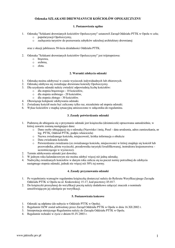 Odznaka SZLAKAMI DREWNIANYCH KOŚCIOŁÓW OPOLSZCZYZNY 1. Postanowienia ogólne 1. Odznakę "Szlakami drewnianych kościołów Opolszczyzny" ustanowił Zarząd Oddziału PTTK w Opolu w celu; o popularyzacji Opolszczyzny, o zachęcenia turystów do poznawania zabytków sakralnej architektury drewnianej oraz z okazji jubileuszu 50-lecia działalności Oddziału PTTK. 2. Odznaka "Szlakami drewnianych kościołów Opolszczyzny" jest trójstopniowa: o brązowa, o srebrna, o złota. 2. Warunki zdobycia odznaki 1. 2. 3. 4. 5. 6. Odznakę można zdobywać w czasie wycieczek indywidualnych lub zbiorowych. Odznakę zdobywa się zwiedzając drewniane kościoły Opolszczyzny. Dla uzyskania odznaki należy zwiedzić odpowiednią liczbę kościołów: o dla stopnia brązowego - 10 kościołów, o dla stopnia srebrnego - 20 kościołów, o dla stopnia złotego - 30 kościołów. Obowiązuje kolejność zdobywania odznaki. Zwiedzany kościół może być zaliczony tylko raz, niezależnie od stopnia odznaki. Wykaz kościołów z mapką sytuacyjną umieszczono w załączniku do regulaminu. 3. Zasady potwierdzania odznaki 1. 2. 3. 4. Podstawą do ubiegania się o przyznanie odznaki jest książeczka (dzienniczek) opracowana samodzielnie, w której zawarte zostaną następujące dane: o Dane osoby ubiegającej się o odznakę (Nazwisko i imię, Pesel - data urodzenia, adres zamieszkania, nr leg. PTTK, Oddział PTTK, podpis właściciela) o Nazwa zwiedzanego kościoła, miejscowość, krótka informacja o obiekcie o Data zwiedzania kościoła o Potwierdzenie zwiedzania (ze zwiedzanego kościoła, miejscowości w której znajduje się kościół lub przewodnika, pilota wycieczki, przodownika turystyki kwalifikowanej, instruktora krajoznawstwa uczestniczącego w wycieczce). Termin zdobywania odznaki jest dowolny. W jednym roku kalendarzowym nie można zdobyć więcej niż jedną odznakę. Nadwyżkę zwiedzanych kościołów w danym roku zalicza się na poczet normy potrzebnej do zdobycia następnego stopnia odznaki, jednak nie więcej niż 50% tej normy. 4. Zasady przyznawania odznaki 1. 2. Po wypełnieniu wymogów regulaminu książeczkę dostarczyć należy do Referatu Weryfikacyjnego Zarządu Oddziału PTTK w Opolu na ul. Krakowskiej 15-17, kod pocztowy 45-017. Do książeczki przesyłanej do weryfikacji pocztą należy dodatkowo załączyć znaczek o nominale umożliwiającym jej odesłąnie po weryfikacji. 5. Postanowienia końcowe 1. 2. 3. 4. Odznaki są odpłatne (do nabycia w Oddziale PTTK w Opolu). Regulamin OZW został uchwalony przez Zarząd Oddziału PTTK w Opolu w dniu 16.XII.2002 r. Interpretacja niniejszego Regulaminu należy do Zarządu Oddziału PTTK w Opolu. Regulamin wchodzi w życie z dniem 01.IV.2003 r. www.jaktrafic.prv.pl 1 powiat brzeski: Miejscowość Gmina Obiekt Obórki Olszanka Wezwanie Wiek/rok Podwyższenia Krzyża św. Polsko-katolicki XVI powiat głubczycki: Miejscowość Gmina Baborów Baborów Obiekt Wezwanie św. Józefa i św. Barbary wotywny Wiek/rok 1700 powiat kluczborski: Miejscowość Gmina Obiekt Wezwanie Wiek/rok Byczyna Biskupice filialny św. Jadwigi Śl. 1718 Byczyna Gołkowice kościół św. Jana Chrzciciela 1766 Byczyna Miechowa kościół św. Jacka XVI Byczyna Proślice kościół Najświętszego Seca PJ 1580 Byczyna Jakubowice kościół MB Królowej Polski 1585 Byczyna Nasale kościół ewangelicki (brak) 1730 powiat kluczborski: Gmina Miejscowość Obiekt Wezwanie Wniebowzięcia NMP Wiek/rok Kluczbork Bąków parafialny Kluczbork Maciejów kościół ewangelicki (brak) XVI Lasowice Wielkie Chocianowice filialny Narodzenia NMP 1663 Lasowice Wielkie Laskowice filislny św. Wawrzyńca 1686 Lasowice Wielkie Lasowice Małe filialny Wniebowzięcia NMP 1688 Lasowice Wielkie Lasowice Wielkie parafialny Wszystkich Świętych 1599 Lasowice Wielkie Wędrynia filialny św. Jana Chrzciciela 1791 Wołczyn Brzezinki kościół Narodzenia NMP 1550 Wołczyn Komorzno kościół Serca Jezusowego 1753 Wołczyn Krzywiczyny kościół Trójcy Świętej 1623 Wołczyn Rożnów kościół Trójcy Świętej 1788 Wołczyn Wierzbica Dolna kościół Podwyższenia Krzyża 1688 Św. Wołczyn Świniary Wielkie kościół św. Bartłomieja Wołczyn Gierałcice kościół ewangelicki (brak) XVI 1672 XVII powiat kozielski: www.jaktrafic.prv.pl 2 Gmina Miejscowość Obiekt Wezwanie Wiek/rok Cisek Miejsce Odrzańskie filialny św. Walentego 1770 Cisek Przewóz filialny św. Judy Tadeusza 1550 Pawłowiczki Radoszowy parafialny św. Jadwigi 1730 Pawłowiczki Gościęcin kaplica pątnicza św. Brykcjusza 1661 powiat krapkowicki: Gmina Gogolin Miejscowość Obiekt górny Malnia Wezwanie św. Franciszka Wiek/rok 1801 powiat namysłowski: Gmina Miejscowość Obiekt Wezwanie Wiek/rok Namysłów Baldwinowice kościół Trójcy Świętej 1592 Namysłów Michalice kościół św. Michała Archanioła 1614 Namysłów Smarchowice Wlk. kościół św. Krzyża 1580 Namysłów Woskowice Małe kościół św. Wawrzyńca 1711 powiat oleski: Gmina Miejscowość Obiekt Wezwanie Wiek/rok Dobrodzień Dobrodzień cmentarny św. Walentego XVII Dobrodzień Szemrowice kaplica MB Nieustającej Pomocy 1946 Gorzów Śląski Goła kościół św. Mikołaja XVII Gorzów Śląski Jamy filialny św. Mikołaja 1702 Gorzów Śląski Kozłowice parafialny św. Jana Chrzciciela XVII Gorzów Śląski Uszyce kościół Wniebowzięcia NMP 1517 Olesno Borki Wielkie filialny św. Bartłomieja 1680 Olesno Boroszów filialny św. Marii Magdaleny 1669 Olesno Grodzisko pielgrzymkowy św. Rocha 1710 Olesno Olesno filialny św. Anny 1518 Olesno Sowczyce filialny św. Antoniego XVII Olesno Stare Olesno parafialny św. Marii Magdaleny XVII Olesno Wachów filialny św. Wawrzyńca 1706 Praszka Wierzbie kościół św. Leonarda XVI Radłów Biskupice filialny św. Jadwigi Śl. 1718 Rudniki Jaworzno kościół Trójcy Świętej XVI Rudniki Żytniów kościół św. Marcina XVII www.jaktrafic.prv.pl 3 Zębowice kościół parafialny Radawie Podw