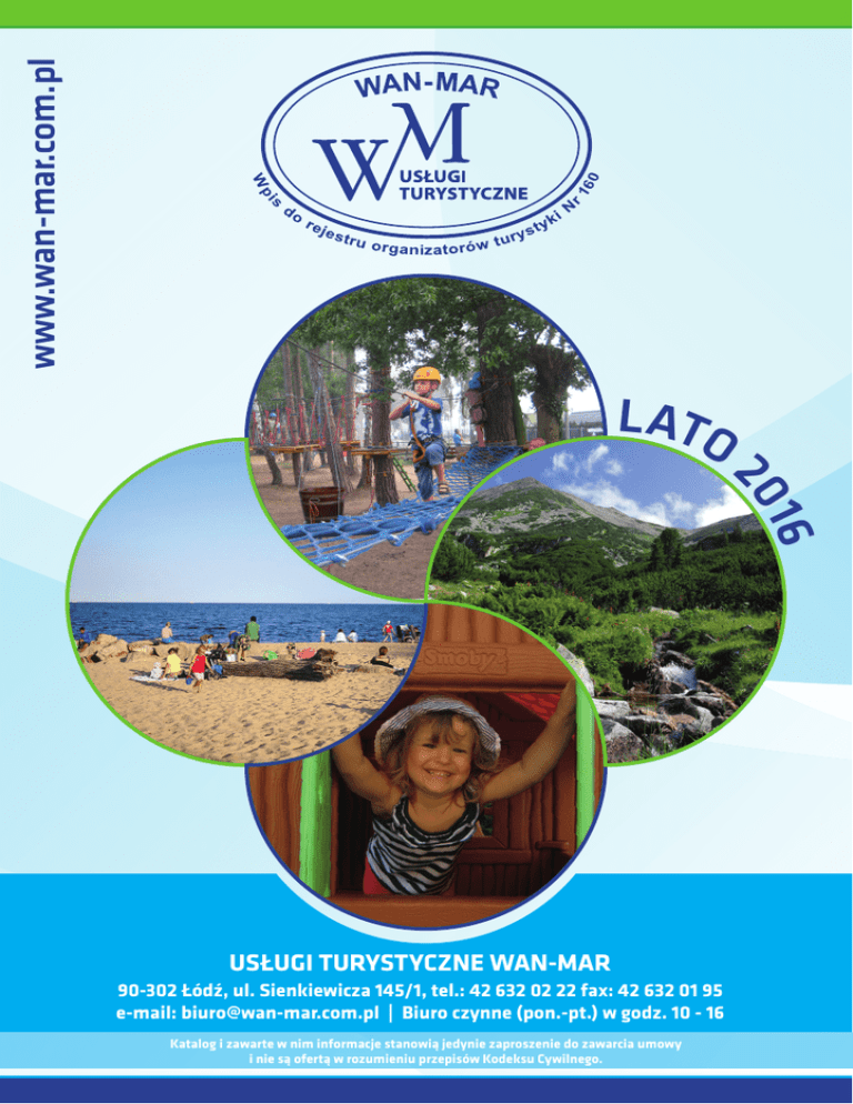www.wan-mar.com.pl LATO 16 20 USŁUGI TURYSTYCZNE WAN-MAR 90-302 Łódź, ul. Sienkiewicza 145/1, tel.: 42 632 02 22 fax: 42 632 01 95 e-mail: [email protected] | Biuro czynne (pon.-pt.) w godz. 10 - 16 Katalog i zawarte w nim informacje stanowią jedynie zaproszenie do zawarcia umowy i nie są ofertą w rozumieniu przepisów Kodeksu Cywilnego. NIECHORZE JASTRZĘBIA GÓRA POMORSKIE PASMO PRZYGÓD! WAKACJE DLA KOLEKCJONERÓW WRAŻEŃ KOLONIE (7-14 LAT) I OBÓZ (15-18 LAT) KOLONIE (7-14 LAT) I OBÓZ (15-18 LAT) TERMINY TURNUSÓW 14 DNIOWYCH: I TURNUS 03.07 – 16.07.2016 II TURNUS 17.07 – 30.07.2016 III TURNUS 31.07 – 13.08.2016 TERMINY TURNUSÓW 12 DNIOWYCH: I TURNUS 26.06 – 07.07.2016 II TURNUS 08.07 – 19.07.2016 III TURNUS 20.07 – 31.07.2016 ŚWIADCZENIA: 13 noclegów, trzy posiłki dziennie + podwieczorek (śniadania oraz kolacje w formie szwedzkiego stołu, od obiadokolacji do śniadania + prowiant na drogę), ubezpieczenie grupy NNW 2000zł (w TUiR Axa S.A.), dojazd i powrót autokarem o podwyższonym standardzie, wykwalifikowana kadra pedagogiczna, opieka medyczna, zajęcia z ratownikiem, zajęcia ZAKWATEROWANIE: w komfortowym ośrodku kolonijnym po- z animatorem, opieka przewodnika w czasie wycieczki do Trójsiadającym przestronne, słoneczne pokoje 2, 3, 4, 5 osobowe miasta, program. z łazienkami i telewizorami. Obiekt jest trwale ogrodzony. Na terenie ośrodka znajdują się: sala taneczno – sportowa, tenis sto- ŚWIADCZENIA NIE ZAWARTE W CENIE: ubezpieczenie od łowy, piłkarzyki, boisko do: siatkówki, badmintona, unihokeja, kosztów rezygnacji. plac zabaw dla dzieci: huśtawka, zjeżdżalnia, drabinki, miejsce i sprzęt do grillowania, ogród i taras wypoczynkowy. Odległość do morza ok. 500 m. JASTRZĘBIA GÓRA: położona na wysokim, 30 metrowym klifie, leży u nasady Półwyspu Helskiego, na wysuniętym najdalej na północ skrawku Polski. Porośnięte bukowym lasem zbocza z dwustuletnimi okazami drzew, urokliwy Lisi Jar oraz zapierające dech widoki stanowią o niezaprzeczalnej atrakcyjności tej okolicy. PROGRAM: •wycieczka autokarowa z przewodnikiem do Trójmiasta - Główne Miasto w Gdańsku z Ratuszem Miasta, Bazyliką Mariacką i Długim Targiem, przejście ul. Długą, Gdynia - skwer Kościuszki i jego przedłużenie, Molo Południowe, przy którym cumują legendarne statki-muzea, zwiedzanie legendarnego żaglowca „Dar Pomorza”, port jachtowy Gdyńska Marina; •wizyta w Manufakturze Słodyczy CIUCIU - pokaz ręcznego wyrobu smakowitych cukierków wraz z degustacją – po prostu PYCHA!; •wycieczka autokarowa Mierzeją Helską – pokaz karmienia fok w fokarium, sesja fotograficzna na molo w Jastarni, spacer w poprzek mierzei (od Zatoki do Bałtyku), spacer promenadą w Juracie, rejs statkiem; •piesza wycieczka na Latarnię Morską na Rozewiu oraz do Lisiego Jaru – cuda natury na własne oczy; •aktywne wakacje - zajęcia zumby oraz karate prowadzone przez instruktorów; •zajęcia team-buildingowe prowadzone przez animatora, czyli budowanie zespołu poprzez wspólne stawianie czoła wymagającym zadaniom; •wieczorne atrakcje - kaszubskie tany tany, ognisko z pieczeniem kiełbasek 2 x w turnusie, dyskoteki, kolonijne Talent Show, wieczorne gry na orientację z zadaniami; •wypoczynek bez nudy - konkursy manualne i zręcznościowe, zajęcia sportowe, plażowanie, zabawy terenowe oraz quizy przystosowane do wieku i zainteresowań uczestników; •KAŻDY UCZESTNIK OTRZYMA NAGRODĘ NIESPODZIANKĘ! CENA IMREZY: 2 1630 ZŁ NIECHORZE: urocza miejscowość nadmorska położona na Pobrzeżu Szczecińskim, pomiędzy Bałtykiem, a jeziorem Liwia – Łuża, stanowiącym ścisły rezerwat przyrody. Największym walorem miejscowości są szerokie, czyste i piaszczyste plaże oraz specyficzny mikroklimat pomocny w leczeniu wielu chorób układu oddechowego, a także układu krążenia. Zaletą miejscowości jest brak w okolicy dużych zakładów przemysłowych. basen letni, wi-fi, salę gier (bilard, piłkarzyki, tenis stołowy), salę multimedialną, siłownię a także boiska ze sztuczną i naturalną nawierzchnią do piłki nożnej, siatkowej, koszykówki, kort tenisowy, plac zabaw. ŚWIADCZENIA: 11 noclegów, trzy posiłki dziennie + podwieczorek (śniadania oraz kolacje w formie szwedzkiego stołu, od obiadokolacji do śniadania + prowiant na drogę), ubezpieczenie grupy NNW ZAKWATEROWANIE: w ośrodku wczasowo-kolonijnym po- 2000zł (w TUiR Axa S.A.), dojazd i powrót autokarem o podwyżłożonym przy samej wydmie, za którą znajduje się szeroka, szonym standardzie, wykwalifikowana kadra pedagogiczna, opieka czysta i piaszczysta plaża. Pokoje 2, 3, 4, 5 osobowe z ła- medyczna, zajęcia z ratownikiem, program. zienkami i telewizorami. Dookoła budynku strzeżonego przez agencje ochrony znajduje się duży i zagospodarowany teren ŚWIADCZENIA NIE ZAWARTE W CENIE: ubezpieczenie od zielony wspaniale nadający się do rekreacji. Ośrodek posiada: kosztów rezygnacji. PROGRAM: •wycieczka autokarowa do Międzyzdrojów - spacer Promenadą Gwiazd, gdzie znajdują się odciski gwiazd polskiego i amerykańskiego kina; •rejs statkiem po Bałtyku; •Jezioro Turkusowe, Międzynarodowy Krajobraz Roku – czyli cuda polskiej natury, które potrafią zaskoczyć niejednego odkrywcę; •wizyta w Centrum Słowian i Wikingów – udział w pradawnych warsztatach lepienia z gliny, produkcji filcu, pisania gęsimi piórami, strzelania z łuku, musztra wczesnośredniowieczna; •Zajęcia team-buildingowe „Klucz do sukcesu” – czterogodzinne zajęcia oparte na współzawodnictwie i dobrej zabawie. Koloniści podzieleni na drużyny będą musieli wykazać się kreatywnością, umiejętnością pracy w grupie, zgraniem i hartem ducha by wspólnie osiągnąć jeden cel – zwyciężyć współzawodnictwo! Jest to połączenie gier i zabaw wymagających zręczności i sprawności fizycznej oraz umiejętności główkowania, a wszystko to pod okiem czujnych 