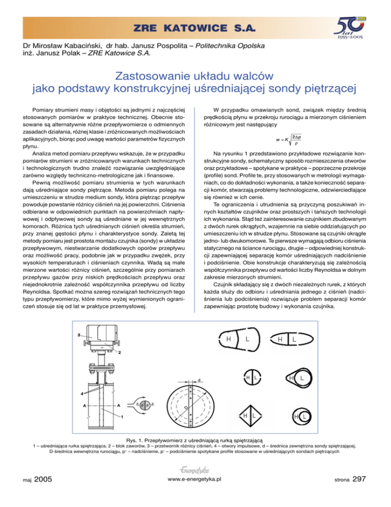 Dr Mirosław Kabaciński, dr hab. Janusz Pospolita – Politechnika Opolska inż. Janusz Polak – ZRE Katowice S.A. Zastosowanie układu walców jako podstawy konstrukcyjnej uśredniającej sondy piętrzącej Pomiary strumieni masy i objętości są jednymi z najczęściej stosowanych pomiarów w praktyce technicznej. Obecnie stosowane są alternatywnie różne przepływomierze o odmiennych zasadach działania, różnej klasie i zróżnicowanych możliwościach aplikacyjnych, biorąc pod uwagę wartości parametrów fizycznych płynu. Analiza metod pomiaru przepływu wskazuje, że w przypadku pomiarów strumieni w zróżnicowanych warunkach technicznych i technologicznych trudno znaleźć rozwiązanie uwzględniające zarówno względy techniczno-metrologiczne jak i finansowe. Pewną możliwość pomiaru strumienia w tych warunkach dają uśredniające sondy piętrzące. Metoda pomiaru polega na umieszczeniu w strudze medium sondy, która piętrząc przepływ powoduje powstanie różnicy ciśnień na jej powierzchni. Ciśnienia odbierane w odpowiednich punktach na powierzchniach napływowej i odpływowej sondy są uśredniane w jej wewnętrznych komorach. Różnica tych uśrednianych ciśnień określa strumień, przy znanej gęstości płynu i charakterystyce sondy. Zaletą tej metody pomiaru jest prostota montażu czujnika (sondy) w układzie przepływowym, niestwarzanie dodatkowych oporów przepływu oraz możliwość pracy, podobnie jak w przypadku zwężek, przy wysokich temperaturach i ciśnieniach czynnika. Wadą są małe mierzone wartości różnicy ciśnień, szczególnie przy pomiarach przepływu gazów przy niskich prędkościach przepływu oraz niejednokrotnie zależność współczynnika przepływu od liczby Reynoldsa. Spotkać można szereg rozwiązań technicznych tego typu przepływomierzy, które mimo wyżej wymienionych ograniczeń stosuje się od lat w praktyce przemysłowej. W przypadku omawianych sond, związek między średnią prędkością płynu w przekroju rurociągu a mierzonym ciśnieniem różnicowym jest następujący Na rysunku 1 przedstawiono przykładowe rozwiązanie konstrukcyjne sondy, schematyczny sposób rozmieszczenia otworów oraz przykładowe – spotykane w praktyce – poprzeczne przekroje (profile) sond. Profile te, przy stosowanych w metrologii wymaganiach, co do dokładności wykonania, a także konieczność separacji komór, stwarzają problemy technologiczne, odzwierciedlające się również w ich cenie. Te ograniczenia i utrudnienia są przyczyną poszukiwań innych kształtów czujników oraz prostszych i tańszych technologii ich wykonania. Stąd też zainteresowanie czujnikiem zbudowanym z dwóch rurek okrągłych, wzajemnie na siebie oddziałujących po umieszczeniu ich w strudze płynu. Stosowane są czujniki okrągłe jedno- lub dwukomorowe. Te pierwsze wymagają odbioru ciśnienia statycznego na ściance rurociągu, drugie – odpowiedniej konstrukcji zapewniającej separację komór uśredniających nadciśnienie i podciśnienie. Obie konstrukcje charakteryzują się zależnością współczynnika przepływu od wartości liczby Reynoldsa w dolnym zakresie mierzonych strumieni. Czujnik składający się z dwóch niezależnych rurek, z których każda służy do odbioru i uśredniania jednego z ciśnień (nadciśnienia lub podciśnienia) rozwiązuje problem separacji komór zapewniając prostotę budowy i wykonania czujnika. Rys. 1. Przepływomierz z uśredniającą rurką spiętrzającą 1 – uśredniająca rurka spiętrzająca, 2 – blok zaworów, 3 – przetwornik różnicy ciśnień, 4 – otwory impulsowe, d – średnica zewnętrzna sondy spiętrzającej, D-średnica wewnętrzna rurociągu, p+ – nadciśnienie, p– – podciśnienie spotykane profile stosowane w uśredniających sondach piętrzących maj 2005 www.e-energetyka.pl strona 297 Analiza profili walcowych czujników W pierwszym etapie poddano analizie numerycznej przyjęte układy przepływowe, aby do dalszych badań w tunelu aerodynamicznym wytypować te, o najkorzystniejszych cechach metrologicznych. Rozpatruje się układy przepływowe zamieszczone na rys. 2. wynikają z faktu, że punkt odbioru ciśnienia p– zawsze znajduje się w wyrównanym polu ciśnień ujemnych wygenerowanych przez pierwszą rurkę. W układzie ze zróżnicowanymi rurkami 2a praktycznie nie ma znaczenia miejsce odbioru ciśnienia p–. W przypadku układu 2b boczny sposób odbioru ciśnienia p– daje większe pomiarowe spadki ciśnień. Płaskie charakterystyki sond 2a i 2b zachęciły do wykonania ich prototypów i przeprowadzenia badań w tunelu aerodynamicznym. Warunki wykonania badań odpowiadały opływowi sondy strugą o płaskim profilu prędkości. Wyniki pomiarów zamieszczono na rysunku 4. Rys. 2. Rozpatrywane układy przepływowe Układy a) i b) różnią się średnicą rurki po stronie odpływowej. Rozpatruje się odpowiednio warianty z odbiorem ciśnienia odpowiednio z boku i z tyłu rurki po stronie odpływowej. Wyznaczając współczynniki K różnych układów najpierw rozpatrywano analizowane sondy jako czujniki zanurzone w strudze powietrza o płaskim profilu prędkości. Analizie numerycznej poddano izotermiczny turbulentny przepływ płynu lepkiego, nieściśliwego o stałej gęstości. Rozpatrywano zagadnienie jako dwuwymiarowe dla przyjętego zakresu prędkości w przedziale 4–30 m/s. Równania modelu matematycznego rozwiązano metodą objętości skończonych z wykorzystaniem oprogramowania Fluent. Dyskretyzacji obszaru obliczeniowego dokonano przy użyciu programu Gambit. Rys. 4. Obliczone (linie pogrubione) i wyznaczone eksperymentalnie (linie cienkie) wartości współczynnika czułości badanych sond umieszczonych w strudze powietrza o płaskim profilu prędkości Zdjęto również charakterystyki badanych sond po zainstalowaniu ich w rurociągu o średnicy D=152mm, które zamieszczono na rysunku 5. Przepływającym czynnikiem było powietrze. Również
