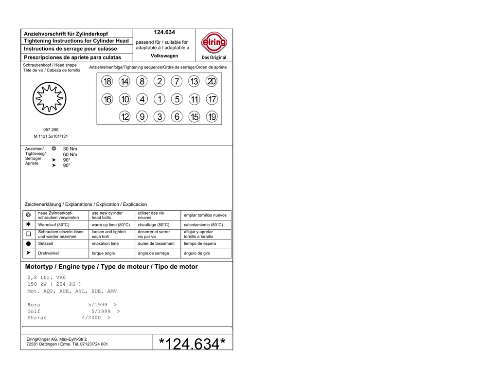 Anziehvorschrift für Zylinderkopf Tightening Instructions for Cylinder Head Instructions de serrage pour culasse 124.634 passend für / suitable for adaptable à / adaptable a Volkswagen Prescripciones de apriete para culatas Schraubenkopf / Head shape Tête de vis / Cabeza de tornillo Anziehreihenfolge/Tightening sequence/Ordre de serrage/Orden de apriete 057.290 M 11x1,5x101/131 Anziehen/ Tightening/ Serrage/ Apriete ❂ ➤ ➤ 30 Nm 60 Nm 90° 90° Zeichenerklärung / Explanations / Explication / Explicacion ❂ neue Zylinderkopfschrauben verwenden use new cylinder head bolts utiliser des vis neuves emplar tornillos nuevos ✱ Warmlauf (80°C) warm up time (80°C) chauffage (80°C) calentamiento (80°C) ❏ Schrauben einzeln lösen und wieder anziehen loosen and tighten each bolt deserrer et serrer vis par vis aflojar y apretar tornillo a tornillo ● Setzzeit relaxation time durée de tassement tiempo de espera ➤ Drehwinkel torque angle angle de serrage ángulo de giro Motortyp / Engine type / Type de moteur / Tipo de motor 2,8 Ltr. VR6 150 kW ( 204 PS ) Mot. AQP, AUE, AYL, BDE, AMV Bora Golf Sharan 5/1999 > 5/1999 > 4/2000 > ElringKlinger AG, Max-Eyth-Str.2 72581 Dettingen / Erms. Tel. 07123/724 601 *124.634*