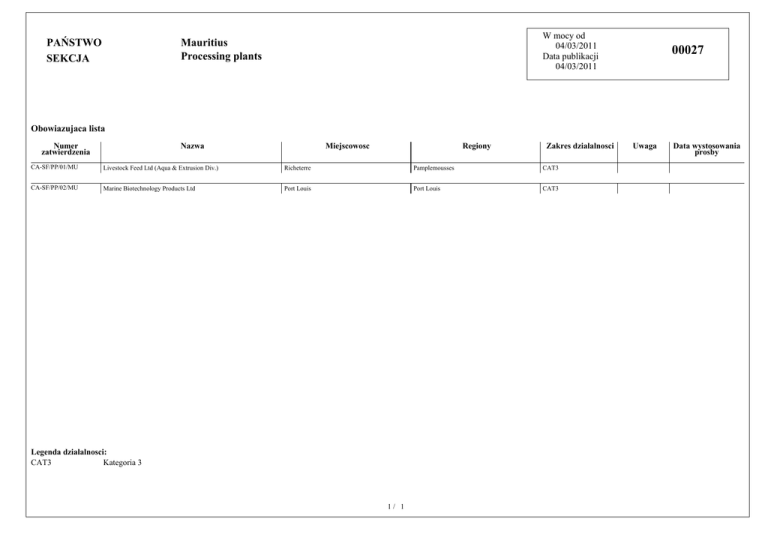 PAŃSTWO SEKCJA W mocy od 04/03/2011 Data publikacji 04/03/2011 Mauritius Processing plants 00027 Obowiazujaca lista Numer zatwierdzenia Nazwa Miejscowosc Regiony Zakres dzialalnosci CA-SF/PP/01/MU Livestock Feed Ltd (Aqua & Extrusion Div.) Richeterre Pamplemousses CAT3 CA-SF/PP/02/MU Marine Biotechnology Products Ltd Port Louis Port Louis CAT3 Legenda dzialalnosci: CAT3 Kategoria 3 1/ 1 Uwaga Data wystosowania prosby