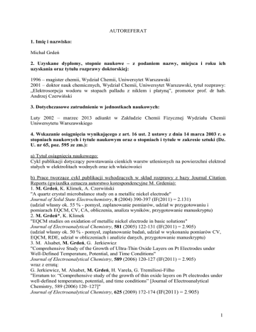 AUTOREFERAT 1. Imię i nazwisko: Michał Grdeń 2. Uzyskane dyplomy, stopnie naukowe – z podaniem nazwy, miejsca i roku ich uzyskania oraz tytułu rozprawy doktorskiej: 1996 – magister chemii, Wydział Chemii, Uniwersytet Warszawski 2001 – doktor nauk chemicznych, Wydział Chemii, Uniwersytet Warszawski, tytuł rozprawy: „Elektrosorpcja wodoru w stopach palladu z niklem i platyną”, promotor prof. dr hab. Andrzej Czerwiński 3. Dotychczasowe zatrudnienie w jednostkach naukowych: Luty 2002 – marzec 2013 adiunkt w Zakładzie Chemii Fizycznej Wydziału Chemii Uniwersytetu Warszawskiego 4. Wskazanie osiągnięcia wynikającego z art. 16 ust. 2 ustawy z dnia 14 marca 2003 r. o stopniach naukowych i tytule naukowym oraz o stopniach i tytule w zakresie sztuki (Dz. U. nr 65, poz. 595 ze zm.): a) Tytuł osiągnięcia naukowego: Cykl publikacji dotyczący powstawania cienkich warstw utlenionych na powierzchni elektrod stałych w elektrolitach wodnych oraz ich właściwości b) Prace tworzące cykl publikacji wchodzących w skład rozprawy z bazy Journal Citation Reports (gwiazdka oznacza autorstwo korespondencyjne M. Grdenia): 1. M. Grdeń, K. Klimek, A. Czerwiński "A quartz crystal microbalance study on a metallic nickel electrode" Journal of Solid State Electrochemistry, 8 (2004) 390-397 (IF(2011) = 2.131) (udział własny ok. 55 % - pomysł, zaplanowanie pomiarów, udział w przygotowaniu i pomiarach EQCM, CV, CA, obliczenia, analiza wyników, przygotowanie manuskryptu) 2. M. Grdeń*, K. Klimek "EQCM studies on oxidation of metallic nickel electrode in basic solutions" Journal of Electroanalytical Chemistry, 581 (2005) 122-131 (IF(2011) = 2.905) (udział własny ok. 50 % - pomysł, zaplanowanie badań, udział w wykonaniu pomiarów CV, EQCM, RDE, udział w obliczeniach i analizie danych, przygotowanie manuskryptu) 3. M. Alsabet, M. Grdeń, G. Jerkiewicz "Comprehensive Study of the Growth of Ultra-Thin Oxide Layers on Pt Electrodes under Well-Defined Temperature, Potential, and Time Conditions" Journal of Electroanalytical Chemistry, 589 (2006) 120-127 (IF(2011) = 2.905) wraz z erratą: G. Jerkiewicz, M. Alsabet, M. Grdeń, H. Varela, G. Tremiliosi-Filho "Erratum to: “Comprehensive study of the growth of thin oxide layers on Pt electrodes under well-defined temperature, potential, and time conditions” [Journal of Electroanalytical Chemistry, 589 (2006) 120–127]" Journal of Electroanalytical Chemistry, 625 (2009) 172-174 (IF(2011) = 2.905) 1 (łączny udział własny ok. 10-15 % - udział w obliczeniach, dyskusja wyników, udział w przygotowaniu manuskryptu) 4. M. Grdeń, A. Czerwiński "EQCM studies on Pd-Ni alloy oxidation in basic solution" Journal of Solid State Electrochemistry, 12 (2008) 375-385 (IF(2011) = 2.131) (udział własny ok. 90 % - pomysł, przygotowanie stopów, pomiary EQCM, CV, EDX, obliczenia, analiza i dyskusja wyników, przygotowanie manuskryptu) 5. M. Grdeń* "Electrochemical Quartz Crystal Microbalance Studies of a Palladium Electrode Oxidation in a Basic Electrolyte Solution", Electrochimica Acta, 54 (2009) 909-920 (IF(2011) = 3.832) (udział własny 100%) 6. M. Grdeń*, K. Klimek, Z. Rogulski "A quartz crystal microbalance study on oxidation of a cobalt electrode in an alkaline solution", Electrochemistry Communications, 11 (2009) 499-503 (IF(2011) = 4.859) (udział własny ok. 80% - pomysł, zaplanowanie i przeprowadzenie pomiarów CV, EQCM, RRDE, osadzanie kobaltu, analiza wyników, przygotowanie publikacji) 7. M. Alsabet, M. Grdeń, G. Jerkiewicz "Electrochemical Growth of Surface Oxides on Nickel. Part 1: Formation of α-Ni(OH)2 in Relation to the Polarization Potential, Polarization Time, and Temperature" Electrocatalysis, 2 (2011) 317-330 (Impact Factor ma być przyznany w 2013 roku) (udział własny ok. 50 % - udział w pomiarach CV, CA, EIS, obliczenia, dyskusja wyników, prace nad przygotowaniem manuskryptu) 8. M. Grdeń, M. Alsabet, G. Jerkiewicz "Surface science and electrochemical analysis of nickel foams" ACS Applied Materials and Interfaces, 4 (2012) 3012-3021 (IF(2011) = 4.525) (udział własny ok. 70 % - zaplanowanie przeprowadzenie pomiarów CV, EIS, XPS, przygotowanie materiałów elektrodowych, dyskusja wyników, obliczenia, prace nad przygotowaniem manuskryptu) 9. M. Grdeń*, J. Jagiełło "Oxidation of electrodeposited cobalt electrodes in an alkaline electrolyte" Journal of Solid State Electrochemistry, 17 (2013) 145-156 (IF(2011) = 2.131) (udział własny ok. 50 % - pomysł, zaplanowanie badań, udział w wykonaniu pomiarów CV, CA, EQCM, RRDE, przygotowanie próbek i analiza wyników XPS, udział w obliczeniach, przygotowanie manuskryptu) c) Omówienie celu naukowego ww. prac i osiągniętych wyników wraz z omówieniem ich ewentualnego wykorzystania 1. Wstęp Cykl publikacji będący podstawą przewodu habilitacyjnego dotyczy głównie zjawisk związanych z elektrochemicznym tworzeniem cienkich warstw utlenionych (tlenki/wodorotlenki) na elektrodach metalicznych w roztworach wodnych elektrolitów. Pojęcie „tworzenie cienkich warstw” oznacza tutaj wczesne etapy utlenienia powierzchni, zaczynające się od powierzchni metalicznej (zredukowanej) prowadzące do powstania warstw utlenionych (tlenków/wodorotlenków) o grubości od poniżej do kilku warstw atomowych/molekularnych. W przypadku wielu reakcji elektrochemicznych o znaczeniu praktycznym powierzchnia elektrod metalicznych, zarówno szlachetnych, nieszlachetnych jak i ich stopów, może być w znacznym stopniu utleniona. Dotyczy to n.p. technologicznie ważnych reakcji 2 wydzielania tlenu czy utleniania/redukcji prostych związków organicznych bądź reakcji z udziałem tlenków węgla. Powstała warstwa utleniona może być zarówno przeszkodą w przebiegu tych reakcji, n.p. z powodu jej niemetalicznych właściwości [1-3], lub też je promować biorąc w nich czynny udział jako reagent-katalizator [4-7]. Dla metali nieszlachetnych, które charakteryzują się sil