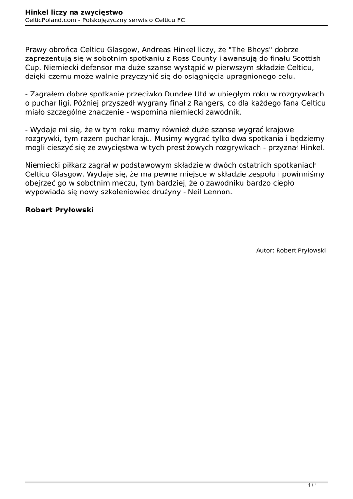 Hinkel liczy na zwycięstwo CelticPoland.com - Polskojęzyczny serwis o Celticu FC Prawy obrońca Celticu Glasgow, Andreas Hinkel liczy, że "The Bhoys" dobrze zaprezentują się w sobotnim spotkaniu z Ross County i awansują do finału Scottish Cup. Niemiecki defensor ma duże szanse wystąpić w pierwszym składzie Celticu, dzięki czemu może walnie przyczynić się do osiągnięcia upragnionego celu. - Zagrałem dobre spotkanie przeciwko Dundee Utd w ubiegłym roku w rozgrywkach o puchar ligi. Później przyszedł wygrany finał z Rangers, co dla każdego fana Celticu miało szczególne znaczenie - wspomina niemiecki zawodnik. - Wydaje mi się, że w tym roku mamy również duże szanse wygrać krajowe rozgrywki, tym razem puchar kraju. Musimy wygrać tylko dwa spotkania i będziemy mogli cieszyć się ze zwycięstwa w tych prestiżowych rozgrywkach - przyznał Hinkel. Niemiecki piłkarz zagrał w podstawowym składzie w dwóch ostatnich spotkaniach Celticu Glasgow. Wydaje się, że ma pewne miejsce w składzie zespołu i powinniśmy obejrzeć go w sobotnim meczu, tym bardziej, że o zawodniku bardzo ciepło wypowiada się nowy szkoleniowiec drużyny - Neil Lennon. Robert Pryłowski Autor: Robert Pryłowski 1/1 Powered by TCPDF (www.tcpdf.org)