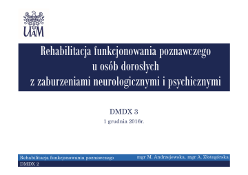 Rehabilitacja funkcjonowania poznawczego u osób dorosłych z zaburzeniami neurologicznymi i psychicznymi DMDX 3 1 grudnia 2016r. Rehabilitacja funkcjonowania poznawczego DMDX 2 mgr M. Andrzejewska, mgr A. Złotogórska Plan zajęć • Rozgałęzianie • Czyszczenie wyników • Analiza wyników Rehabilitacja funkcjonowania poznawczego DMDX 2 mgr Agata Złotogórska mgr M. Andrzejewska mgr A. Złotogórska 2/35 Bodźce dźwiękowe Zadanie Badanemu prezentowany jest punkt fiksacji, dźwięk (lub brak dźwięku), a następnie obraz. Jeżeli pojawi się dźwięk, zadaniem badanego jest naciśnięcie lewego klawisza Shift, gdy zobaczy koło, a prawego, gdy zobaczy kwadrat. Gdy nie ma dźwięku badany ma za zadanie naciśnięcie lewego klawisza Shift, gdy figura jest niebieska i prawego, gdy jest zielona. Rehabilitacja funkcjonowania poznawczego DMDX 2 mgr Agata Złotogórska mgr M. Andrzejewska mgr A. Złotogórska 3/25 Bodźce dźwiękowe <N 4> <fd 17> <s 2><cr><d 20><t 2000><vm 1366, 768, 768, 32, 60> <id #keyboard><mpr+#54> <mr+#57> <mnr +#42><NoFeedbackTime> $ 00 <ln -2> “Instrukcja”, <ln 0> “Koło, czy kwadrat?”, <ln 2> “koło – lewy klawisz SHIFT”, <ln 3> “kwadrat – prawy klawisz SHIFT”, <ln 5> “Aby przejść dalej naciśnij spację.”; 00 “Zaczniemy od części próbnej”; +9 %40 “+” /* <psaf 600><wav 1>”dźwięk7”/ <bmp> “kwadrat_niebieski” <cfb "DOBRZE"><wfb "ŹLE"> <tlfb ”KONIEC CZASU”> ; +7 %40 “+” /* <psaf 600><wav 1>”dźwięk7”/ <bmp> “kolo_zielone” <cfb "DOBRZE"><wfb"ŹLE"><tlfb ”KONIEC CZASU”> ; +991 <ln 0,5> ”+” %40 / * <bmp> “kwadrat_niebieski” <cfb "DOBRZE"><wfb "ŹLE"><tlfb”KONIEC CZASU”> ; -992 <ln 0,5> ”+” %40 / * <bmp> “kolo_zielone” <cfb "DOBRZE"><wfb "ŹLE"><tlfb”KONIEC CZASU”> ; 00 <ln 0> “Koniec części próbnej.”, <ln 2> “Teraz już nie będzie informacji zwrotnych.”;$ +14 <ln 0,5> ”+” %40 / * <bmp> ”kwadrat_niebieski” ; -15 <ln 0,5> ”+” %40 / * <bmp> ”kolo_zielone” ; +16 <ln 0,5> ”+” %40 / * <bmp> ”kwadrat_zielony” ; -17 <ln 0,5> ”+” %40 / * <bmp> ”kolo_niebieskie” ; $00 “Koniec”;$ Rehabilitacja funkcjonowania poznawczego DMDX 2 mgr Agata Złotogórska mgr M. Andrzejewska mgr A. Złotogórska 4/25 Bodźce wideo • .avi, .mov • reszta analogicznie Rehabilitacja funkcjonowania poznawczego DMDX 2 mgr Agata Złotogórska mgr M. Andrzejewska mgr A. Złotogórska 5/25 Rozgałęzianie • branching • czyli odpowiednik „if” • określamy, co ma się stać, jeżeli badany odpowie źle, a co jeśli dobrze • <bic N> - Branch If Correct • <biw N> - Branch If Wrong • <binr N> - Branch If No Response • N – numer bodźca Rehabilitacja funkcjonowania poznawczego DMDX 2 mgr Agata Złotogórska mgr M. Andrzejewska mgr A. Złotogórska 6/25 Rozgałęzianie • <N 4> <fd 17> <s 2><cr> <d 50> <t 2000> <vm 1366, 768, 768, 24, 60> <id #keyboard> <mpr +#200> <mr +#57> <mnr +#208><NoFeedbackTime> • • • • • • • • • • • $ 00 <ln -2> “Instrukcja”; 00 “Zaczniemy od części próbnej”; +991 <ln 0,5> ”+” %40 / * <bmp> “kwadrat_niebieski”; -992 <ln 0,5> ”+” %40 / * <bmp> “kolo_zielone”<biw 991>; 00 <ln 0> “Koniec części próbnej.”, <ln 2> “Teraz już nie będzie informacji zwrotnych.”;$ +01 <ln 0,5> ”+” %40 / * <bmp> ”kwadrat_niebieski” ; -02 <ln 0,5> ”+” %40 / *<bmp> ”kolo_niebieskie” ; +03 <ln 0,5> ”+” %40 /* <bmp> ”kwadrat_zielony” ; -04 <ln 0,5> ”+” %40 / * <bmp> ”kolo_zielone” ; $00 “Koniec”;$ Rehabilitacja funkcjonowania poznawczego DMDX 2 mgr Agata Złotogórska mgr M. Andrzejewska mgr A. Złotogórska 7/25 Rozgałęzianie • Co jeszcze? • <bierGT B,N> - Branch If Error Rate Greater • B – ilość błędów • N – numer bodźca • <bierLE B,N> - Branch If Error Rate Lower • i wiele innych… Rehabilitacja funkcjonowania poznawczego DMDX 2 mgr Agata Złotogórska mgr M. Andrzejewska mgr A. Złotogórska 8/25 Wyniki Rehabilitacja funkcjonowania poznawczego DMDX 2 mgr Agata Złotogórska mgr M. Andrzejewska mgr A. Złotogórska 9/55 Wyniki Rehabilitacja funkcjonowania poznawczego DMDX 2 mgr Agata Złotogórska mgr M. Andrzejewska mgr A. Złotogórska 10/55 Wyniki kolejność badanych ********************************************************************** Subject 1, 12/17/2014 15:39:44 on NINA, refresh 16.67ms, ID D34 Item RT COT 21 5478.58 0.00 22 5834.72 13469.23 23 -1869.65 28505.41 24 2669.32 45825.37 25 1927.64 57077.51 26 -1079.99 66245.91 21 2423.43 82098.92 22 4543.62 87433.27 23 3986.25 114021.65 24 5215.43 122439.91 25 1957.97 131258.27 26 3475.76 140660.05 ! Failed to build trianglesandtextures ! Display Device Lost (possibly due to another application stealing focus), Restoring ! Display error at msec 237118.76, tick 14298 in item 112147, frame " +" ! moved into video memory 21 ticks late ! (previous frame's duration will have been longer) 112147 1397.97 152262.25 Rehabilitacja funkcjonowania poznawczego DMDX 2 mgr Agata Złotogórska mgr M. Andrzejewska mgr A. Złotogórska 11/55 Wyniki data i godzina badania ********************************************************************** Subject 1, 12/17/2014 15:39:44 on NINA, refresh 16.67ms, ID D34 Item RT COT 21 5478.58 0.00 22 5834.72 13469.23 23 -1869.65 28505.41 24 2669.32 45825.37 25 1927.64 57077.51 26 -1079.99 66245.91 21 2423.43 82098.92 22 4543.62 87433.27 23 3986.25 114021.65 24 5215.43 122439.91 25 1957.97 131258.27 26 3475.76 140660.05 ! Failed to build trianglesandtextures ! Display Device Lost (possibly due to another application stealing focus), Restoring ! Display error at msec 237118.76, tick 14298 in item 112147, frame " +" ! moved into video memory 21 ticks late ! (previous frame's duration will have been longer) 112147 1397.97 152262.25 Rehabilitacja funkcjonowania poznawczego DMDX 2 mgr Agata Złotogórska mgr M. Andrzejewska mgr A. Złotogórska 12/55 Wyniki nazwa kom