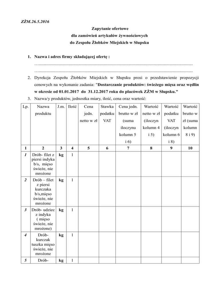ZŻM.26.5.2016 Zapytanie ofertowe dla zamówień artykułów żywnościowych do Zespołu Żłobków Miejskich w Słupsku 1. Nazwa i adres firmy składającej ofertę : …........................................................................................................................................... …........................................................................................................................................... 2. Dyrekcja Zespołu Żłobków Miejskich w Słupsku prosi o przedstawienie propozycji cenowych na wykonanie zadania: "Dostarczanie produktów: świeżego mięsa oraz wędlin w okresie od 01.01.2017 do 31.12.2017 roku do placówek ZŻM w Słupsku." 3. Nazwa/y produktów, jednostka miary, ilość, cena oraz wartość: Lp. Nazwa J.m. Ilość produktu Cena Stawka jedn. podatku brutto w zł netto w zł VAT Cena jedn. Wartość 3 4 1 Drób- filet z kg piersi indyka b/s, mięso świeże, nie mrożone 1 2 Drób – filet z piersi kurczaka b/s,mięso świeże, nie mrożone kg 1 3 Drób- udziec kg z indyka ( mięso świeże, nie mrożone) 1 4 Dróbkg kurczak tuszka mięso świeże, nie mrożone 1 5 2 Drób- kg 1 5 6 Wartość netto w zł podatku brutto w (suma (iloczyn VAT zł (suma iloczynu kolumn 4 (iloczyn kolumn kolumn 5 i 5) kolumn 6 8 i 9) i 6) 1 Wartość 7 i 8) 8 9 10 ćwiartka kurczaka, mięso świeże, nie mrożone 6 Wędlinaszynka drobiowa 80%- typu polędwica z indyka, szynka z indyka. kg 1 7 Wieprzowin a- schab b/k mięso świeże, nie mrożone kg 1 8 Wieprzowin a- łopatka b/k , bez tłuszczu i skóry,mięso świeże, nie mrożone szt 1 9 Wieprzowin a- szynka b/k bez tłuszczu i skóry,mięso świeże, nie mrożone kg 1 10 Wędlina wieprzowaszynka 80% gotowana kg 1 11 Kości karkowe kg 1 12 Wołowina bez kości extra kg 1 Wartość pakietu netto ….................................................. VAT …..................................................... Wartość pakietu brutto …................................................ Słownie …............................................... 4. Termin i miejsce złożenia propozycji cenowej: Oferty należy złożyć w kopercie w terminie do dnia 9 grudnia 2016 roku do godziny 15:00 w Zespole Żłobków Miejskich w Słupsku. 5. Na kopercie należy umieścić nazwę i adres Zamawiającego, nazwę i adres Wykonawcy oraz napis: „Propozycja cenowa na wykonanie zadania: dostarczanie produktów: świeżego mięsa oraz wędlin w okresie od 01.01.2017 r do 31.12.2017 roku.” 6. Osobą uprawnioną do kontaktów z wykonawcami jest: Pani Intendent Mirosława Zaborowska (nr tel: 59-842-67-56). 7. Informacje dotyczące zawarcia umowy: niezwłocznie po wyborze najkorzystniejszej propozycji cenowej Zamawiający dostarczy do Wykonawcy umowę w sprawie realizacji przedmiotu zamówienia. 8. Istotne postanowienia, które zostaną wprowadzone do treści umowy: a) Warunki dostawy towaru: • Oferent dostarcza produkty w dokładnie określonej ilości przez Zamawiającego. • Dostawa towaru do placówek Zespołu Żłobków Miejskich w Słupsku pojazdem ze świadectwem do przewozu danego rodzaju towaru wydanym przez SANEPID. • Gwarancja najwyższej jakości towaru. • Terminowość dostaw (zgodnie z zamówieniem). • Możliwość zmiany wielkości zamówienia z 3 godzinnym wyprzedzeniem. b) Warunki płatności: Przelew z 14-dniowym terminem płatności. 9. Ceny przedstawione w zapytaniu ofertowym mogą wzrastać lub spadać zgodnie z cenami na rynku lokalnym giełdy towarowej. Każda zmiana ceny powinna być konsultowana z Zamawiającym. Data i pieczęć dostawcy: Data i pieczęć odbiorcy: