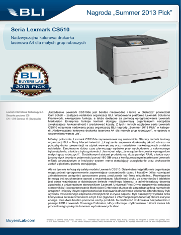 Nagroda „Summer 2013 Pick” BUYERS LAB BUYERS LAB Seria Lexmark CS510 Nadzwyczajna kolorowa drukarka laserowa A4 dla małych grup roboczych 2013 Lexmark International Technology S.A. Skrzynka pocztowa 508 CH - 1215 Genewa 15 (Szwajcaria) „Urządzenie Lexmark CS510de jest bardzo niezawodne i łatwe w obsłudze” powiedział Carl Schell – zastępca redaktora organizacji BLI. Wbudowana platforma Lexmark Solutions Framework, ekologiczne funkcje, a także dostępne za pomocą oprogramowania Lexmark Markvision Enterprise funkcje kontroli dostępu zapewniają organizacjom narzędzia zwiększające funkcjonalność i zredukować koszty. Z tych i innych względów seria Lexmark CS510 otrzymała nadawaną przez organizację BLI nagrodę „Summer 2013 Pick” w kategorii „Nadzwyczajna kolorowa drukarka laserowa A4 dla małych grup roboczych”. w oparciu o wspomnianą wersję „de”. Mówiąc potocznie, Lexmark CS510de zaprezentował się znakomicie. Starszy technik testowy organizacji BLI – Tony Maceri twierdzi: „Urządzenie zapewnia doskonałą jakość obrazu na potrzeby druku prezentacji na użytek wewnętrzny oraz materiałów marketingowych o niskim nakładzie. Zanotowano dobry czas pierwszego wydruku przy wychodzeniu z całonocnego trybu uśpienia, a także z trybu gotowości. Jasne jest więc, że urządzenie sprosta wymaganiom małych grup roboczych”. Dodatkowymi atutami produktu są: duża pamięć RAM, a także opcjonalny dysk twardy o pojemności ponad 160 GB wraz z konfigurowalnym interfejsem Lexmark e-Task wyposażonym w intuicyjny system menu ułatwiający przeglądanie oraz drukowanie zadań z poziomu panelu sterującego. Ale na tym nie kończą się zalety modelu Lexmark CS510. Dzięki otwartej platformie organizacje mogą pobrać oprogramowanie zapewniające oszczędność czasu i kosztów (kilka rozwiązań zainstalowano wstępnie) opracowane przez producenta lub firmy niezależne.. Rozwiązania te mogą być uruchamiane wprost z wyświetlacza. Możliwość druku ze smartfonów i tabletów jest coraz ważniejsza w dzisiejszym świecie mobilnego biznesu, a administratorzy docenią zgodność z uniwersalnym sterownikiem Lexmark Universal Print Driver (usprawnia instalację sterowników) i oprogramowanie Markvision Enterprise służące do zarządzania flotą rozmaitych urządzeń i między innymi ograniczania lub blokowania drukowania w kolorze. Standardowy tryb wydruku dwustronnego zapewnia zmniejszenie zużycia papieru, tryb oszczędny wydłuża czas korzystania ze kaset z tonerem a tryb Eco (zgodnie z informacjami producenta) obniża zużycie energii. Inne dwie bardzo pomocne cechy produktu to możliwość drukowania bezpośrednio z pamięci USB i Lexmark Coverage Estimator, który informuje użytkowników o ilości tonera lub procentowego pokrycia tonerem wydrukowanych stron. BuyersLab.com Powielono za pisemną zgodą Buyers Laboratory LLC. Powielanie tego raportu bez pisemnej zgody Buyers Laboratory jest niezgodne z prawem oraz podlega karze. © 2013 Buyers Laboratory LLC. W celu zakupu niniejszych publikacji należy skontaktować się z organizacją BLI wysyłając wiadomość e-mail na adres [email protected]. Nagroda „Summer 2013 Pick” BUYERS LAB BUYERS LAB „Wyjątkowe korzyści są obficie oferowane przez sprzęt tej serii” powiedział Schell. „Świetne wyniki uzyskane podczas testów oraz rewelacyjny zestaw funkcji świadczą o mocy i funkcjonalności, w które Lexmark wyposażył te dwie drukarki nabiurkowe”. „Kolorowe drukarki laserowe serii CS510 posiadają wiele cech typowych dla sprzętu klasy „enterprise”, które Lexmark przeniósł do sprzętu przeznaczonego dla małych i średnich grup roboczych. - wszystko to mieści się w niewielkich gabarytach urządzenia” powiedział Marty Canning – wiceprezes wykonawczy firmy Lexmark oraz prezes działu Imaging Solutions and Services. „Ponadto, funkcje druku kolorowego i pasowania kolorów są niespotykane w branży dla takiego urządzenia A4. Cieszy nas, że urządzenie Lexmark serii CS510 otrzymało wyróżnienie w postaci nagrody „Pick” przyznawanej przez organizację BLI”. Organizacja BLI bardzo poleca urządzenie Lexmark CS510de do użytku w środowiskach, których miesięczne zapotrzebowanie na wydruki wynosi do 5 000 arkuszy. Drugie urządzenie z serii – Lexmark CS510dte jest identyczne z wersją „de”. Różnica polega na większej pojemności podajników mieszczących 900 arkuszy (wersja „de” mieści 250 arkuszy). Nagrody BLI Pick — informacje Dwa razy do roku w dowód szczególnego uznania organizacja BLI przyznaje nagrody „Pick”. Nagradzane są produkty, które osiągnęły nadzwyczajne wyniki podczas wyczerpujących testów laboratoryjnych. Nagrody BLI są przyznawane w oparciu o rygorystyczne testy laboratoryjne trwające około dwa miesiące. Proces oceniania obejmuje rozległy test wytrzymałościowy, podczas którego każde urządzenie pracuje w maksymalnym cyklu pracy podawanym przez producenta. Test wytrzymałościowy BLI jest wyjątkowy na tle wszystkich rankingów sprzętu biurowego, co powoduje, że rekomendacje BLI w zakresie niezawodności są szczególnie wartościowe dla nabywców oraz dyrektorów działów IT. Inne aspekty uwzględniane podczas testów to między innymi łatwość obsługi, wydajność, cena i obsługa nośników. Każdy produkt, który pomyślnie przejdzie testy laboratoryjne organizacji BLI, otrzymuje znak „Rekomendowane przez BLI” lub „Wyjątkowo rekomendowane przez BLI” oraz „Certyfikat niezawodności” a najlepsze produkty kwalifikują się do konkursu „Pick”. Jak widać nagrody „Pick” są bardzo zasłużonym wyróżnieniem, którym nabywcy i dyrektorzy IT mogą się kierować przy podejmowaniu decyzji o zakupie. Buyers Laboratory LLC • Ameryka Północna • Europa • Azja John Lawler, prezes Anthony F. Polifrone, dyrektor zarządzający John Donnelly, dyrektor zarządzający, BLI Internation