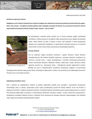 Informacja prasowa, luty 2015 W klimacie bajecznej Toskanii Wyjątkowy urok Toskanii nieodmiennie zachwyca każdego, kto odwiedzi jej miasteczka położone pośród zielonych wzgórz. Siena, Piza, Arezzo – oto główne punkty podróży, które zapadają w pamięć tak bardzo, że po powrocie koniecznie chcemy zaprowadzić przed domem klimat tamtych miejsc. Pytanie – jak to zrobić? W poszukiwaniu inspiracji warto zwrócić się w stronę kanonów piękna toskańskiej architektury. Wbrew pozorom nie będą to tylko powszechnie znane zabytki, jak pizańska wieża, zamki Chianti czy plac Il Campo w Sienie. Styl toskański o wiele przejrzyściej objawia się w codziennym krajobrazie: w zakamarkach malutkich uliczek czy na tarasach starych willi, a te bez trudu można przystosować do polskiego krajobrazu. Esencja Toskanii Na tle zielonych wzgórz porosłych winnicami i gajami oliwnymi można dostrzec charakterystyczne dla Toskanii budowle wykonane z jasnego trawertynu, piaskowca czy marmuru. Surowe mury – często nieoszlifowane i szorstkie zachwycają jednocześnie swoimi naturalnymi barwami. Oliwkowe zielenie, cieple beże i brązy, słoneczne żółcie, Polbruk Carmino, fot. Polbruk S.A. zgaszone szarości czy intensywne ochry – różnobarwne plamki organicznych struktur układają się tutaj w niepowtarzalne mozaikowe kompozycje. Skąpane w promieniach włoskiego słońca budynki zdają się być lekkie, zachęcają do odpoczynku i relaksu. Jak przenieść je do najbliższego otoczenia? Pomoże nam w tym kostka brukowa. Kalejdoskop kształtów i barw Jeśli z podróży po wielobarwnej Toskanii w pamięci najbardziej zapadły nam porządek i przemyślana kompozycja sieneńskiego placu Il Campo, zaaranżujmy część naszej przydomowej przestrzeni kostką Polbruk Teriso lub Granito o regularnym kształcie i ciepłym, piaskowym odcieniu. W odzwierciedlaniu różnokolorowych mozaik podpatrzonych na ulicach Pizy pomocne będą kostki utrzymane w intensywnych odcieniach czerwieni, brązów i oranżu. Postarzana powierzchnia i nieregularne krawędzie Polbruk Carmino i Nostalite Prima przemycą do naszego otoczenia nieprzemijający urok włoskich miast, dając nam odrobinę Italii pod polskim niebem. Kontakt dla mediów: Katarzyna Stankiewicz, Polbruk tel.: 58 554 59 60, 605 634 591 e-mail: [email protected] Włoski lifestyle Życie w toskańskich miasteczkach ma niespieszny, swobodny rytm i toczy się wokół zielonych placów i ogrodów. To tego towarzyskiego, przyjacielskiego sposobu na życie można najbardziej zazdrościć mieszkańcom Sieny czy Pizy. Stworzenie we własnym otoczeniu miejsca spotkań przywodzącego na myśl rozgrzany słońcem bruk Toskanii nie musi być trudne. Garść włoskich inspiracji i ciekawy pomysł mogą przemienić każdy ogród w centrum podmiejskiego życia towarzyskiego. Skoro Włosi grają w szachy pod murami Watykanu, to co może stać na przeszkodzie nam? www.polbruk.pl Polbruk S.A. - część irlandzkiej grupy CRH plc specjalizuje się w wytwarzaniu najwyższej jakości kostki brukowej, betonowych wyrobów drogowych i innych elementów małej architektury. Od ponad 20 lat dostarczamy Państwu materiały do aranżacji pięknych i trwałych nawierzchni, a wsparcie ze strony CRH - jednego z największych dystrybutorów materiałów budowlanych na świecie – pozwala nam wciąż się rozwijać i dążyć do tego, by kreowane przez nas przestrzenie nabierały niezwykłego charakteru. Polbruk S.A. jest największym producentem kostki i wyrobów drogowych w Polsce. Nasze produkty są powszechnie rozpoznawalne i dostępne na terenie całego kraju. Pozycja lidera zobowiązuje nas do ciągłej rozbudowy sieci dystrybucji, utrzymywania wysokiej jakości i nieustannego poszukiwania nowych rozwiązań. Bogactwo oferowanych kolekcji ich zróżnicowane wzornictwo - odpowiada aktualnym trendom stylistycznym i daje nieograniczone możliwości. Polbruk S.A. ul. Nowy Świat 16 c, 80-299 Gdańsk www.polbruk.pl www.facebook.com/Polbruk Kontakt dla mediów: Katarzyna Stankiewicz, Polbruk tel.: 58 554 59 60, 605 634 591 e-mail: [email protected]