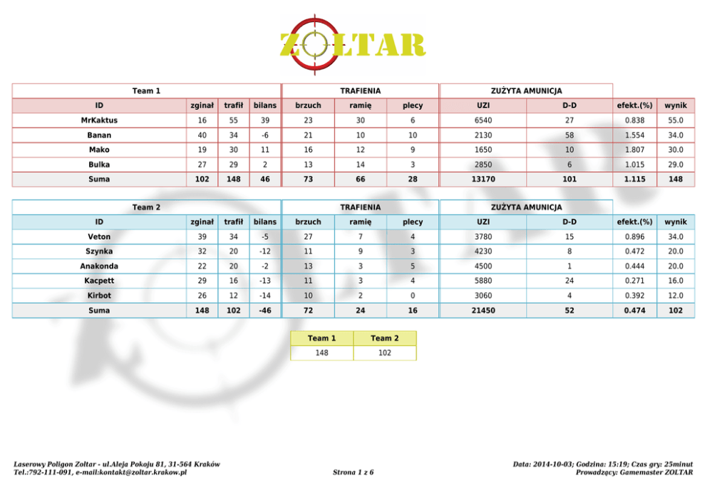 Team 1 TRAFIENIA ZUŻYTA AMUNICJA ID zginał trafił bilans brzuch ramię plecy UZI D-D efekt.(%) wynik MrKaktus 16 55 39 23 30 6 6540 27 0.838 55.0 Banan 40 34 -6 21 10 10 2130 58 1.554 34.0 Mako 19 30 11 16 12 9 1650 10 1.807 30.0 Bulka 27 29 2 13 14 3 2850 6 1.015 29.0 Suma 102 148 46 73 66 28 13170 101 1.115 148 Team 2 TRAFIENIA ZUŻYTA AMUNICJA ID zginał trafił bilans brzuch ramię plecy UZI D-D efekt.(%) wynik Veton 39 34 -5 27 7 4 3780 15 0.896 34.0 Szynka 32 20 -12 11 9 3 4230 8 0.472 20.0 Anakonda 22 20 -2 13 3 5 4500 1 0.444 20.0 Kacpett 29 16 -13 11 3 4 5880 24 0.271 16.0 Kirbot 26 12 -14 10 2 0 3060 4 0.392 12.0 Suma 148 102 -46 72 24 16 21450 52 0.474 102 Laserowy Poligon Zoltar - ul.Aleja Pokoju 81, 31-564 Kraków Tel.:792-111-091, e-mail:[email protected] Team 1 Team 2 148 102 Strona 1 z 6 Data: 2014-10-03; Godzina: 15:19; Czas gry: 25minut Prowadzący: Gamemaster ZOLTAR Team 1 TRAFIENIA ZUŻYTA AMUNICJA ID zginał trafił bilans brzuch ramię plecy UZI D-D efekt.(%) wynik Kacpet 49 61 12 48 19 10 2550 143 2.265 61.0 Szynka 51 50 -1 24 25 4 6180 6 0.808 50.0 Kirbot 39 48 9 30 14 9 4770 13 1.004 48.0 MrKaktus 15 29 14 11 21 2 7440 10 0.389 29.0 Suma 154 188 34 113 79 25 20940 172 0.890 188 Team 2 TRAFIENIA ZUŻYTA AMUNICJA ID zginał trafił bilans brzuch ramię plecy UZI D-D efekt.(%) wynik Anakonda 39 41 2 27 18 4 5970 12 0.685 41.0 Bulka 41 37 -4 27 3 7 4980 0 0.743 37.0 Mako 15 33 18 12 17 7 3930 1 0.839 33.0 Banan 50 22 -28 12 12 3 3510 39 0.620 22.0 Veton 44 21 -22 17 3 2 4020 23 0.519 21.0 Suma 189 154 -34 95 53 23 22410 75 0.685 154 Laserowy Poligon Zoltar - ul.Aleja Pokoju 81, 31-564 Kraków Tel.:792-111-091, e-mail:[email protected] Team 1 Team 2 188 154 Strona 2 z 6 Data: 2014-10-03; Godzina: 16:04; Czas gry: 25minut Prowadzący: Gamemaster ZOLTAR Drużyny Miejsce Laserowy Poligon Zoltar - ul.Aleja Pokoju 81, 31-564 Kraków Tel.:792-111-091, e-mail:[email protected] Nazwa Rozgrywki 1 2 Suma Team 1 148 188 336 Team 2 102 154 256 Strona 3 z 6 Data: 2014-10-03 Prowadzący: Gamemaster ZOLTAR Zestawienie wg wyniku Miejsce TRAFIENIA ZUŻYTA AMUNICJA ID zginał trafił bilans brzuch ramię plecy UZI D-D efekt.(%) wynik Kacpet 117.60 146.40 28.80 115.20 45.60 24.00 6120.00 343.20 2.265 146.40 MrKaktus 37.20 100.80 63.60 40.80 61.20 9.60 16776.00 44.40 0.599 100.80 Szynka 99.60 84.00 -15.60 42.00 40.80 8.40 12492.00 16.80 0.672 84.00 4 Bulka 81.60 79.20 -2.40 48.00 20.40 12.00 9396.00 7.20 0.842 79.20 5 Mako 40.80 75.60 34.80 33.60 34.80 19.20 6696.00 13.20 1.127 75.60 6 Anakonda 73.20 73.20 0.00 48.00 25.20 10.80 12564.00 15.60 0.582 73.20 7 Kirbot 78.00 72.00 -6.00 48.00 19.20 10.80 9396.00 20.40 0.765 72.00 8 Banan 108.00 67.20 -40.80 39.60 26.40 15.60 6768.00 116.40 0.976 67.20 9 Veton 99.60 66.00 -33.60 52.80 12.00 7.20 9360.00 45.60 0.702 66.00 10 Kacpett 69.60 38.40 -31.20 26.40 7.20 9.60 14112.00 57.60 0.271 38.40 Laserowy Poligon Zoltar - ul.Aleja Pokoju 81, 31-564 Kraków Tel.:792-111-091, e-mail:[email protected] Strona 4 z 6 Data: 2014-10-03 Prowadzący: Gamemaster ZOLTAR Zestawienie wg bilansu Miejsce TRAFIENIA ZUŻYTA AMUNICJA ID zginał trafił bilans brzuch ramię plecy UZI D-D efekt.(%) wynik MrKaktus 37.20 100.80 63.60 40.80 61.20 9.60 16776.00 44.40 0.599 100.80 Mako 40.80 75.60 34.80 33.60 34.80 19.20 6696.00 13.20 1.127 75.60 Kacpet 117.60 146.40 28.80 115.20 45.60 24.00 6120.00 343.20 2.265 146.40 4 Anakonda 73.20 73.20 0.00 48.00 25.20 10.80 12564.00 15.60 0.582 73.20 5 Bulka 81.60 79.20 -2.40 48.00 20.40 12.00 9396.00 7.20 0.842 79.20 6 Kirbot 78.00 72.00 -6.00 48.00 19.20 10.80 9396.00 20.40 0.765 72.00 7 Szynka 99.60 84.00 -15.60 42.00 40.80 8.40 12492.00 16.80 0.672 84.00 8 Kacpett 69.60 38.40 -31.20 26.40 7.20 9.60 14112.00 57.60 0.271 38.40 9 Veton 99.60 66.00 -33.60 52.80 12.00 7.20 9360.00 45.60 0.702 66.00 10 Banan 108.00 67.20 -40.80 39.60 26.40 15.60 6768.00 116.40 0.976 67.20 Laserowy Poligon Zoltar - ul.Aleja Pokoju 81, 31-564 Kraków Tel.:792-111-091, e-mail:[email protected] Strona 5 z 6 Data: 2014-10-03 Prowadzący: Gamemaster ZOLTAR Zestawienie wg efektywności Miejsce TRAFIENIA ZUŻYTA AMUNICJA ID zginał trafił bilans brzuch ramię plecy UZI D-D efekt.(%) wynik Kacpet 117.60 146.40 28.80 115.20 45.60 24.00 6120.00 343.20 2.265 146.40 Mako 40.80 75.60 34.80 33.60 34.80 19.20 6696.00 13.20 1.127 75.60 Banan 108.00 67.20 -40.80 39.60 26.40 15.60 6768.00 116.40 0.976 67.20 4 Bulka 81.60 79.20 -2.40 48.00 20.40 12.00 9396.00 7.20 0.842 79.20 5 Kirbot 78.00 72.00 -6.00 48.00 19.20 10.80 9396.00 20.40 0.765 72.00 6 Veton 99.60 66.00 -33.60 52.80 12.00 7.20 9360.00 45.60 0.702 66.00 7 Szynka 99.60 84.00 -15.60 42.00 40.80 8.40 12492.00 16.80 0.672 84.00 8 MrKaktus 37.20 100.80 63.60 40.80 61.20 9.60 16776.00 44.40 0.599 100.80 9 Anakonda 73.20 73.20 0.00 48.00 25.20 10.80 12564.00 15.60 0.582 73.20 10 Kacpett 69.60 38.40 -31.20 26.40 7.20 9.60 14112.00 57.60 0.271 38.40 Laserowy Poligon Zoltar - ul.Aleja Pokoju 81, 31-564 Kraków Tel.:792-111-091, e-mail:[email protected] Strona 6 z 6 Data: 2014-10-03 Prowadzący: Gamemaster ZOLTAR