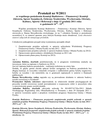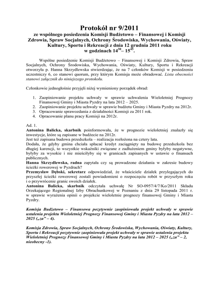Protokół nr 9/2011 ze wspólnego posiedzenia Komisji Budżetowo – Finansowej i Komisji Zdrowia, Spraw Socjalnych, Ochrony Środowiska, Wychowania, Oświaty, Kultury, Sportu i Rekreacji z dnia 12 grudnia 2011 roku w godzinach 1430– 1545. Wspólne posiedzenie Komisji Budżetowo – Finansowej i Komisji Zdrowia, Spraw Socjalnych, Ochrony Środowiska, Wychowania, Oświaty, Kultury, Sportu i Rekreacji otworzyła p. Hanna Skrzydlewska stwierdzając, że na 7 członków Komisji w posiedzeniu uczestniczy 6, co stanowi quorum, przy którym Komisja może obradować. Lista obecności stanowi załącznik do niniejszego protokołu. Członkowie jednogłośnie przyjęli niżej wymieniony porządek obrad: 1. Zaopiniowanie projektu uchwały w sprawie uchwalenia Wieloletniej Prognozy Finansowej Gminy i Miasta Pyzdry na lata 2012 – 2025. 2. Zaopiniowanie projektu uchwały w sprawie budżetu Gminy i Miasta Pyzdry na 2012r. 3. Opracowanie sprawozdania z działalności Komisji za 2011 rok. 4. Opracowanie planu pracy Komisji na 2012r. Ad. 1. Antonina Balicka, skarbnik poinformowała, że w prognozie wieloletniej znalazły się inwestycje, które są zapisane w budżecie na 2012r. Jest też zapisana budowa przedszkola – realizacja rozłożona na cztery lata. Dodała, że gdyby gmina chciała spłacać kredyt zaciągnięty na budowę przedszkola bez długiej karencji, to wszystkie wskaźniki związane z zadłużeniem gminy byłyby negatywne, byłyby za wysokie i nie mieściłyby się w granicach zapisanych w ustawie o finansach publicznych. Hanna Skrzydlewska, radna zapytała czy są prowadzone działania w zakresie budowy ścieżki rowerowej w Pyzdrach? Przemysław Dębski, sekretarz odpowiedział, że właściciele działek przylegających do przyszłej ścieżki rowerowej zostali powiadomieni o rozpoczęciu robót w przyszłym roku i o przywrócenie granic swoich działek. Antonina Balicka, skarbnik odczytała uchwałę Nr SO-0957/4/7/Ko/2011 Składu Orzekającego Regionalnej Izby Obrachunkowej w Poznaniu z dnia 29 listopada 2011 r. w sprawie wyrażenia opinii o projekcie wieloletnie prognozy finansowej Gminy i Miasta Pyzdry. Komisja Budżetowo – Finansowa pozytywnie zaopiniowała projekt uchwały w sprawie ustalenia projektu Wieloletniej Prognozy Finansowej Gminy i Miasta Pyzdry na lata 2012 – 2025 („za” – 4). Komisja Zdrowia, Spraw Socjalnych, Ochrony Środowiska, Wychowania, Oświaty, Kultury, Sportu i Rekreacji pozytywnie zaopiniowała projekt uchwały w sprawie ustalenia projektu Wieloletniej Prognozy Finansowej Gminy i Miasta Pyzdry na lata 2012 – 2025 („za” – 2, nieobecny -1). Ad. 2. Antonina Balicka, skarbnik poinformowała, że dochody z tytułu mienia będą pochodziły ze sprzedaży działek, nieruchomości położonej w m. Królewiny, z tytułu dzierżawy. W dochodach zostały zapisane wszystkie przyznane gminie dotacje, na które gmina ma już podpisane umowy. W wydatkach zapisano wszystkie wydatki związane z realizacją wszystkich zadań publicznych np. utrzymanie szkół, OSP, urzędu. Zaplanowano budowę przedszkola Marek Wardeński, radny zaproponował, aby dla nauczycieli pozostawić podwyżkę w wysokości 3,8%, a dla pracowników samorządowych zamiast 5% pozostawić 4% mając na uwadze obecną sytuację w gminie. W niektórych sąsiednich gminach podwyżki dla pracowników nie są przewidziane. Antonina Balicka, skarbnik – może w niektórych gminach na 2012r. podwyżki nie zostały zaplanowane, ale w poprzednich latach w gminach tych zwiększane były wynagrodzenia. Wynagrodzenia pracowników samorządowych w gminie Pyzdry nie są wysokie i planowany wzrost wynagrodzeń jest uzasadniony. Henryk Pyrzyk, radny zauważył, że od 1999r. fundusz na wynagrodzenia wzrósł o 100%. Krzysztof Strużyński, burmistrz odpowiedział, że fundusz płac jest wyższy, ale ile przez ten okres czasu zostało przekazanych gminie zadań do realizacji np. stypendia, akcyza. Hanna Skrzydlewska, radna stwierdziła, że inflacja wyniesie 4,5%, zatem faktyczna podwyżka wynagrodzeń wyniesie 0,5%. Następnie zapytała o dalsze losy promu w Dlusku. Przemysław Dębski, sekretarz odpowiedział, że gmina ma zezwolenie na używanie promu w Dłutku z żeglugi śródlądowej do 2013r. Gmina nie będzie dłużej utrzymywała promu. Mogą go użytkować rolnicy. Ale sami rolnicy nie są wstanie sami finansować utrzymania promu. W trakcie dyskusji poruszono kwestie dotyczące średniego wynagrodzenia pracowników samorządowych, działalności spółek wodnych działających na terenie gminy (Ruda Komorska, Ksawerów), opłacania za podopiecznych przebywających w domach pomocy społecznej. Antonina Balicka, skarbnik odczytała uchwałę Nr SO-0952/4/7/Ko/2011 Składu Orzekającego Regionalnej Izby Obrachunkowej w Poznaniu z dnia 29.11.2011r. w sprawie wyrażenia opinii o projekcie uchwały budżetowej Gminy i Miasta Pyzdry na 2012r.. Komisja Budżetowo – Finansowa pozytywnie zaopiniowała projekt uchwały w sprawie uchwalenia budżetu Gminy i Miasta Pyzdry na 2012 rok („za” – 4). Komisja Zdrowia, Spraw Socjalnych, Ochrony Środowiska, Wychowania, Oświaty, Kultury, Sportu i Rekreacji pozytywnie zaopiniowała projekt uchwały w sprawie uchwalenia budżetu Gminy i Miasta Pyzdry na 2012 rok („za” – 2, nieobecny -1). Ad. 3. Opracowano sprawozdanie z działalności Komisji za 2011 rok. Ad. 4. Opracowano plan pracy Komisji Budżetowo – Finansowej na 2012r. 1. Opiniowanie projektów uchwał i materiałów przedstawionych pod obrady Rady Miejskiej – wg potrzeb. 2. Analiza realizacji budżetu przez gminę w wybranych działach - co kwartał. 3. Wydatkowanie środków finansowych na inwestycje realizowane przez gminę w 2011r – wybiórczo, co kwartał. 4. Inne sprawy wynikłe w trakcie roku. 5. Złożenie sprawozdania z działalności Komisji – IV kwartał. 6. Opracowanie planu pracy Komisji na 2013 rok. Plan pracy Komisji Zdrowia, Spraw Socjalnych, Ochrony Środowiska, Oś