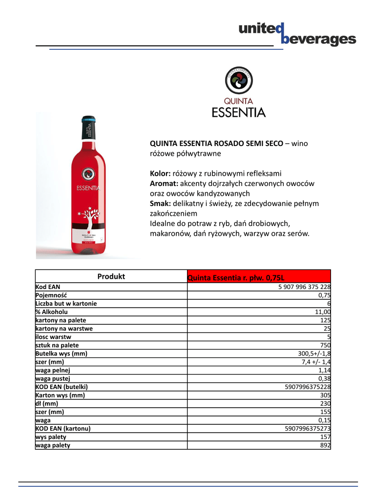QUINTA ESSENTIA ROSADO SEMI SECO – wino różowe półwytrawne Kolor: różowy z rubinowymi refleksami Aromat: akcenty dojrzałych czerwonych owoców oraz owoców kandyzowanych Smak: delikatny i świeży, ze zdecydowanie pełnym zakończeniem Idealne do potraw z ryb, dań drobiowych, makaronów, dań ryżowych, warzyw oraz serów. Produkt Kod EAN Pojemność Liczba but w kartonie % Alkoholu kartony na palete kartony na warstwe ilosc warstw sztuk na palete Butelka wys (mm) szer (mm) waga pelnej waga pustej KOD EAN (butelki) Karton wys (mm) dł (mm) szer (mm) waga KOD EAN (kartonu) wys palety waga palety Quinta Essentia r. płw. 0,75L 5 907 996 375 228 0,75 6 11,00 125 25 5 750 300,5+/-1,8 7,4 +/- 1,4 1,14 0,38 5907996375228 305 230 155 0,15 5907996375273 157 892 QUINTA ESSENTIA ROSADO SEMI DULCE – wino różowe półsłodkie Kolor: różowy z rubinowymi refleksami Aromat: akcenty dojrzałych czerwonych owoców oraz owoców kandyzowanych Smak: delikatny i świeży, ze zdecydowanie pełnym zakończeniem Idealne do potraw z ryb, dań drobiowych, makaronów, dań ryżowych, warzyw oraz serów. Produkt Kod EAN Pojemność Liczba but w kartonie % Alkoholu kartony na palete kartony na warstwe ilosc warstw sztuk na palete Butelka wys (mm) szer (mm) waga pelnej waga pustej KOD EAN (butelki) Karton wys (mm) dł (mm) szer (mm) waga KOD EAN (kartonu) wys palety waga palety Quinta Essentia r. psł 0,75L 5 907 996 375 211 0,75 6 11,00 125 25 5 750 300,5+/-1,8 7,4 +/- 1,4 1,14 0,38 5907996375211 305 230 155 0,15 5907996375280 157 892 QUINTA ESSENTIA ROSADO SECO – wino różowe wytrawne Kolor: różowy z rubinowymi refleksami Aromat: akcenty dojrzałych czerwonych owoców oraz owoców kandyzowanych Smak: delikatny i świeży, ze zdecydowanie pełnym zakończeniem Idealne do potraw z ryb, dań drobiowych, makaronów, dań ryżowych, warzyw oraz serów. Produkt Kod EAN Pojemność Liczba but w kartonie % Alkoholu kartony na palete kartony na warstwe ilosc warstw sztuk na palete Butelka wys (mm) szer (mm) waga pelnej waga pustej KOD EAN (butelki) Karton wys (mm) dł (mm) szer (mm) waga KOD EAN (kartonu) wys palety waga palety Quinta Essentia r. wytr. 0,75L 5 907 996 375 578 0,75 6 11,00 125 25 5 750 300,5+/-1,8 7,4 +/- 1,4 1,14 0,38 5907996375578 305 230 155 0,15 5907996375608 157 892