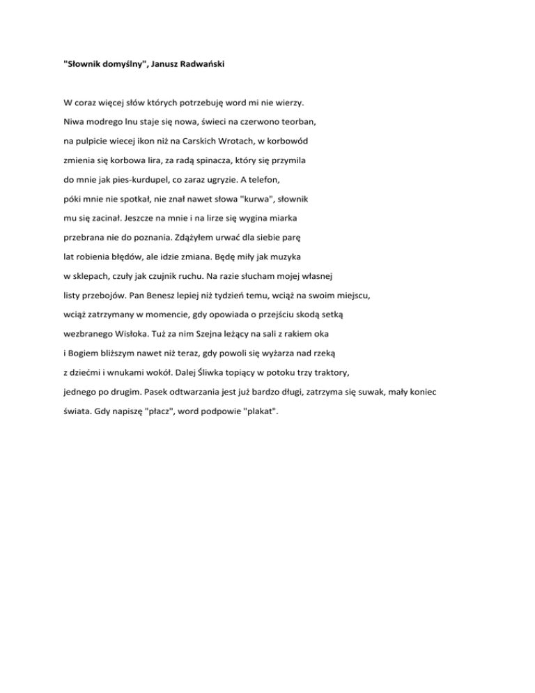 "Słownik domyślny", Janusz Radwański W coraz więcej słów których potrzebuję word mi nie wierzy. Niwa modrego lnu staje się nowa, świeci na czerwono teorban, na pulpicie wiecej ikon niż na Carskich Wrotach, w korbowód zmienia się korbowa lira, za radą spinacza, który się przymila do mnie jak pies-kurdupel, co zaraz ugryzie. A telefon, póki mnie nie spotkał, nie znał nawet słowa "kurwa", słownik mu się zacinał. Jeszcze na mnie i na lirze się wygina miarka przebrana nie do poznania. Zdążyłem urwać dla siebie parę lat robienia błędów, ale idzie zmiana. Będę miły jak muzyka w sklepach, czuły jak czujnik ruchu. Na razie słucham mojej własnej listy przebojów. Pan Benesz lepiej niż tydzień temu, wciąż na swoim miejscu, wciąż zatrzymany w momencie, gdy opowiada o przejściu skodą setką wezbranego Wisłoka. Tuż za nim Szejna leżący na sali z rakiem oka i Bogiem bliższym nawet niż teraz, gdy powoli się wyżarza nad rzeką z dziećmi i wnukami wokół. Dalej Śliwka topiący w potoku trzy traktory, jednego po drugim. Pasek odtwarzania jest już bardzo długi, zatrzyma się suwak, mały koniec świata. Gdy napiszę "płacz", word podpowie "plakat".