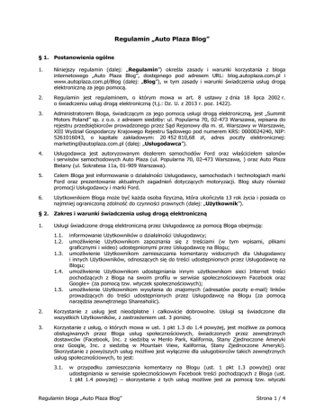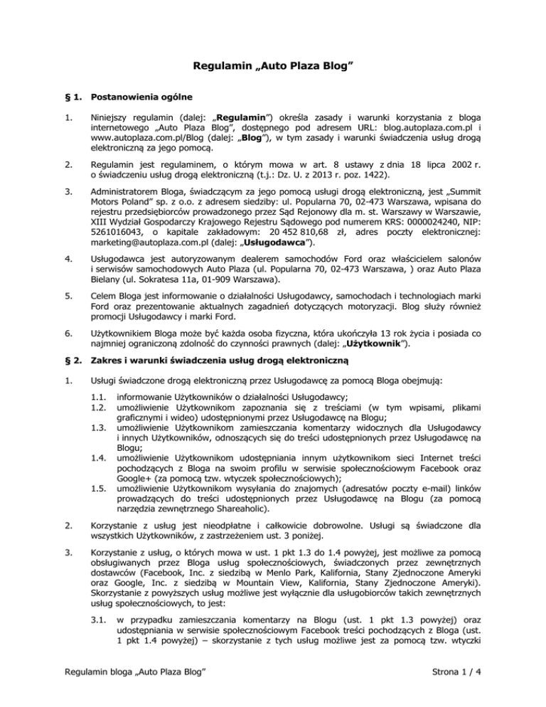 Regulamin „Auto Plaza Blog” § 1. Postanowienia ogólne 1. Niniejszy regulamin (dalej: „Regulamin”) określa zasady i warunki korzystania z bloga internetowego „Auto Plaza Blog”, dostępnego pod adresem URL: blog.autoplaza.com.pl i www.autoplaza.com.pl/Blog (dalej: „Blog”), w tym zasady i warunki świadczenia usług drogą elektroniczną za jego pomocą. 2. Regulamin jest regulaminem, o którym mowa w art. 8 ustawy z dnia 18 lipca 2002 r. o świadczeniu usług drogą elektroniczną (t.j.: Dz. U. z 2013 r. poz. 1422). 3. Administratorem Bloga, świadczącym za jego pomocą usługi drogą elektroniczną, jest „Summit Motors Poland” sp. z o.o. z adresem siedziby: ul. Popularna 70, 02-473 Warszawa, wpisana do rejestru przedsiębiorców prowadzonego przez Sąd Rejonowy dla m. st. Warszawy w Warszawie, XIII Wydział Gospodarczy Krajowego Rejestru Sądowego pod numerem KRS: 0000024240, NIP: 5261016043, o kapitale zakładowym: 20 452 810,68 zł, adres poczty elektronicznej: [email protected] (dalej: „Usługodawca”). 4. Usługodawca jest autoryzowanym dealerem samochodów Ford oraz właścicielem salonów i serwisów samochodowych Auto Plaza (ul. Popularna 70, 02-473 Warszawa, ) oraz Auto Plaza Bielany (ul. Sokratesa 11a, 01-909 Warszawa). 5. Celem Bloga jest informowanie o działalności Usługodawcy, samochodach i technologiach marki Ford oraz prezentowanie aktualnych zagadnień dotyczących motoryzacji. Blog służy również promocji Usługodawcy i marki Ford. 6. Użytkownikiem Bloga może być każda osoba fizyczna, która ukończyła 13 rok życia i posiada co najmniej ograniczoną zdolność do czynności prawnych (dalej: „Użytkownik”). § 2. Zakres i warunki świadczenia usług drogą elektroniczną 1. Usługi świadczone drogą elektroniczną przez Usługodawcę za pomocą Bloga obejmują: 1.1. 1.2. 1.3. 1.4. 1.5. informowanie Użytkowników o działalności Usługodawcy; umożliwienie Użytkownikom zapoznania się z treściami (w tym wpisami, plikami graficznymi i wideo) udostępnionymi przez Usługodawcę na Blogu; umożliwienie Użytkownikom zamieszczania komentarzy widocznych dla Usługodawcy i innych Użytkowników, odnoszących się do treści udostępnionych przez Usługodawcę na Blogu; umożliwienie Użytkownikom udostępniania innym użytkownikom sieci Internet treści pochodzących z Bloga na swoim profilu w serwisie społecznościowym Facebook oraz Google+ (za pomocą tzw. wtyczek społecznościowych); umożliwienie Użytkownikom wysyłania do znajomych (adresatów poczty e-mail) linków prowadzących do treści udostępnionych przez Usługodawcę na Blogu (za pomocą narzędzia zewnętrznego Shareaholic). 2. Korzystanie z usług jest nieodpłatne i całkowicie dobrowolne. Usługi są świadczone dla wszystkich Użytkowników, z zastrzeżeniem ust. 3 poniżej. 3. Korzystanie z usług, o których mowa w ust. 1 pkt 1.3 do 1.4 powyżej, jest możliwe za pomocą obsługiwanych przez Bloga usług społecznościowych, świadczonych przez zewnętrznych dostawców (Facebook, Inc. z siedzibą w Menlo Park, Kalifornia, Stany Zjednoczone Ameryki oraz Google, Inc. z siedzibą w Mountain View, Kalifornia, Stany Zjednoczone Ameryki). Skorzystanie z powyższych usług możliwe jest wyłącznie dla usługobiorców takich zewnętrznych usług społecznościowych, to jest: 3.1. w przypadku zamieszczania komentarzy na Blogu (ust. 1 pkt 1.3 powyżej) oraz udostępniania w serwisie społecznościowym Facebook treści pochodzących z Bloga (ust. 1 pkt 1.4 powyżej) – skorzystanie z tych usług możliwe jest za pomocą tzw. wtyczki Regulamin bloga „Auto Plaza Blog” Strona 1 / 4 3.2. społecznościowej Facebook, po zalogowaniu się Użytkownika do jego konta w serwisie społecznościowym Facebook; w przypadku udostępniania w serwisie społecznościowym Google+ treści pochodzących z Bloga (ust. 1 pkt 1.4 powyżej) – skorzystanie z tej usługi możliwe jest za pomocą tzw. wtyczki społecznościowej Google+, po zalogowaniu się Użytkownika do jego konta w usługach Google. 4. Skorzystanie z usługi, o której mowa w ust. 1 pkt 1.5 powyżej, jest możliwe po zalogowaniu Użytkownika do jego konta poczty elektronicznej. 5. Organizator informuje, że w przypadku zamieszczenia przez Użytkownika komentarza na Blogu, dla innych Użytkowników widoczna jest nazwa profilu tego Użytkownika w serwisie społecznościowym Facebook. 6. Wpisy publikowane przez Usługodawcę na Blogu, w tym zawarte w nich treści i porady, stanowią jedynie opinie i mogą mieć charakter promocyjny. Wpisy na Blogu przygotowywane są z należytą starannością, nie stanowią jednak porady z zakresu motoryzacji, mechaniki, elektromechaniki lub diagnostyki pojazdowej, ani nie mogą zastąpić wizyty w profesjonalnym salonie lub serwisie samochodowym. 7. Na Blogu dostępne są linki do innych serwisów internetowych Usługodawcy. Zasady korzystania z tych serwisów i usług świadczonych drogą elektroniczną za ich pomocą określają odrębne regulaminy, dostępne w tych serwisach. 8. Warunkiem technicznym prawidłowego funkcjonowania Bloga jest korzystanie przez Użytkownika z komputera osobistego (PC) z dostępem do sieci Internet, wyposażonego w jedną z popularnych przeglądarek internetowych w aktualnej wersji (Google Chrome, Internet Explorer, Mozilla Firefox, Opera, Safari), z włączoną obsługą JavaScript oraz z zainstalowaną wtyczką Adobe Flash Player w aktualnej wersji. Zalecana rozdzielczość ekranu to co najmniej 1024 na 768 pikseli. § 3. Treści bezprawne 1. Zabronione jest dostarczanie przez Użytkowników treści bezprawnych, stanowiących naruszenie prawa lub dobrych obyczajów, a w szczególności zamieszczanie na Blogu treści: 1.1. 1.2. 1.3. 1.4. 1.5. 1.6. 1.7. 1.8. obscenicznych lub wulgarnych; nawołujących do nienawiści, w szczególności ze względu na rasę, płeć, narodowość, pochodzenie etniczne, przynależność państwową, orientację seksualną, obr