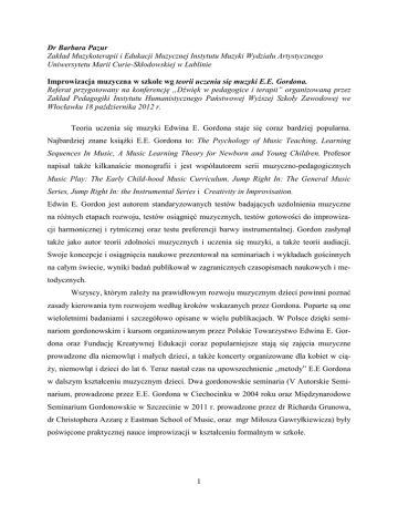Dr Barbara Pazur Zakład Muzykoterapii i Edukacji Muzycznej Instytutu Muzyki Wydziału Artystycznego Uniwersytetu Marii Curie-Skłodowskiej w Lublinie Improwizacja muzyczna w szkole wg teorii uczenia się muzyki E.E. Gordona. Referat przygotowany na konferencję „Dźwięk w pedagogice i terapii” organizowaną przez Zakład Pedagogiki Instytutu Humanistycznego Państwowej Wyższej Szkoły Zawodowej we Włocławku 18 października 2012 r. Teoria uczenia się muzyki Edwina E. Gordona staje się coraz bardziej popularna. Najbardziej znane książki E.E. Gordona to: The Psychology of Music Teaching, Learning Sequences In Music, A Music Learning Theory for Newborn and Young Children. Profesor napisał także kilkanaście monografii i jest współautorem serii muzyczno-pedagogicznych Music Play: The Early Child-hood Music Curriculum, Jump Right In: The General Music Series, Jump Right In: the Instrumental Series i Creativity in Improvisation. Edwin E. Gordon jest autorem standaryzowanych testów badających uzdolnienia muzyczne na różnych etapach rozwoju, testów osiągnięć muzycznych, testów gotowości do improwizacji harmonicznej i rytmicznej oraz testu preferencji barwy instrumentalnej. Gordon zasłynął także jako autor teorii zdolności muzycznych i uczenia się muzyki, a także teorii audiacji. Swoje koncepcje i osiągnięcia naukowe prezentował na seminariach i wykładach gościnnych na całym świecie, wyniki badań publikował w zagranicznych czasopismach naukowych i metodycznych. Wszyscy, którym zależy na prawidłowym rozwoju muzycznym dzieci powinni poznać zasady kierowania tym rozwojem według kroków wskazanych przez Gordona. Poparte są one wieloletnimi badaniami i szczegółowo opisane w wielu publikacjach. W Polsce dzięki seminariom gordonowskim i kursom organizowanym przez Polskie Towarzystwo Edwina E. Gordona oraz Fundację Kreatywnej Edukacji coraz popularniejsze stają się zajęcia muzyczne prowadzone dla niemowląt i małych dzieci, a także koncerty organizowane dla kobiet w ciąży, niemowląt i dzieci do lat 6. Teraz nastał czas na upowszechnienie „metody” E.E Gordona w dalszym kształceniu muzycznym dzieci. Dwa gordonowskie seminaria (V Autorskie Seminarium, prowadzone przez E.E. Gordona w Ciechocinku w 2004 roku oraz Międzynarodowe Seminarium Gordonowskie w Szczecinie w 2011 r. prowadzone przez dr Richarda Grunowa, dr Christophera Azzarę z Eastman School of Music, oraz mgr Miłosza Gawryłkiewicza) były poświęcone praktycznej nauce improwizacji w kształceniu formalnym w szkole. 1 Krótko o teorii uczenia się muzyki E.E. Gordona Podstawą teorii uczenia się muzyki Edwina E. Gordona jest przeświadczenie poparte wieloletnimi badaniami, że uzdolnienie muzyczne jest cechą wrodzoną. Zdolności są rozłożone zgodnie z rozkładem normatywnym ludzi, którzy się rodzą. 1/6 populacji ma zdolności niskie, 1/6 – wysokie, a 2/3 ma zdolności średnie. Każde dziecko rodzi się z określonym poziomem zdolności i wymaga przyjaznego środowiska, aby je rozwinąć. Odpowiednie środowisko wywiera olbrzymi wpływ na zdolności muzyczne. Edwin E. Gordon na podstawie wieloletnich badań stworzył testy, za pomocą których badać można uzdolnienia lub osiągnięcia dzieci w różnym wieku, na różnym poziomie uzdolnień rozwijających lub ustabilizowanych. Dzięki temu można podejść indywidualnie do każdego dziecka i kształcić dziecko muzycznie według jego indywidualnych możliwości i potrzeb. Edwin Gordon stworzył termin „audiacja”, który oznacza zdolność do słyszenia i rozumienia muzyki bez fizycznie obecnego brzmienia. Jeżeli słyszy się dźwięki i rozumie ich wewnętrzny sens – audiuje się. Audiacja jest tym dla muzyki, czym myślenie dla mowy. Jest wiele typów audiacji – tonalna, rytmiczna, harmoniczna. Niektórzy sobie lepiej radzą z jednym, inni z innym typem audiacji. Audiacja to nie tylko słyszenie, powtórzenie, czyli zaśpiewanie, ale także zrozumienie muzyki. Możemy to porównać do procesu rozumienia np. słowa „pies” . Jesteśmy w stanie nauczyć dziecko pisać np. po francusku słowo „pies”, ale jeśli ono nie zna francuskiego, nie zrozumie tego słowa i będzie ono dla niego tylko zlepkiem liter. Aby zrozumieć to słowo – dziecko musi się osłuchać z językiem, poznać znaczenie poszczególnych wyrazów (także słowa „pies”), wyłowi wtedy znany już wyraz spośród innych. Nauczy się wtedy także mówić, czytać i pisać – myśleć w danym języku. Audiacja to nie tylko słyszenie i powtórzenie, audiacja jest to myślenie muzyczne. Często przy nauce muzyki zachodzi zapamiętywanie, a nie przypisywanie znaczeń. Notacja muzyczna nie niesie za sobą żadnego znaczenia – ona pomaga zapamiętać to, co wcześniej było audiowane. Rozwój muzyczny Edwin E. Gordon porównuje do rozwoju mowy, a prawidłową naukę muzyki do nauki mówienia. Najpierw uczymy się słuchania – małe dziecko co najmniej rok słucha, ale samo nie mówi. Uczy się wtedy rozumieć kulturę, w której żyje. Jest to bardzo ważny okres w życiu. Słuch jest wtedy bardzo wrażliwy. Jeśli będzie się dziecku dużo mówiło, wiele czytało, takie dziecko będzie w przyszłości miało bogaty zasób słów, łatwość wypowiadania i myślenia. To samo dzieje się z muzyką. Im więcej dziecko będzie słuchało różnorodnej muzyki, różnych piosenek, tym łatwiej będzie się uczyć w przyszłości. Następnym etapem rozwoju jest mówienie, kiedy uczymy się wypowiadać to, co już wcześniej nauczyliśmy się słuchać. Jeśli dziecko wypowiada pewne słowo – wypowiada je w kontekście pewne2 go zdania, ale zwykle zaczyna się mówienie od wypowiadania pojedynczych słów. Większość nauczycieli uczy i prosi dzieci, aby śpiewały gotowe piosenki, aby sprawić przyjemność rodzicom, albo dostarczyć rozrywki dzieciom. Można to w nauce mowy porównać do żądania, aby małe dziecko zaczęło mówi
