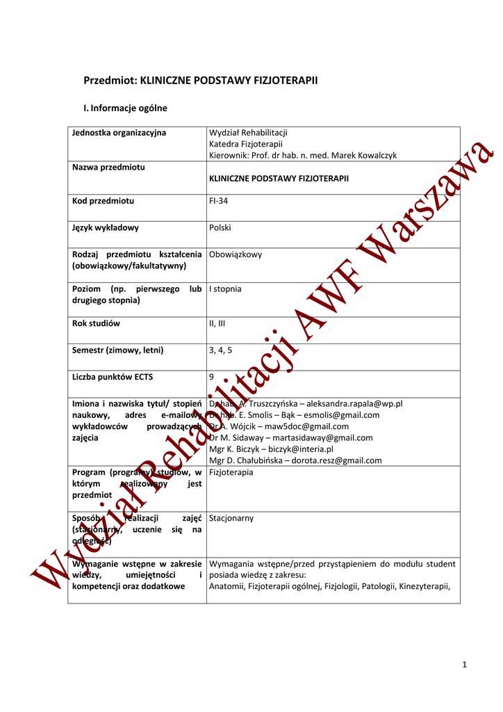 Przedmiot: KLINICZNE PODSTAWY FIZJOTERAPII I. Informacje ogólne Jednostka organizacyjna Wydział Rehabilitacji Katedra Fizjoterapii Kierownik: Prof. dr hab. n. med. Marek Kowalczyk Nazwa przedmiotu KLINICZNE PODSTAWY FIZJOTERAPII Kod przedmiotu FI-34 Język wykładowy Polski Rodzaj przedmiotu kształcenia Obowiązkowy (obowiązkowy/fakultatywny) Poziom (np. pierwszego drugiego stopnia) lub I stopnia Rok studiów II, III Semestr (zimowy, letni) 3, 4, 5 Liczba punktów ECTS 9 Imiona i nazwiska tytuł/ stopień naukowy, adres e-mailowy wykładowców prowadzących zajęcia Dr hab. A. Truszczyńska – [email protected] Dr hab. E. Smolis – Bąk – [email protected] Dr A. Wójcik – [email protected] Dr M. Sidaway – [email protected] Mgr K. Biczyk – [email protected] Mgr D. Chałubińska – [email protected] Program (programy) studiów, w Fizjoterapia którym realizowany jest przedmiot Sposób realizacji (stacjonarny, uczenie odległość) się zajęć Stacjonarny na Wymaganie wstępne w zakresie Wymagania wstępne/przed przystąpieniem do modułu student wiedzy, umiejętności i posiada wiedzę z zakresu: kompetencji oraz dodatkowe Anatomii, Fizjoterapii ogólnej, Fizjologii, Patologii, Kinezyterapii, 1 II. Informacje szczegółowe Cele przedmiotu C1 C2 Przedstawienie studentom informacji z zakresu etiologii i patogenezy wybranych schorzeń narządu ruchu oraz chorób wewnętrznych - z zakresu ortopedii, neurologii, reumatologii, kardiologii, pulmonologii, onkologii, geriatrii, itp., Zapoznanie studenta z podstawami diagnostyki klinicznej w obszarze wybranych schorzeń narządu ruchu oraz chorób wewnętrznych - z zakresu ortopedii, neurologii, reumatologii, kardiologii, pulmonologii, onkologii, geriatrii, itp., Efekty kształcenia w zakresie wiedzy, umiejętności i kompetencji społecznych dla przedmiotu Efekt kształcenia Treść efektu kształcenia dla przedmiotu Odniesienie Odniesienie kierunkowy do celów do efektów obszarowych Wiedza K-W02 ma wiedzę na temat budowy mikroskopowej oraz właściwości i funkcji komórek, tkanek i narządów człowieka, jego budowy anatomicznej, funkcjonowania układów i narządów oraz podstawowej oceny stanu zdrowia, występujących patologii oraz niepełnosprawności. K_W06 zna metody oceny stanu narządu ruchu człowieka dla wyjaśnienia zaburzeń ich struktury i funkcji K_W07 zna metody oceny zaburzeń strukturalnych i funkcjonalnych wywołanych chorobą lub urazem oraz podstawowe reakcje człowieka na chorobę i C1, C2 M1P-W02, M1P_W03, C1, C2, M1P_W03 C1, C2 M1P_W03, M1P_W04 1. Posiada podstawową wiedzę na temat budowy mikroskopowej oraz właściwości i funkcji komórek, tkanek i narządów człowieka, jego budowy anatomicznej, funkcjonowania układów i narządów, 2. Posiada podstawową wiedza na temat oceny stanu zdrowia, występujących patologii oraz niepełnosprawności. 1. Zna podstawowe metody badania klinicznego niezbędne do oceny pacjenta w obszarze wybranych schorzeń narządu ruchu oraz chorób wewnętrznych - z zakresu ortopedii, neurologii, reumatologii, kardiologii, pulmonologii, onkologii, geriatrii, itp., 2. Zna mechanizmy powstawania i przebiegu choroby i ich wpływ na zaburzenie funkcji u pacjenta 1. Posiada podstawową wiedzę na temat metod oceny zaburzeń strukturalnych i funkcjonalnych wywołanych chorobą lub urazem 2. Posiada podstawową wiedzę na temat podstawowych reakcji człowieka na chorobę i ból w zakresie niezbędnym dla fizjoterapii 2 ból w zakresie niezbędnym dla fizjoterapii K_W08 zna metody opisu i interpretacji podstawowych jednostek i zespołów chorobowych w stopniu umożliwiającym racjonalne stosowanie środków fizjoterapii i planowanie procesu rehabilitacji 1. Zna narzędzia stosowane w diagnostyce C1, C2 pacjenta ze schorzeniami o różnym podłożu 2. Zna zasady dotyczące badania podmiotowego, przedmiotowego i dodatkowych dla potrzeb fizjoterapii 3. Zna metody opisu i interpretacji danych związanych z różnymi schorzeniami, w których ma zastosowanie fizjoterapia. 4. Analizuje i interpretuje dane związane z chorobą jako podstawą do planowania procesu rehabilitacji. M1P_W03, M1P_W01 Umiejętności K_U03 potrafi rozpoznać podstawowe objawy patologiczne zachodzące w przebiegu schorzeń i urazów oraz przeprowadzić testy funkcjonalne 1. Student posiada umiejętność interpretowania wyników diagnostyczny w wybranych jednostkach chorobowych z zakresu medycyny klinicznej w zakresie niezbędnym dla fizjoterapii. 2.Potrafi rozpoznać podstawowe objawy patologiczne związane ze schorzeniami, w których ma zastosowanie fizjoterapia. C1, C2 M1P_U04, M1P_U05 K_U07 potrafi komunikować się i pracować w zespole interdyscyplinarnym zapewniającym ciągłość opieki oraz komunikować się z pacjentem i jego rodziną K_U11 potrafi przeprowadzić i interpretować badania i testy funkcjonalne niezbędne dla doboru środków fizjoterapii, wykonywania zabiegów i stosowania podstawowych metod terapeutycznych 1.Posiada umiejętność komunikowania się z pacjentem i jego rodziną. 2. Posiada umiejętność komunikowania się w zespole interdyscyplinarnym. C1, C2, M1P_U03 C1, C2 M1P_U05 K_K01 rozumie potrzebę uczenia się przez całe życie 1. Rozumie potrzebę uczenia się przez całe życie ze względu na stały rozwój medycy i fizjoterapii. 2.Rozumie, że brak wiedzy z zakresu C1, C2 M1P_K01 1.Potrafi wytłumaczyć mechanizmy występowania objawów patologicznych u pacjentów z różnymi schorzeniami, w których ma zastosowanie fizjoterapia Kompetencje społeczne 3 nowoczesnej fizjoterapii może powodować ograniczenia w efektywności rehabilitacji K_K02 potrafi określić zakres swoich kompetencji zawodowych i rozumie konieczność współpracy ze specjalistami o innych kompetencjach zawodowych oraz z przedstawicielami innych zawodów C1, C2 M1P_K02 1 Rozumie potrzebę konsultacji się z innymi specjalistami 2. Rozumie potrzebę współpracy w zespole rehabilitacyjnym 3. Rozumie, że dla